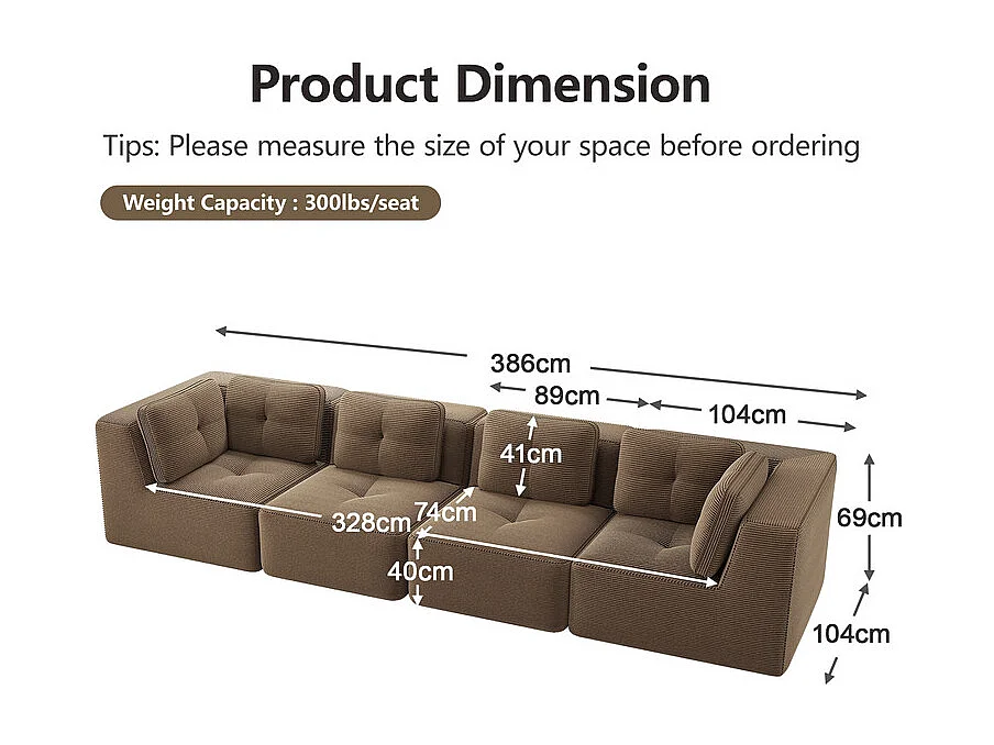 Canapé 4 places modulable, avec 6 coussins, en velours côtelé, 386x104x69cm, Marron