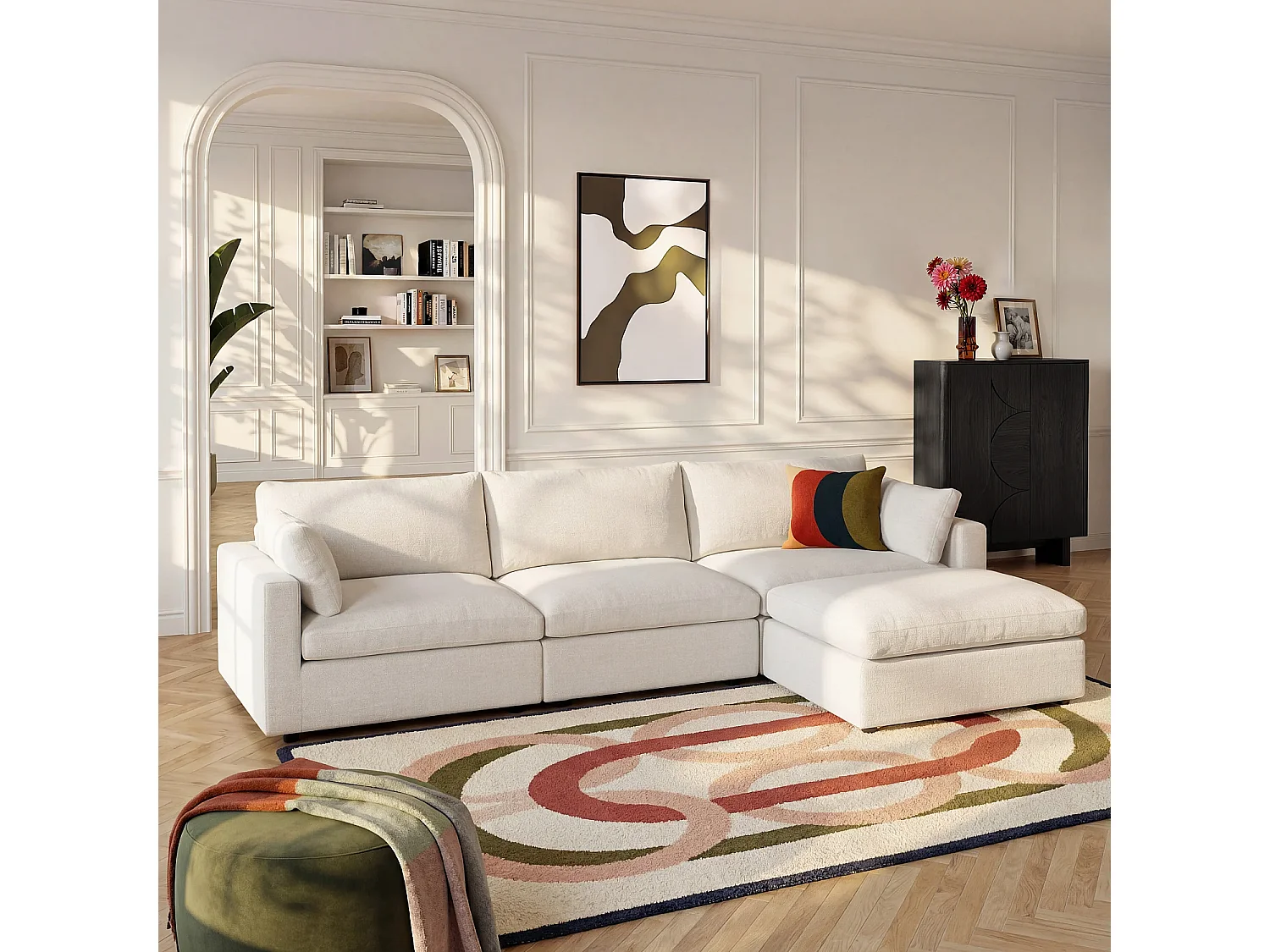 Canapé 4 places modulable avec repose pieds en tissu - Ivoire