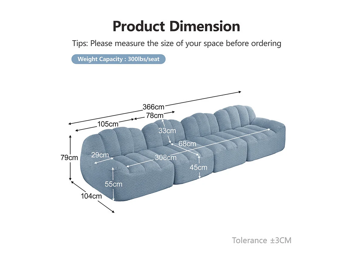 Canapé 4 places modulable en velours côtelé, ergonomique, sans assemblage, 366x104x79cm, Bleu