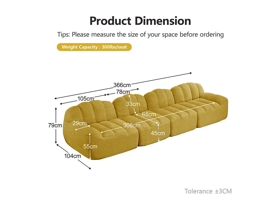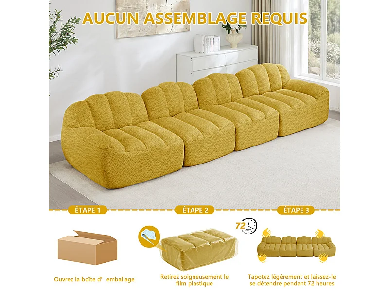 Canapé 4 places modulable en velours côtelé, ergonomique, sans assemblage, 366x104x79cm, Jaune