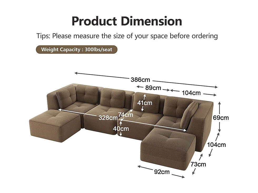 Canapé 4 places panoramique modulable, en velours côtelé, avec 2 pouf, 386x177x69cm, Marron