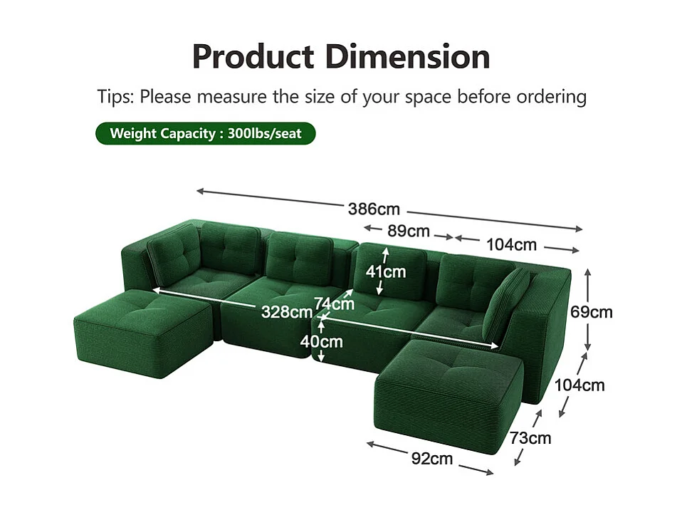 Canapé 4 places panoramique modulable, en velours côtelé, avec 2 pouf, 386x177x69cm, Vert