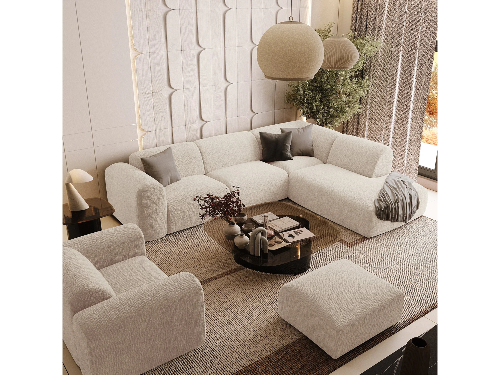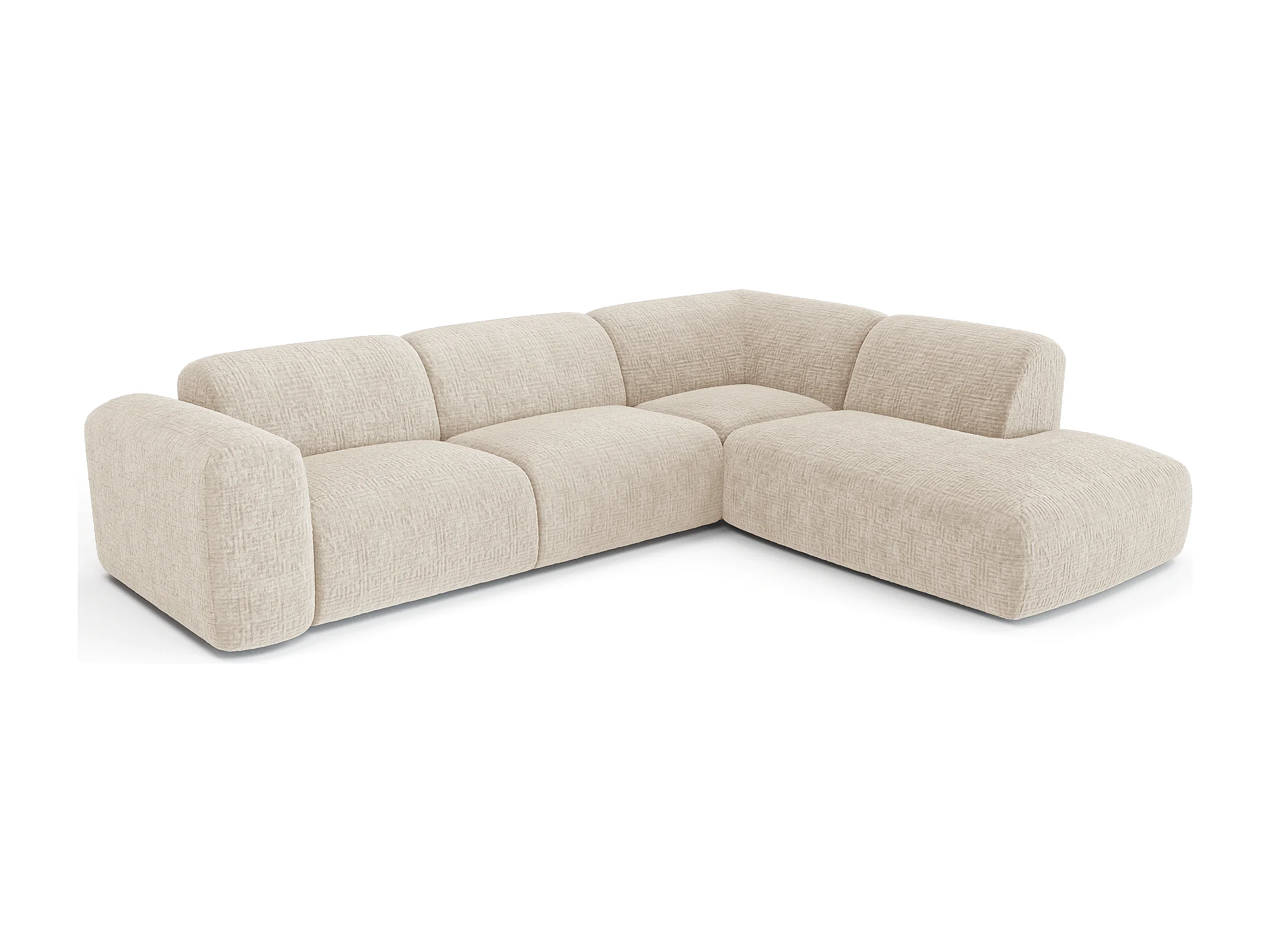 Canapé 5 places grand angle droit velours à motifs crème MYRA