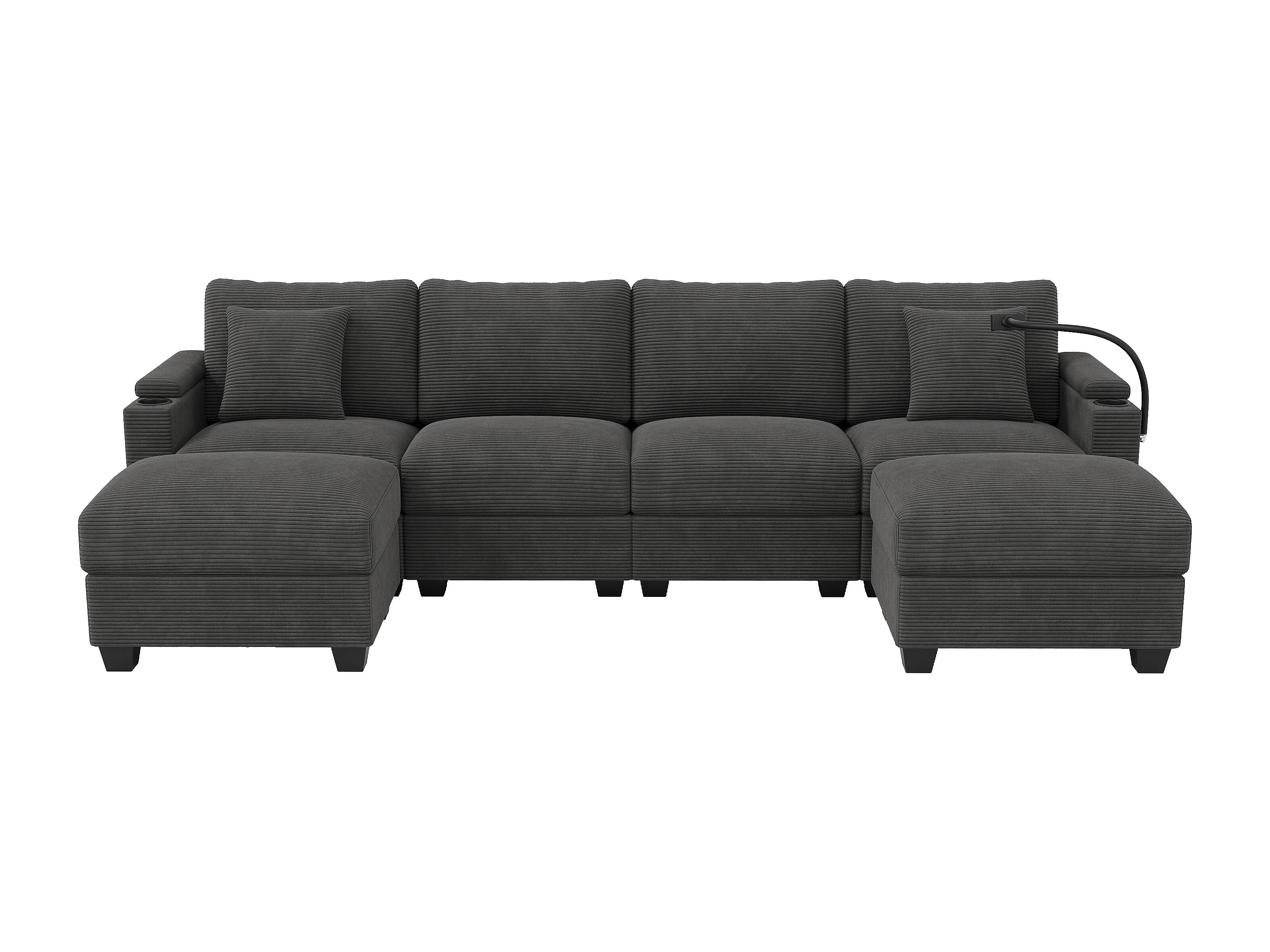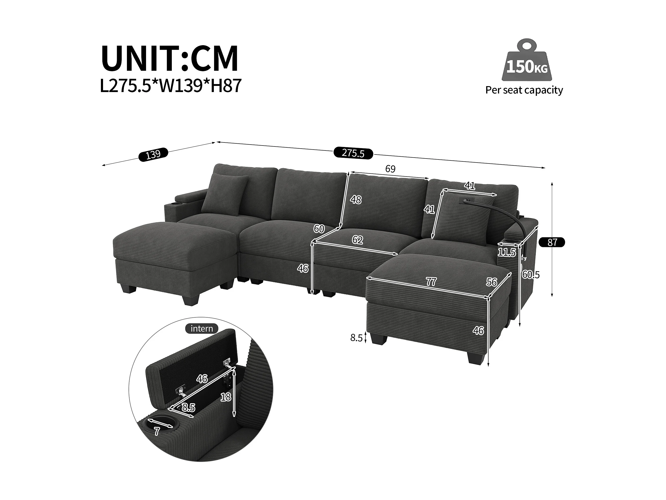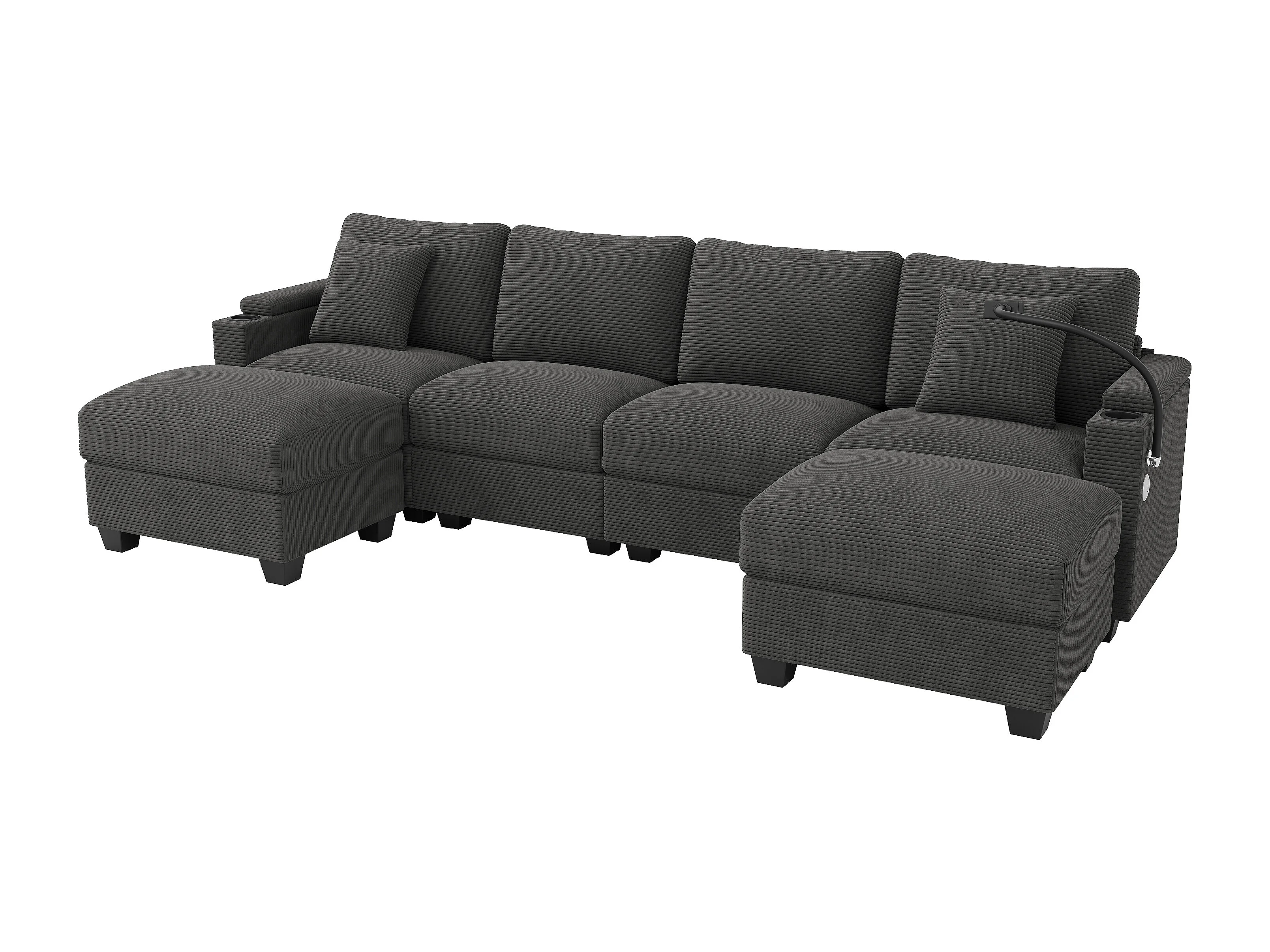 Canapé 6 places avec 2 poufs et rangement - Velours côtelé gris