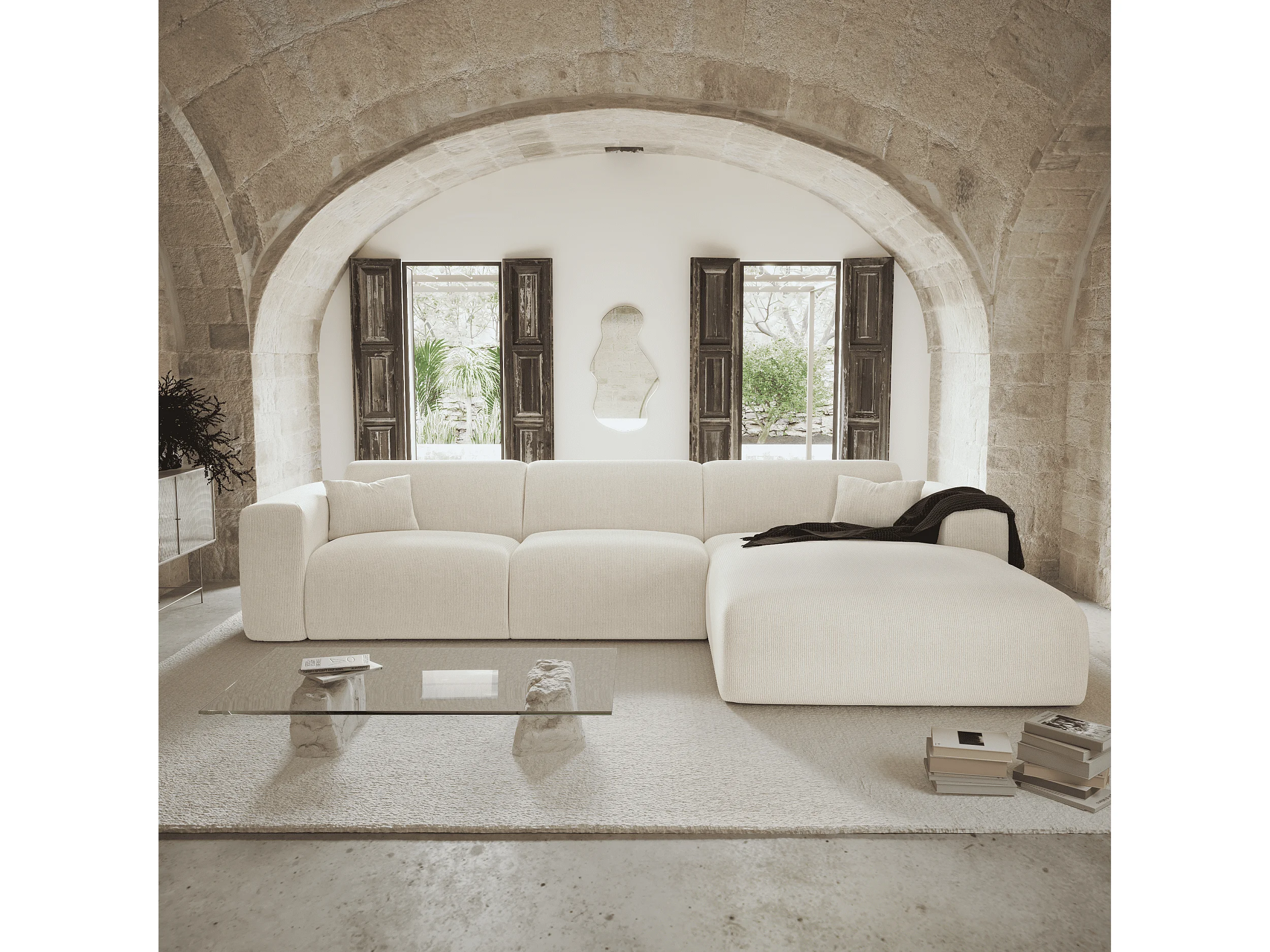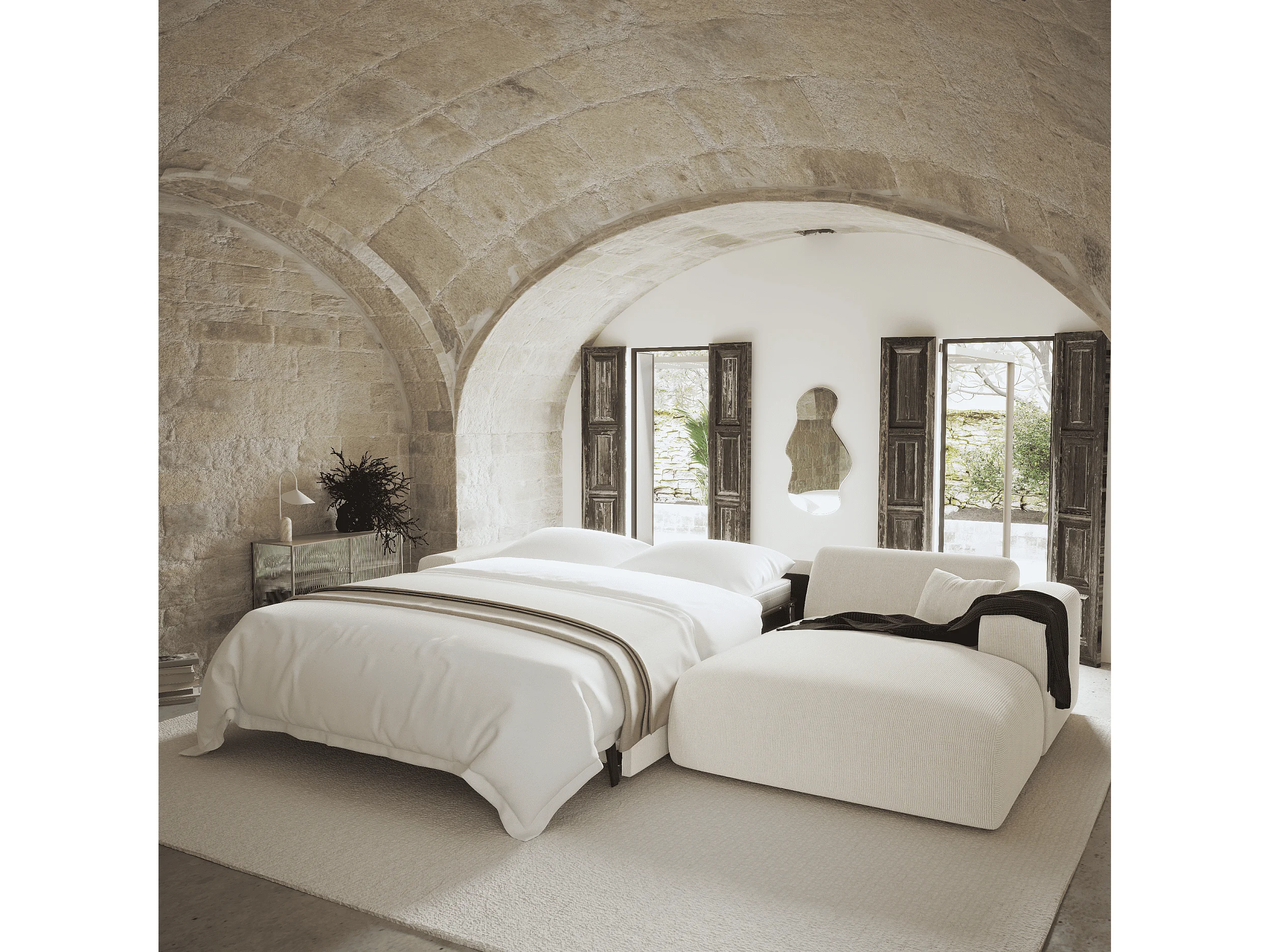 Canapé angle droit convertible dunlopillo velours côtelé crème 140cm MYRA