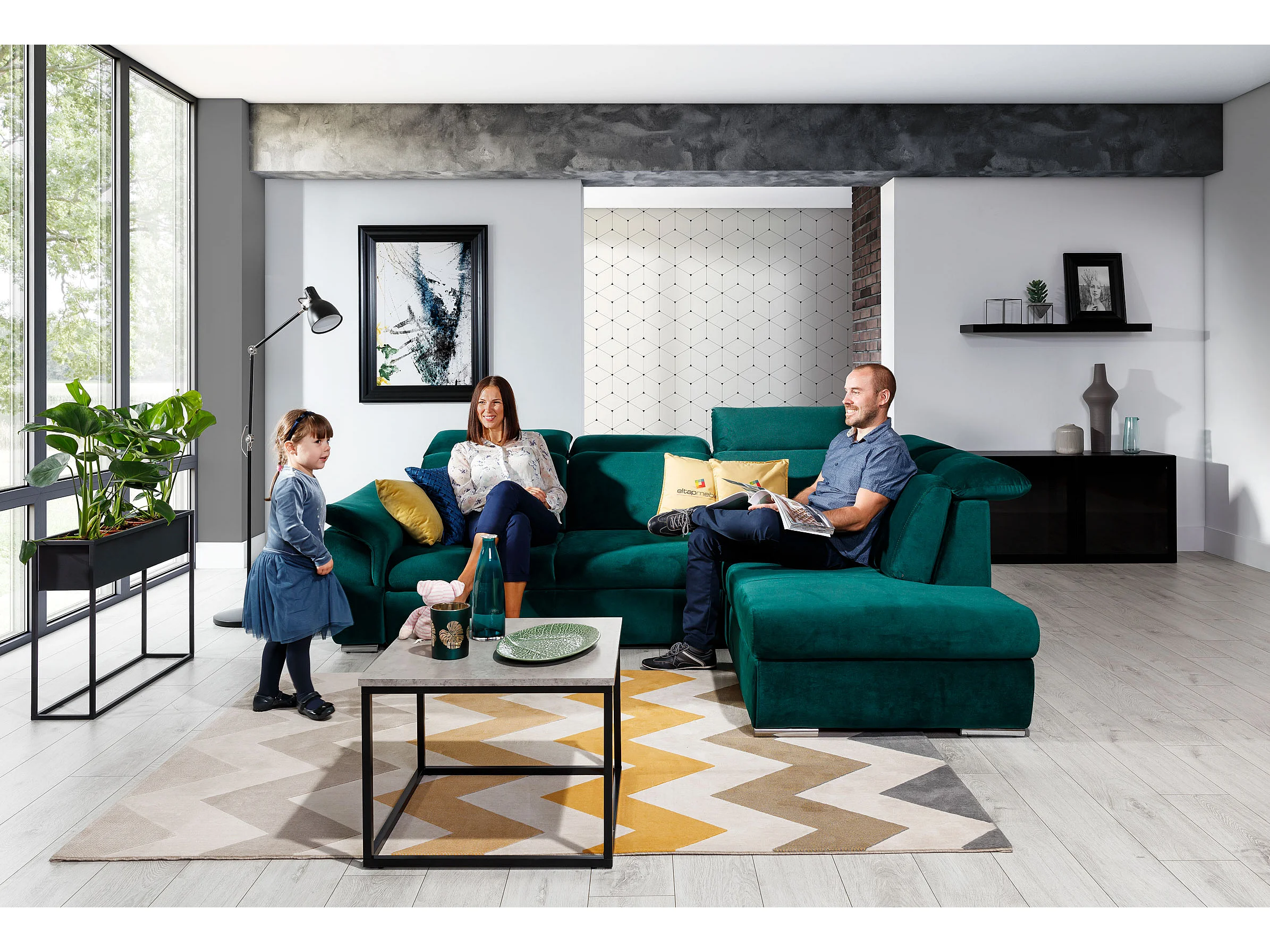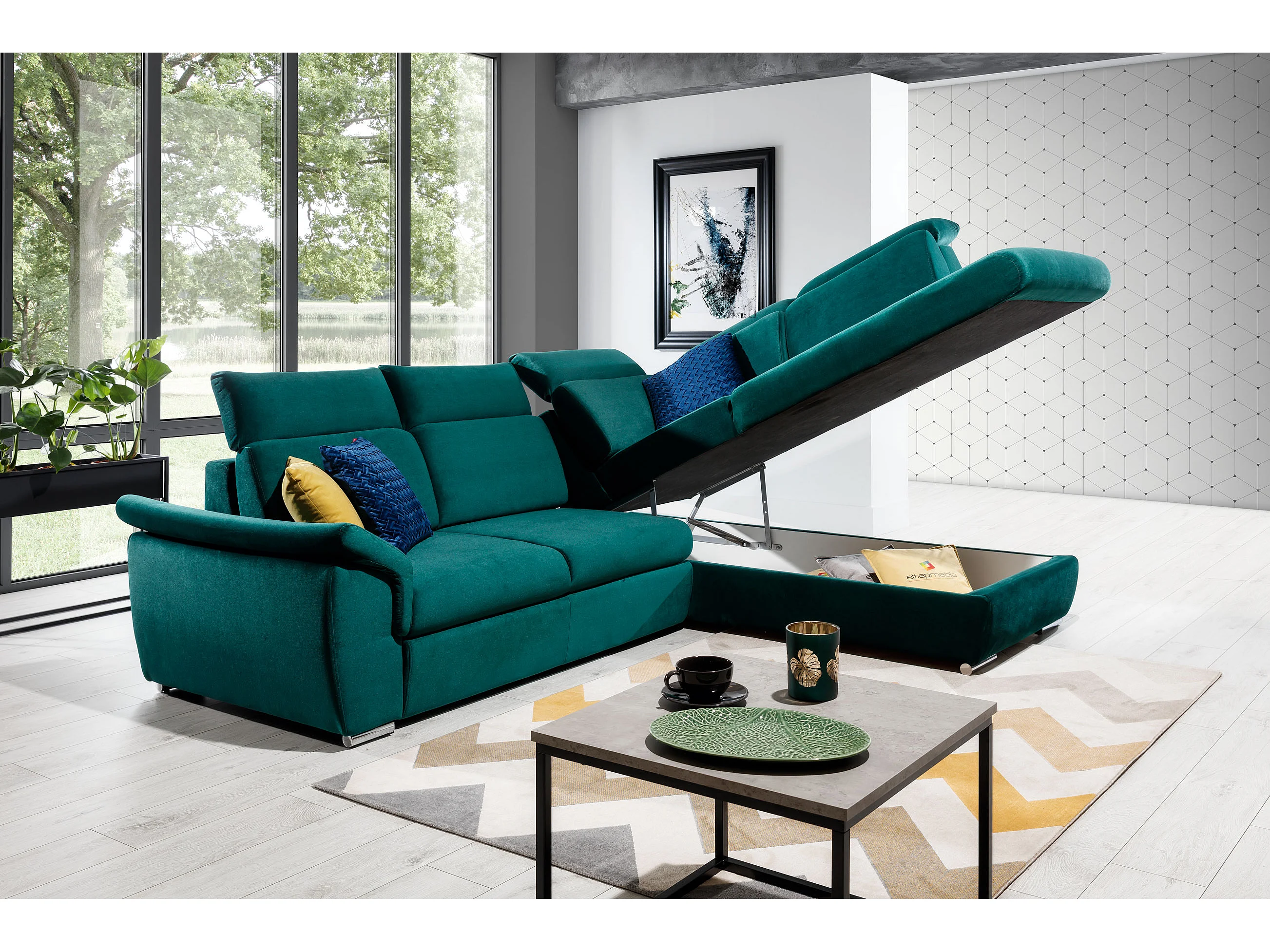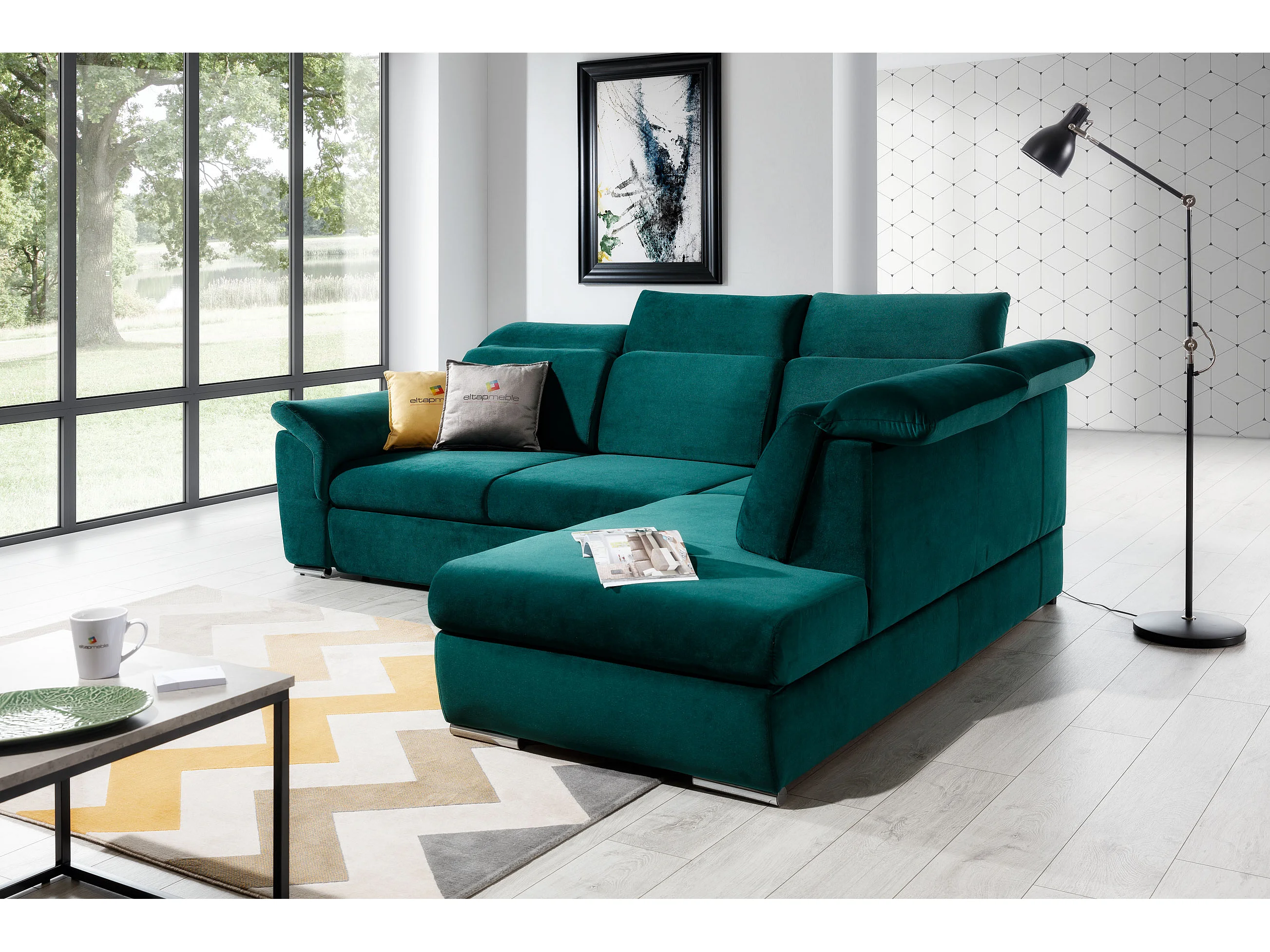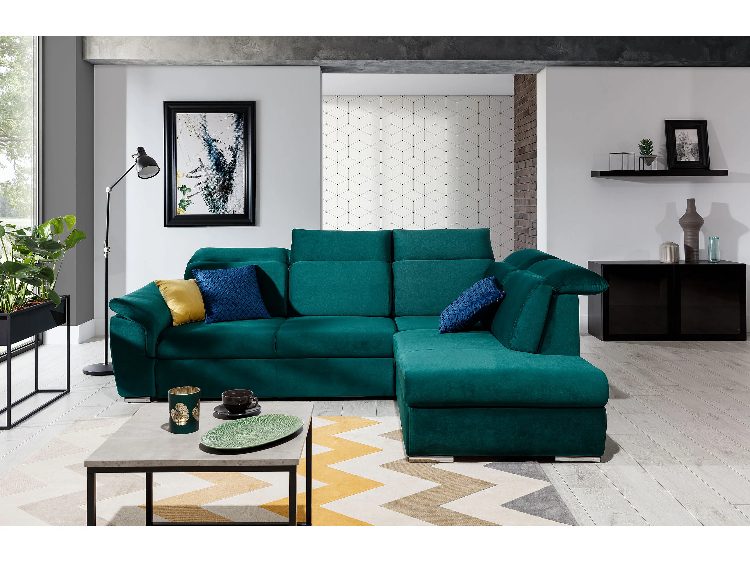 Canapé angle droit convertible tissu gris foncé et simili blanc avec appuis-tête réglables Kepita 260cm
