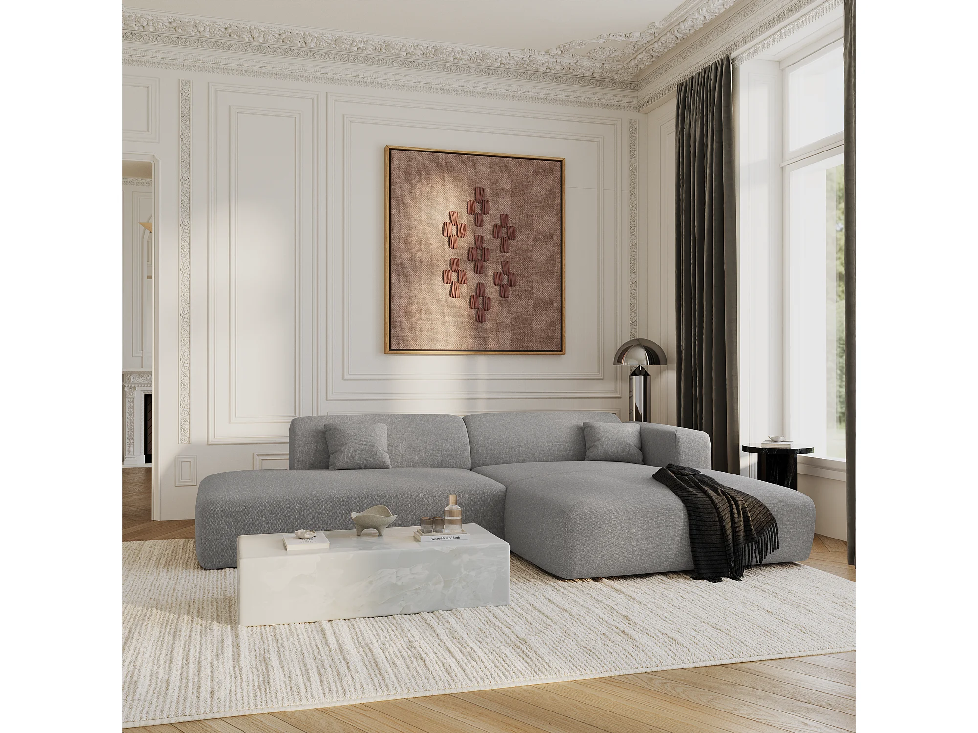 Canapé angle droit ouvert tissu tramé gris clair 5 places MYRA