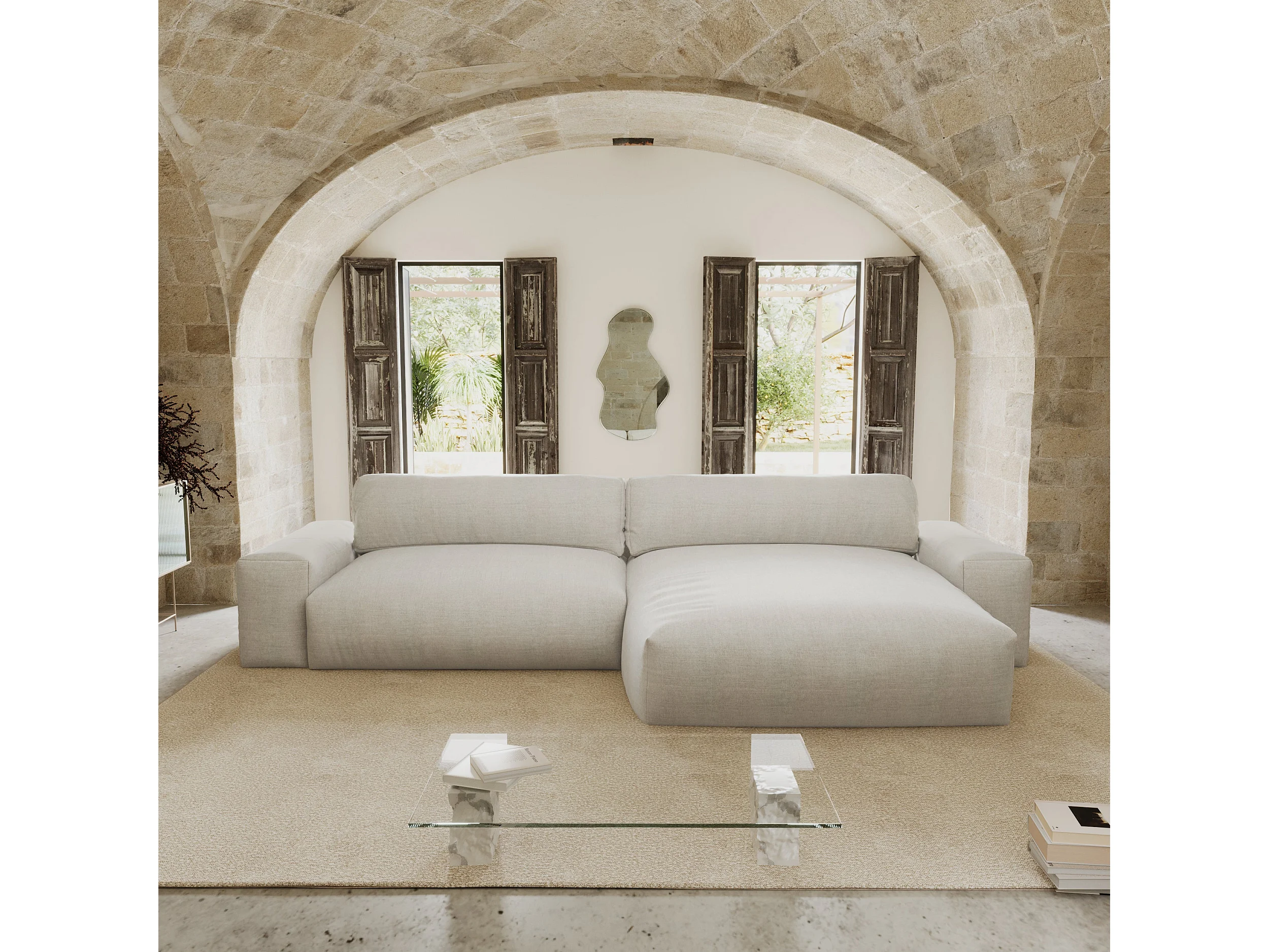 Canapé angle droit 4 places tissu tramé toucher doux beige 310cm
