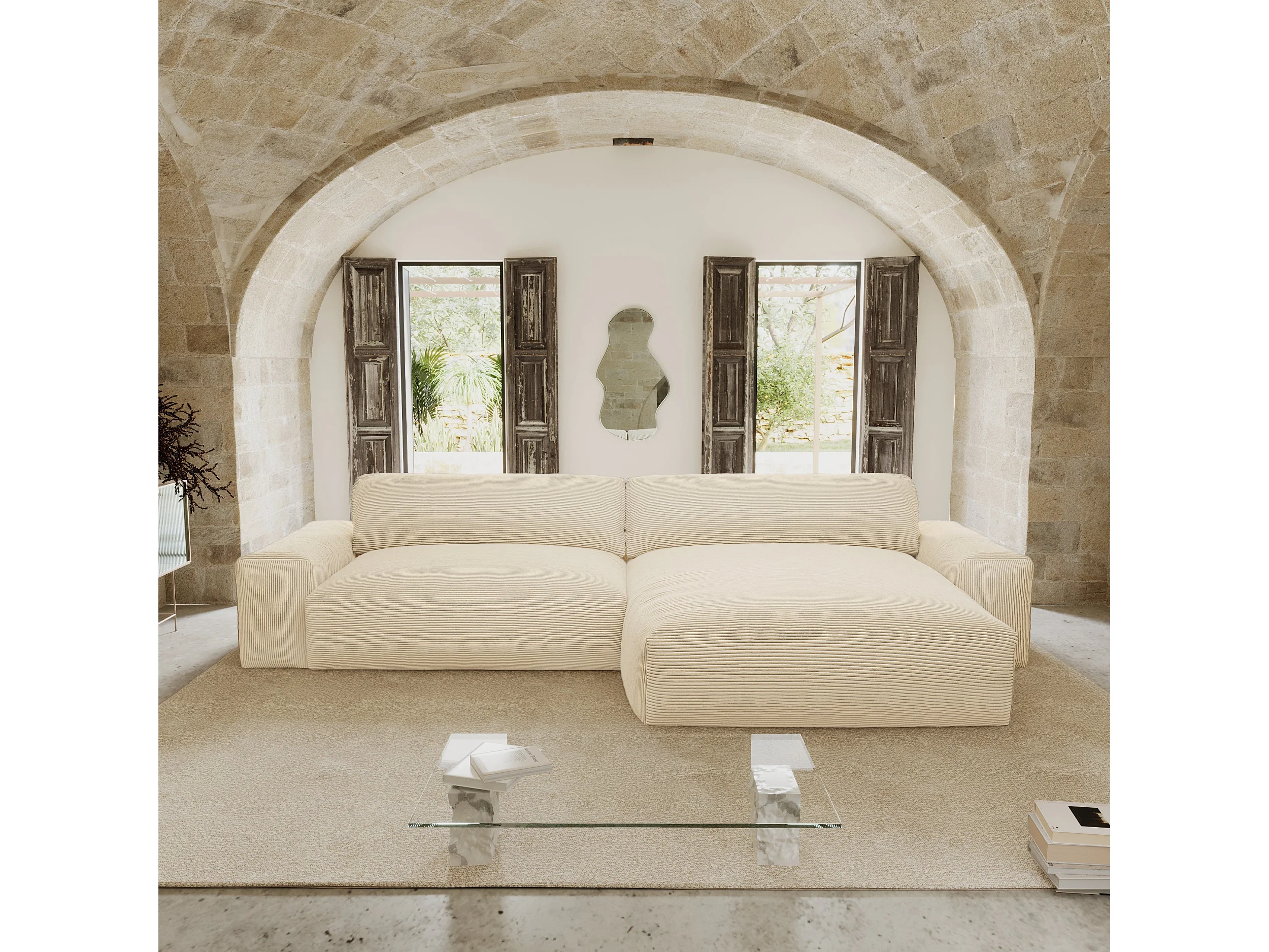 Canapé angle droit velours côtelé crème 310cm BLISS