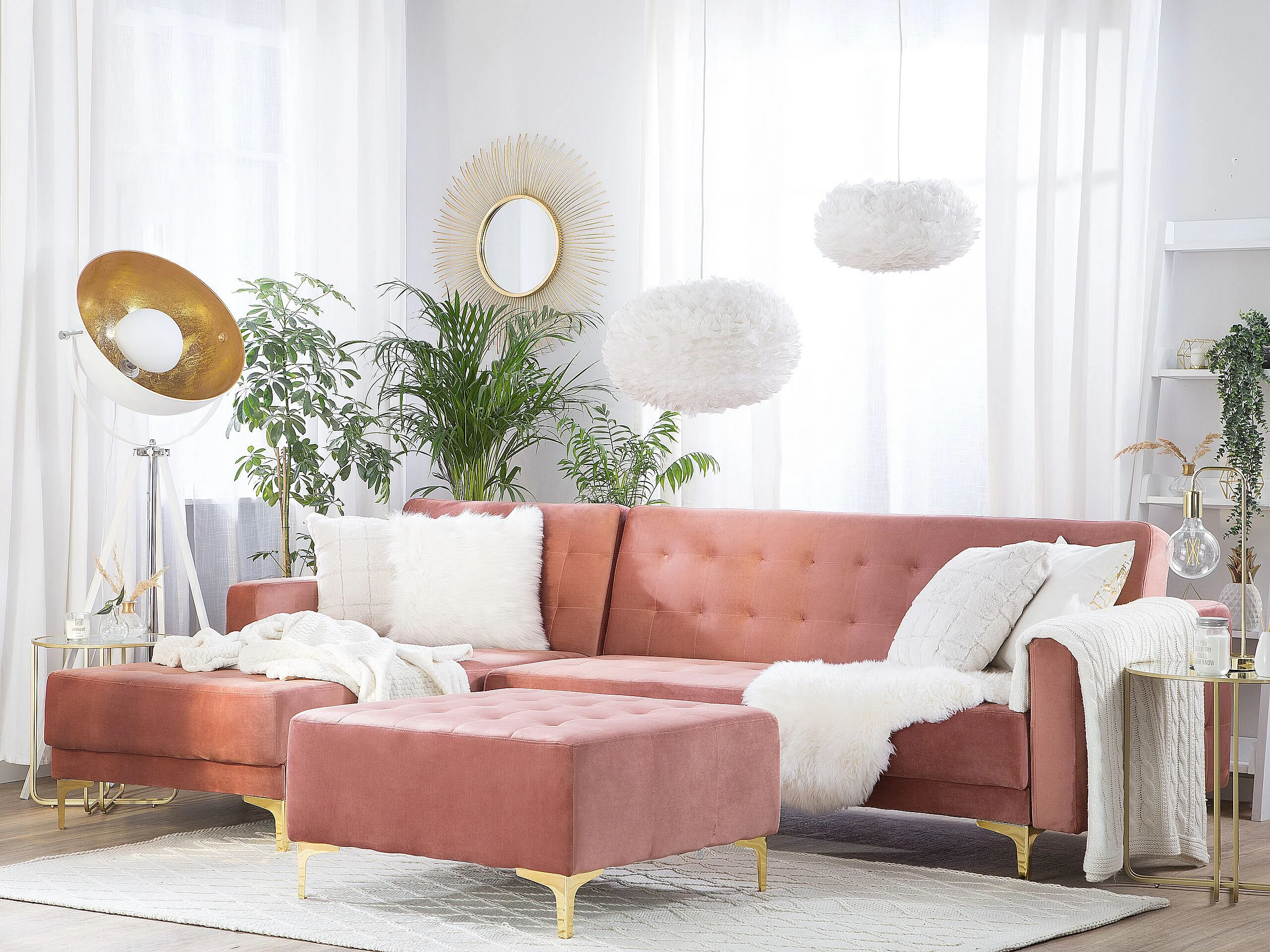 Canapé-lit d'angle modulable 4 places ABERDEEN Velours Rose avec ottoman Côté droit
