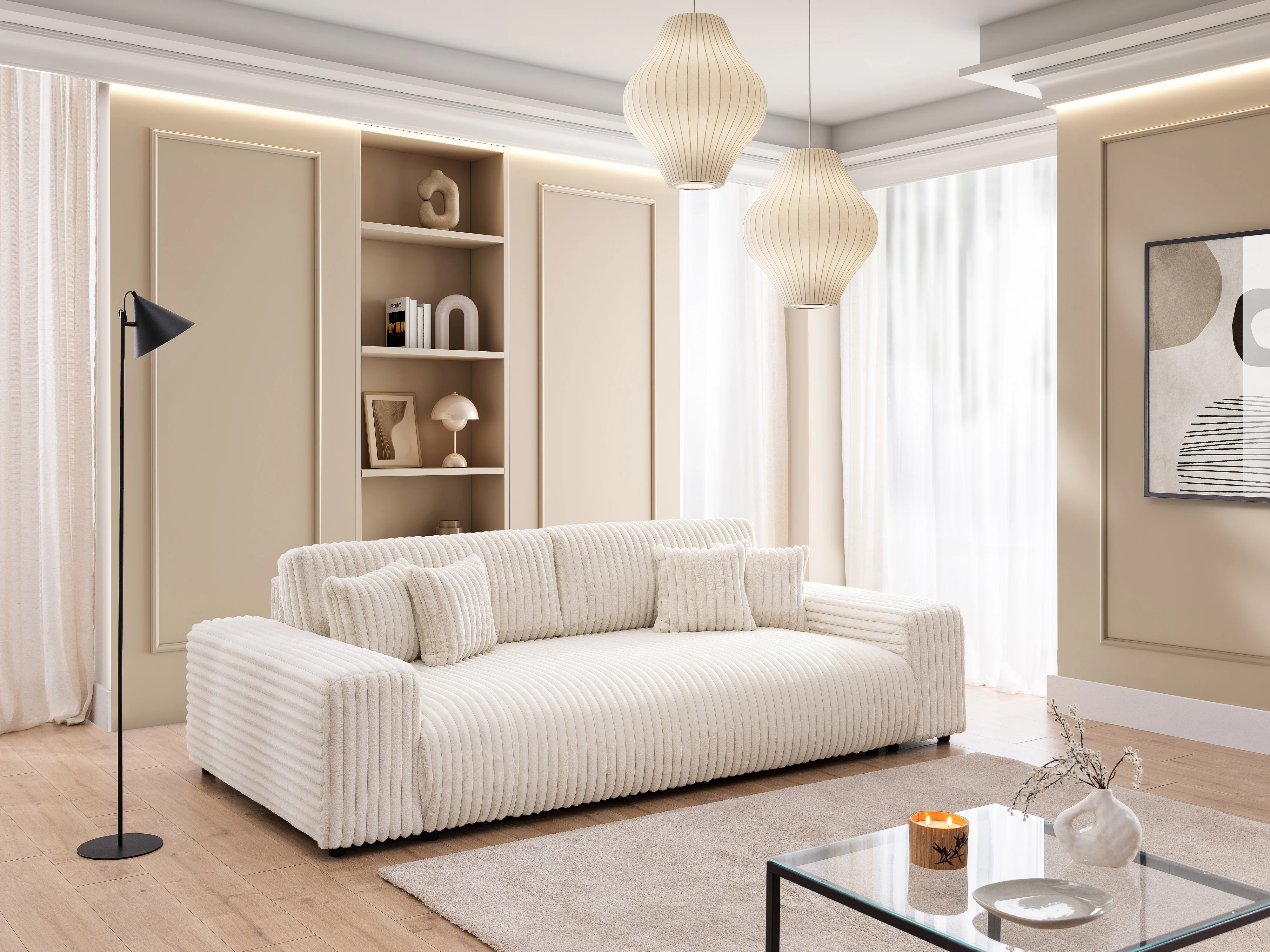 Canapé avec fonction couchage et coffre de rangement en velours côtelé pelucheux beige clair MOLLIS