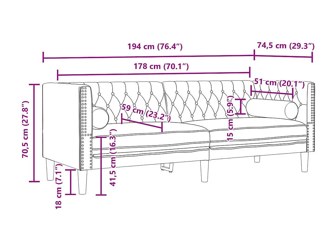 Canapé Chesterfield 3 places | Sofa pour Salon avec traversins velours