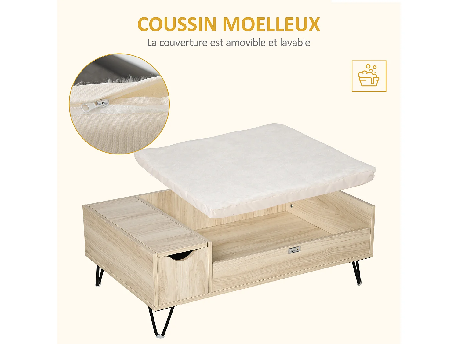 Maison de toilette pour chat style industriel porte entrée latérale boule suspendue châssis acier aspect bois clair