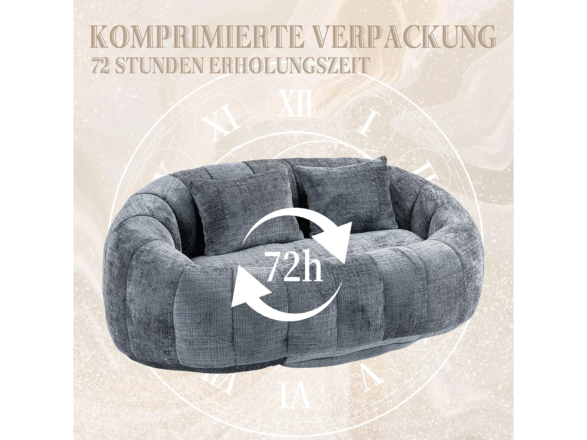 Canapé Compressé 2 places en tissu chenille, en mousse haute densité, avec 2 coussins, Gris