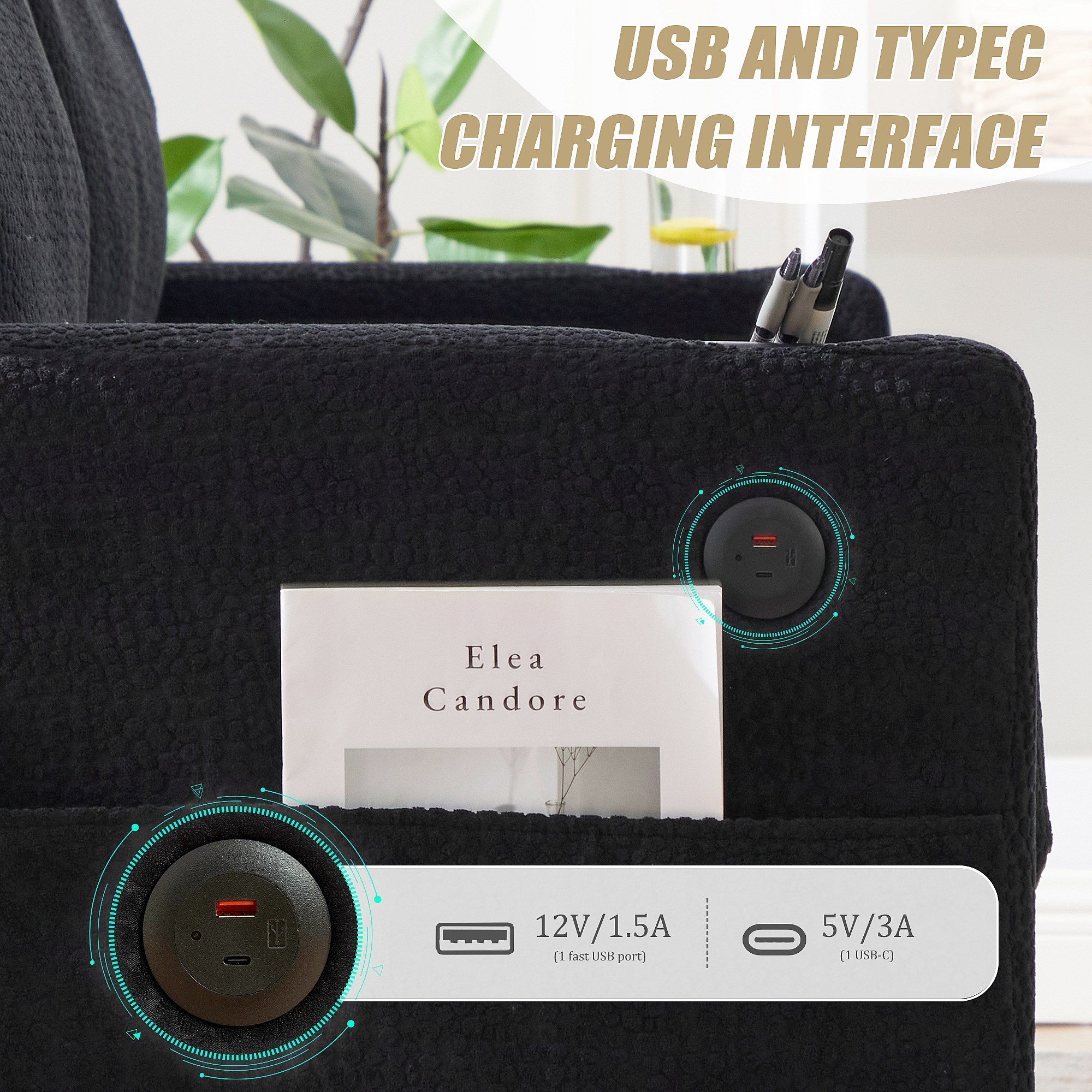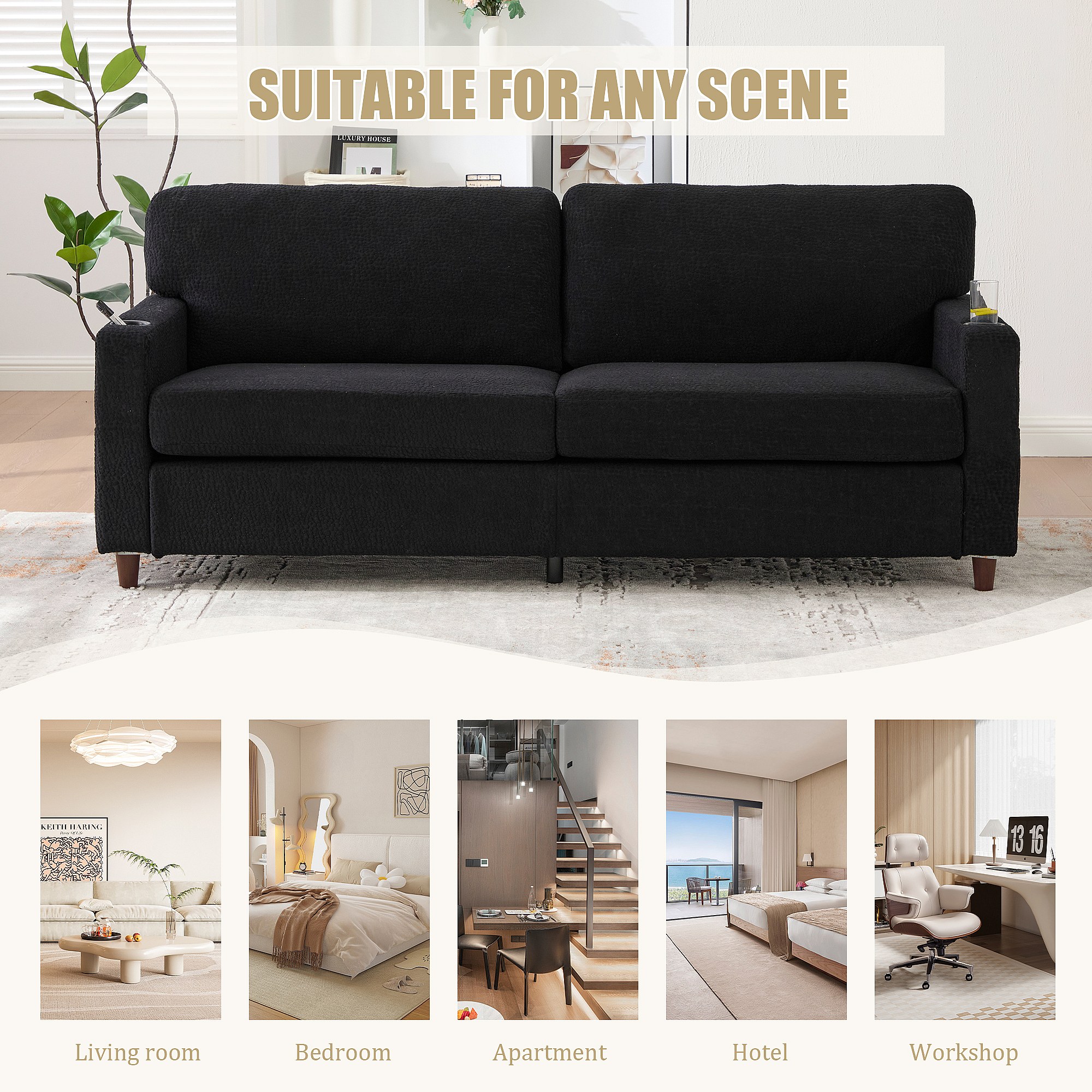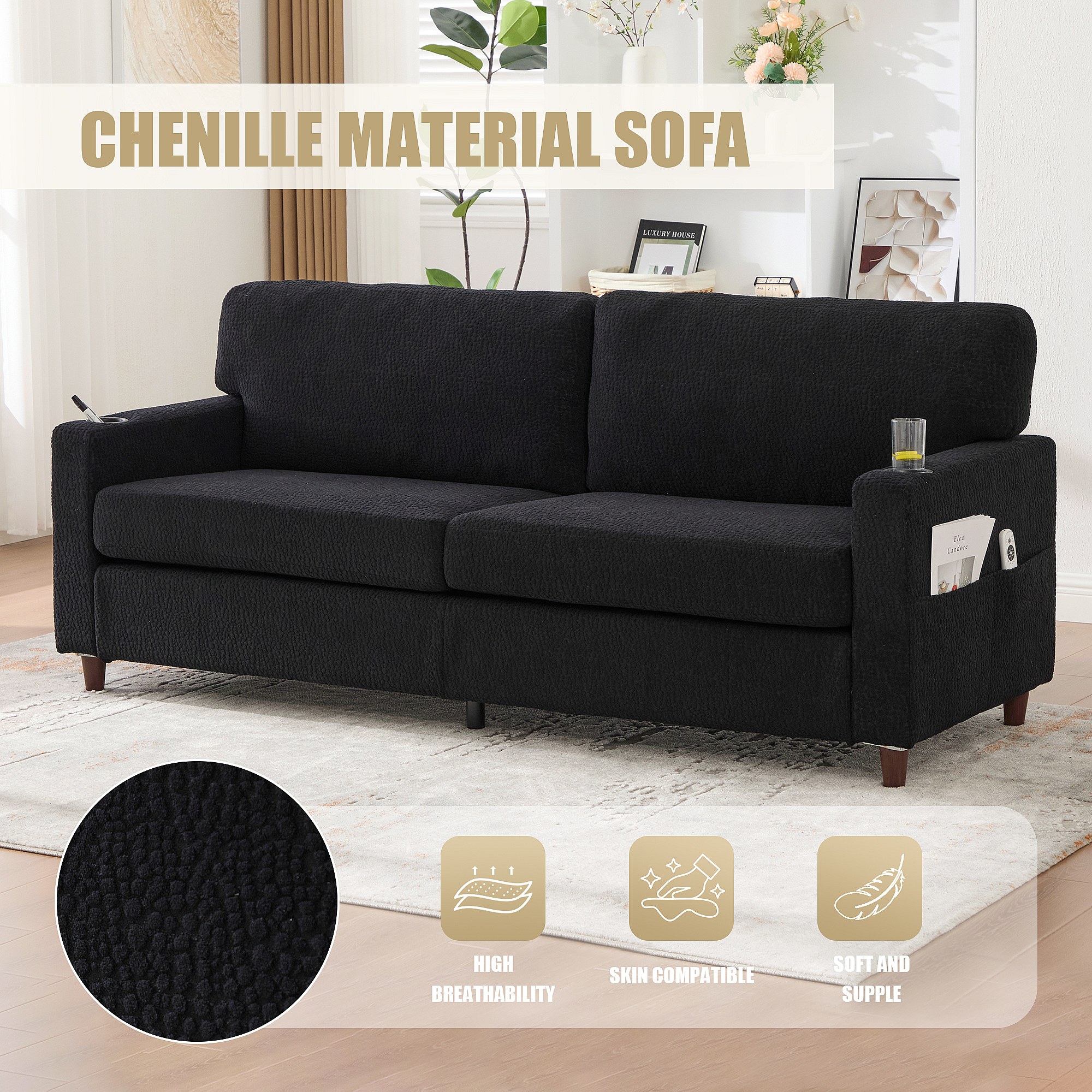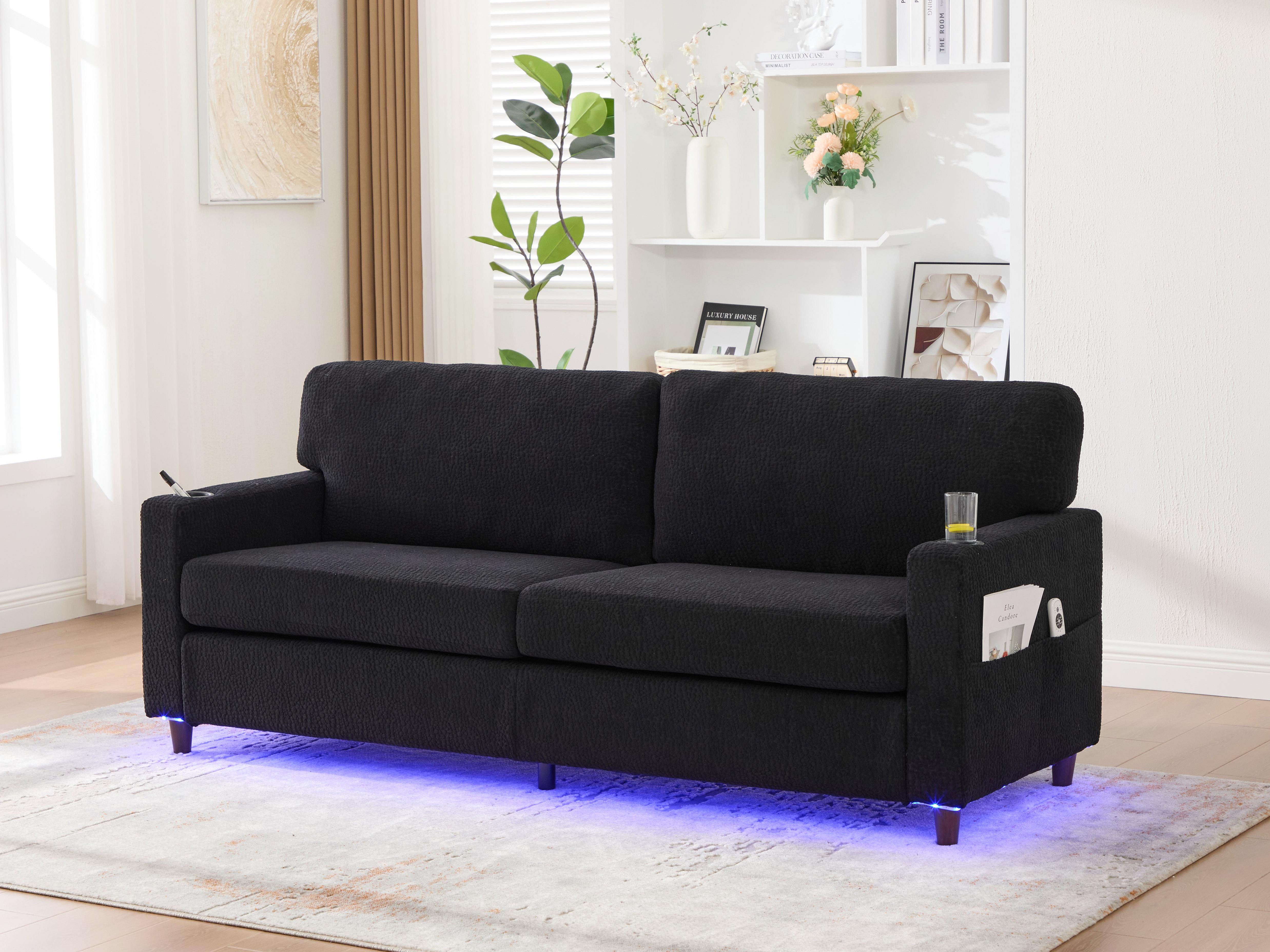 Canapé Confortable 2 Places - Canapé Fixe en Velours Chenille - Ports USB/Type-C Intégrés - LED RGB Télécommandable - Noir - Pour Salon, Séjour, Bureau