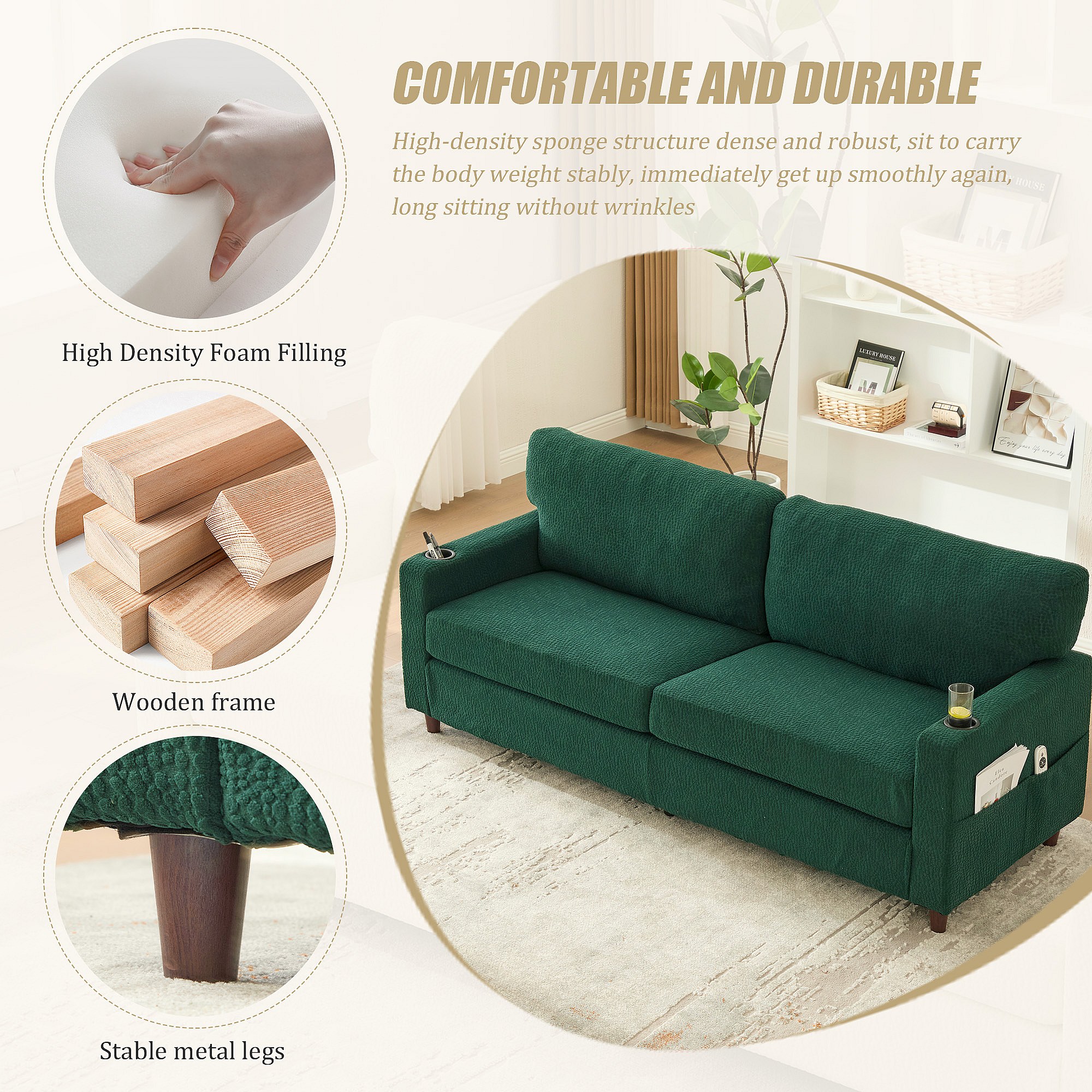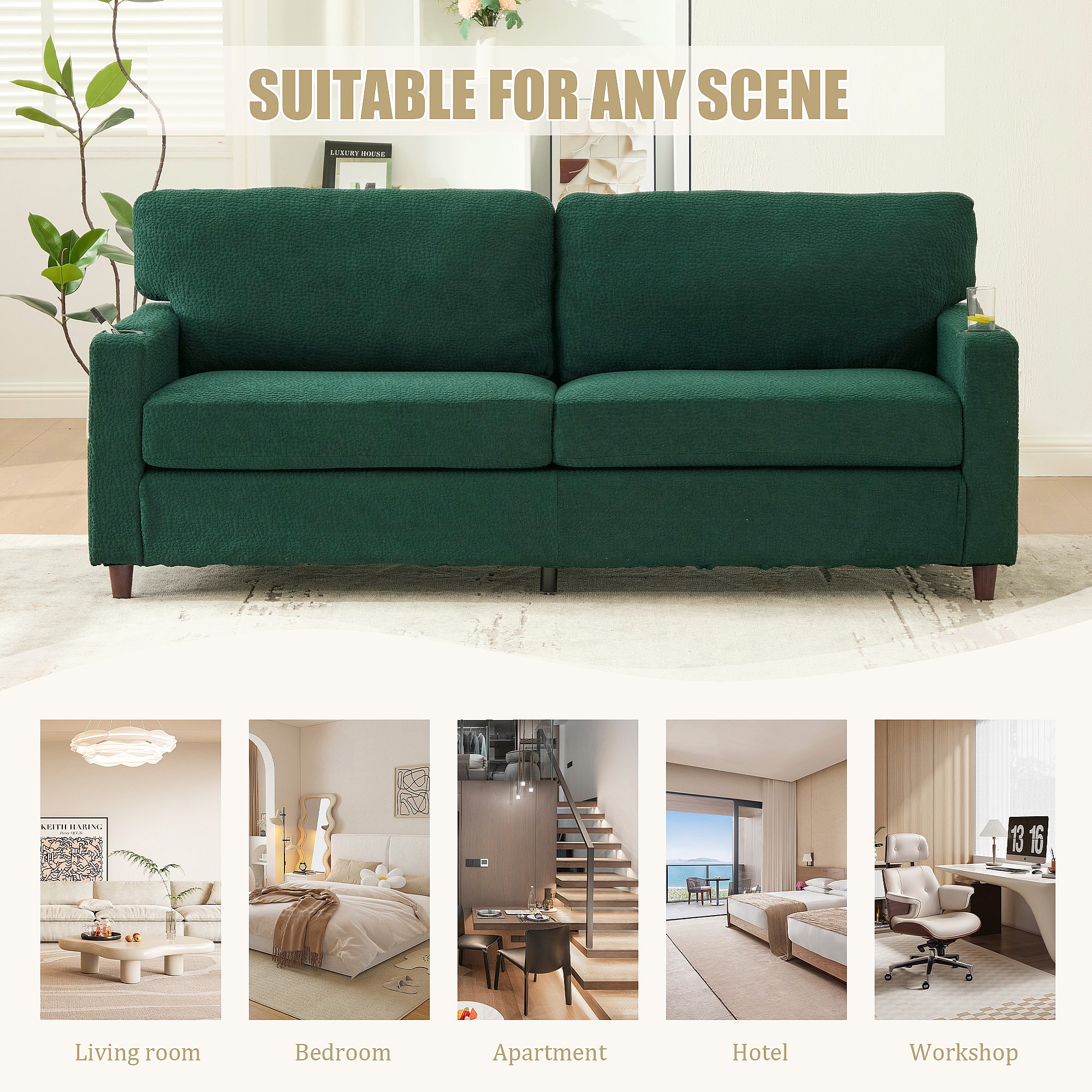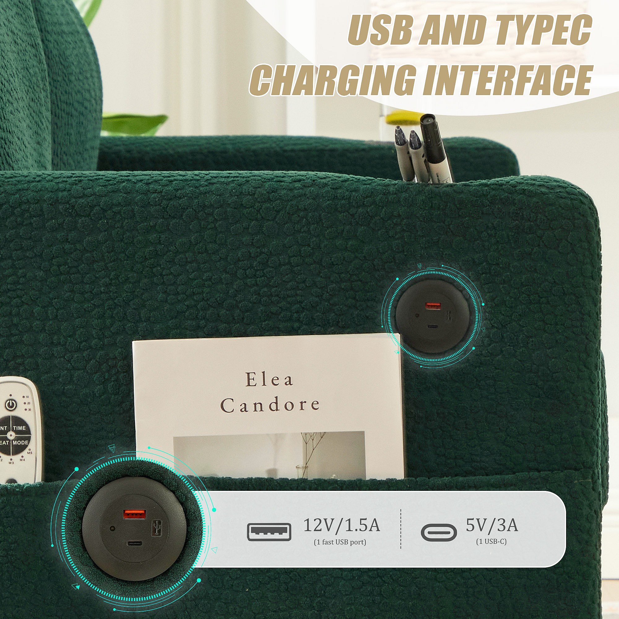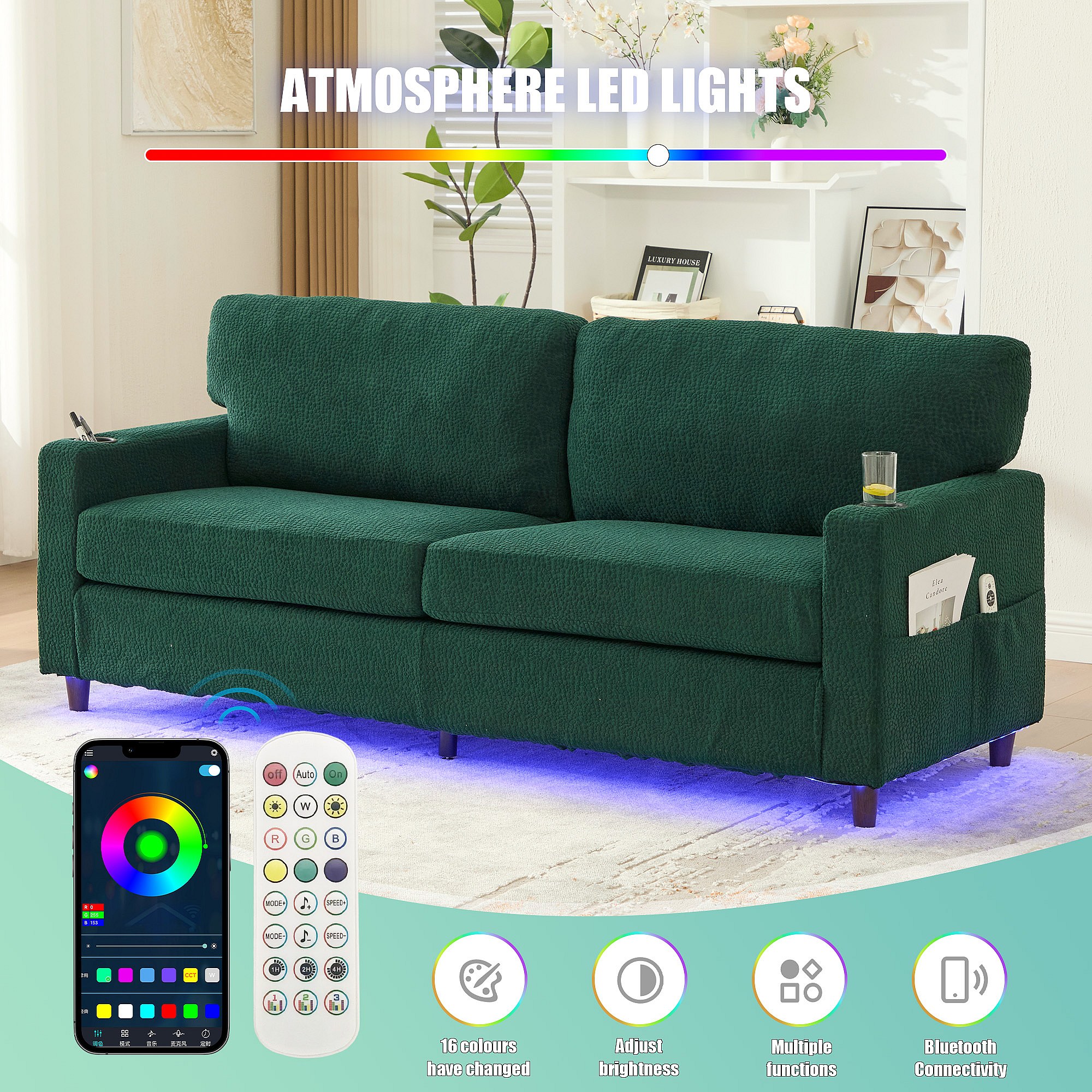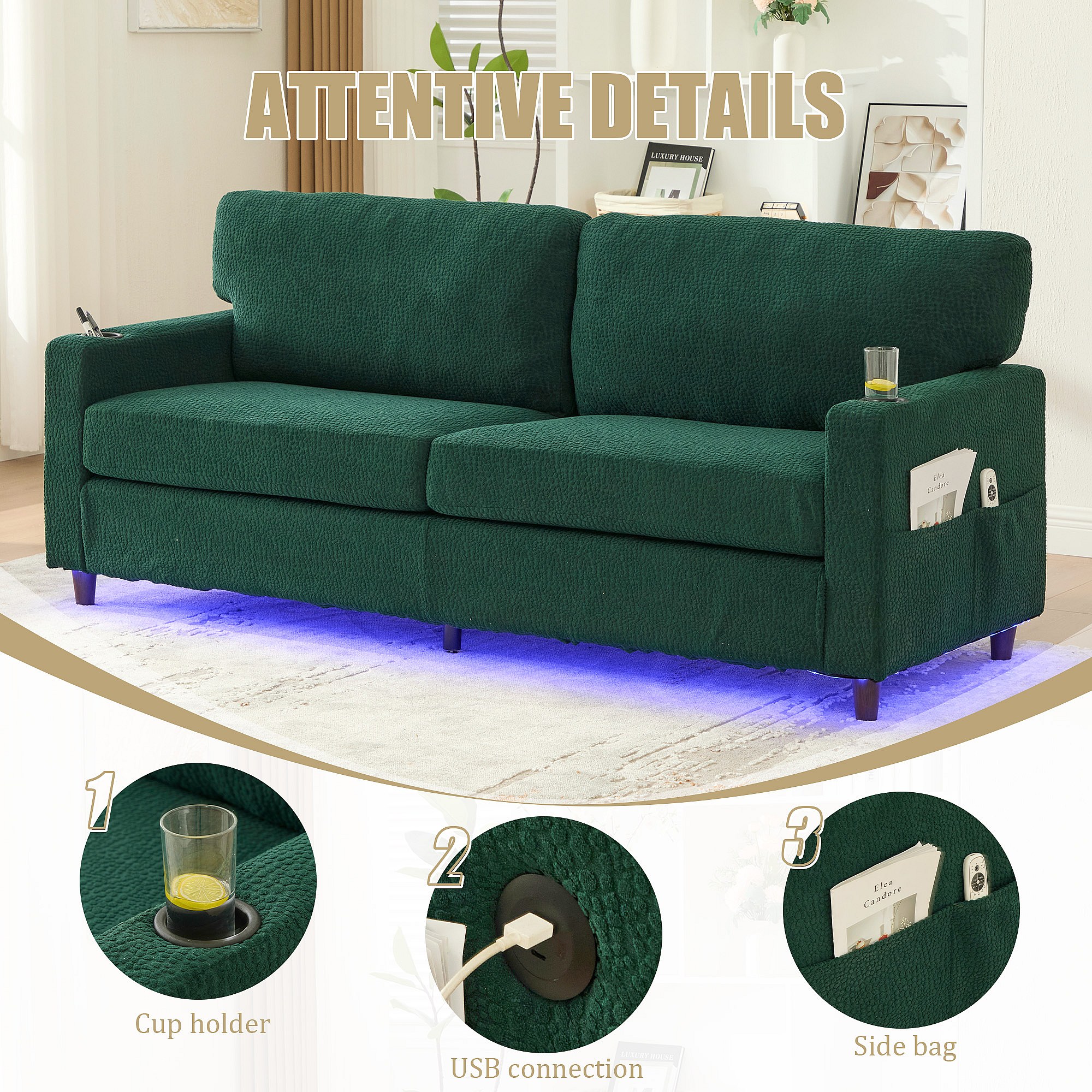 Canapé Confortable 2 Places - Canapé Fixe en Velours Chenille - Ports USB/Type-C Intégrés - LED RGB Télécommandable - Vert - Pour Salon, Séjour, Bureau