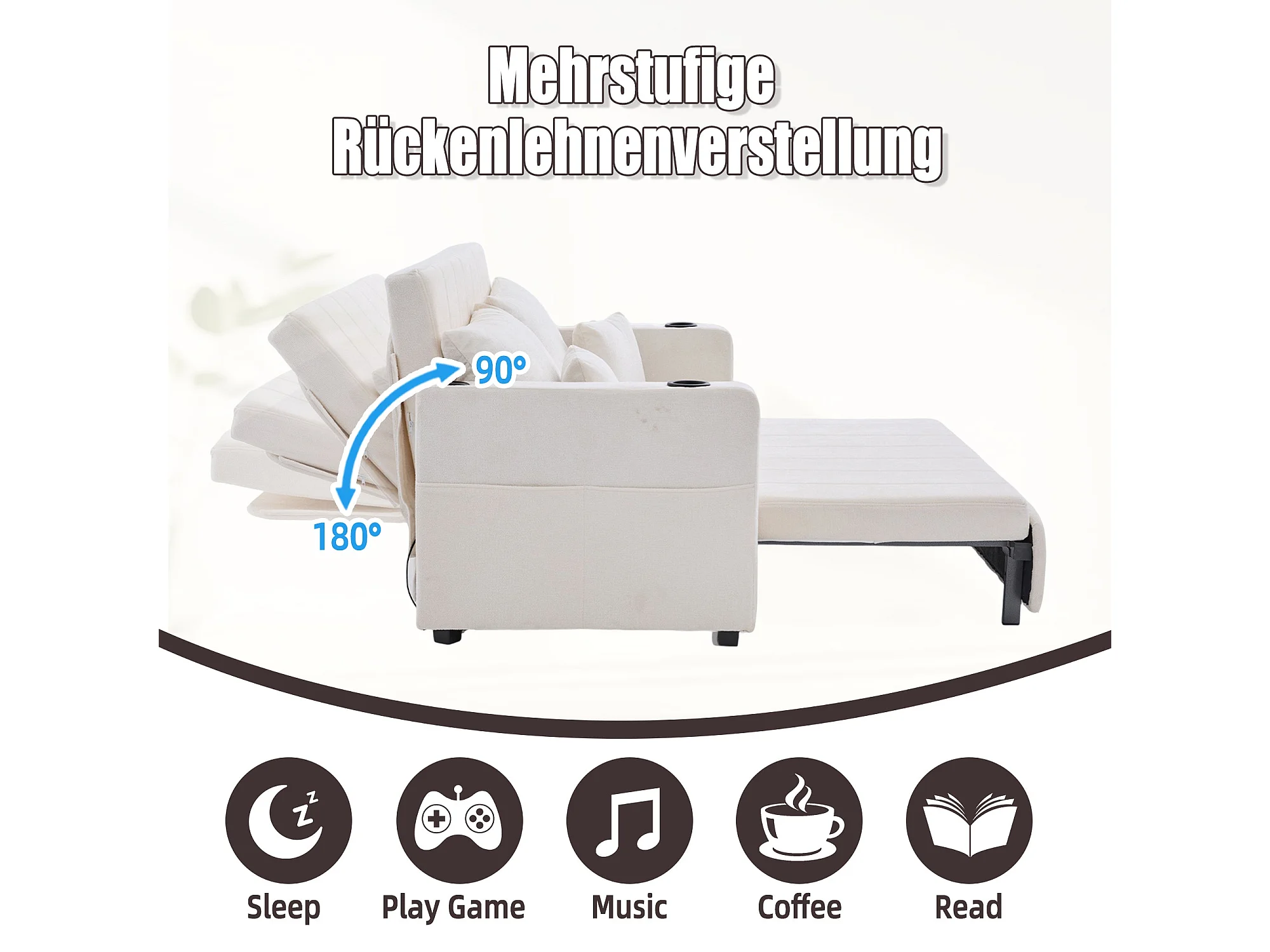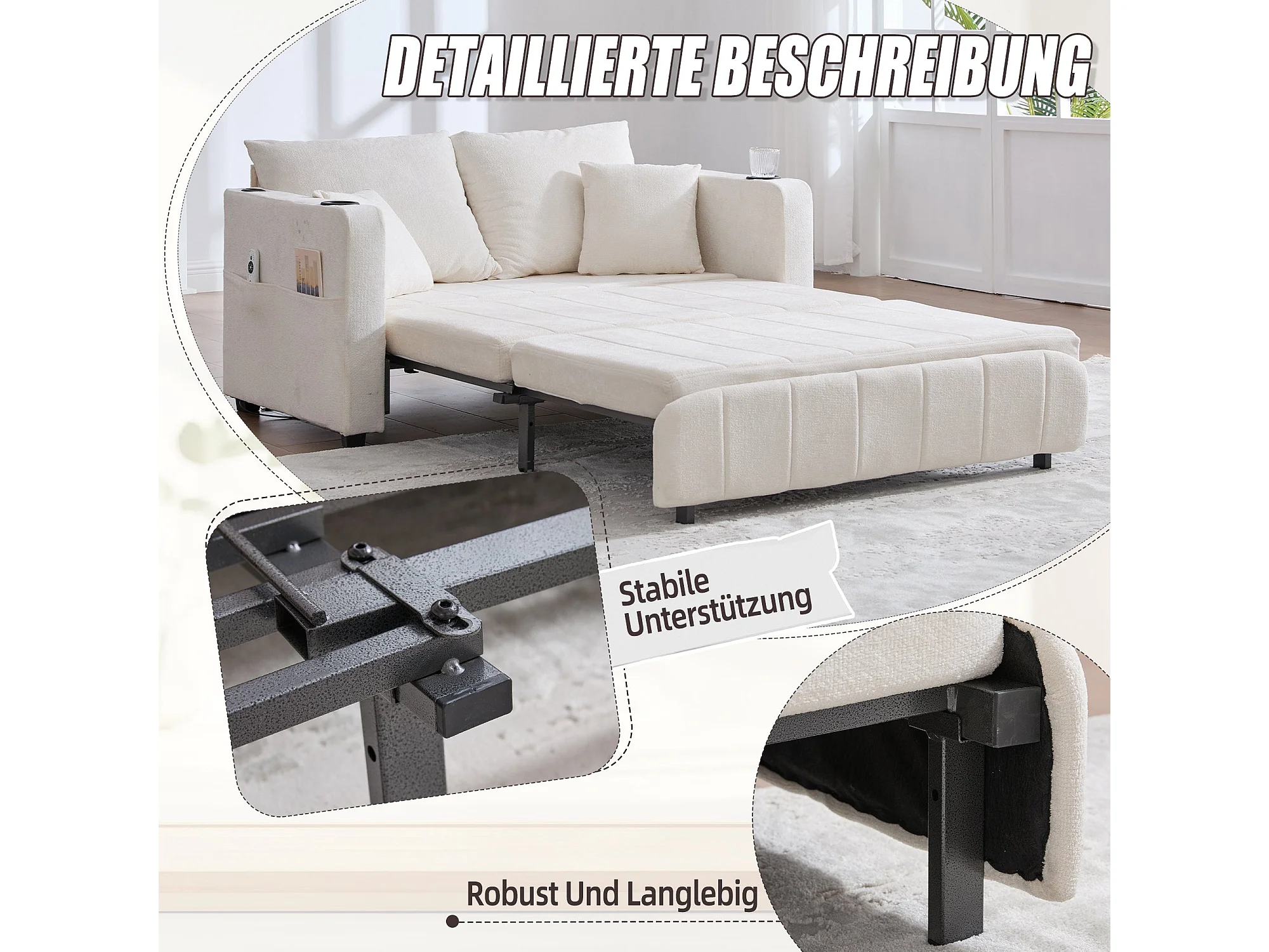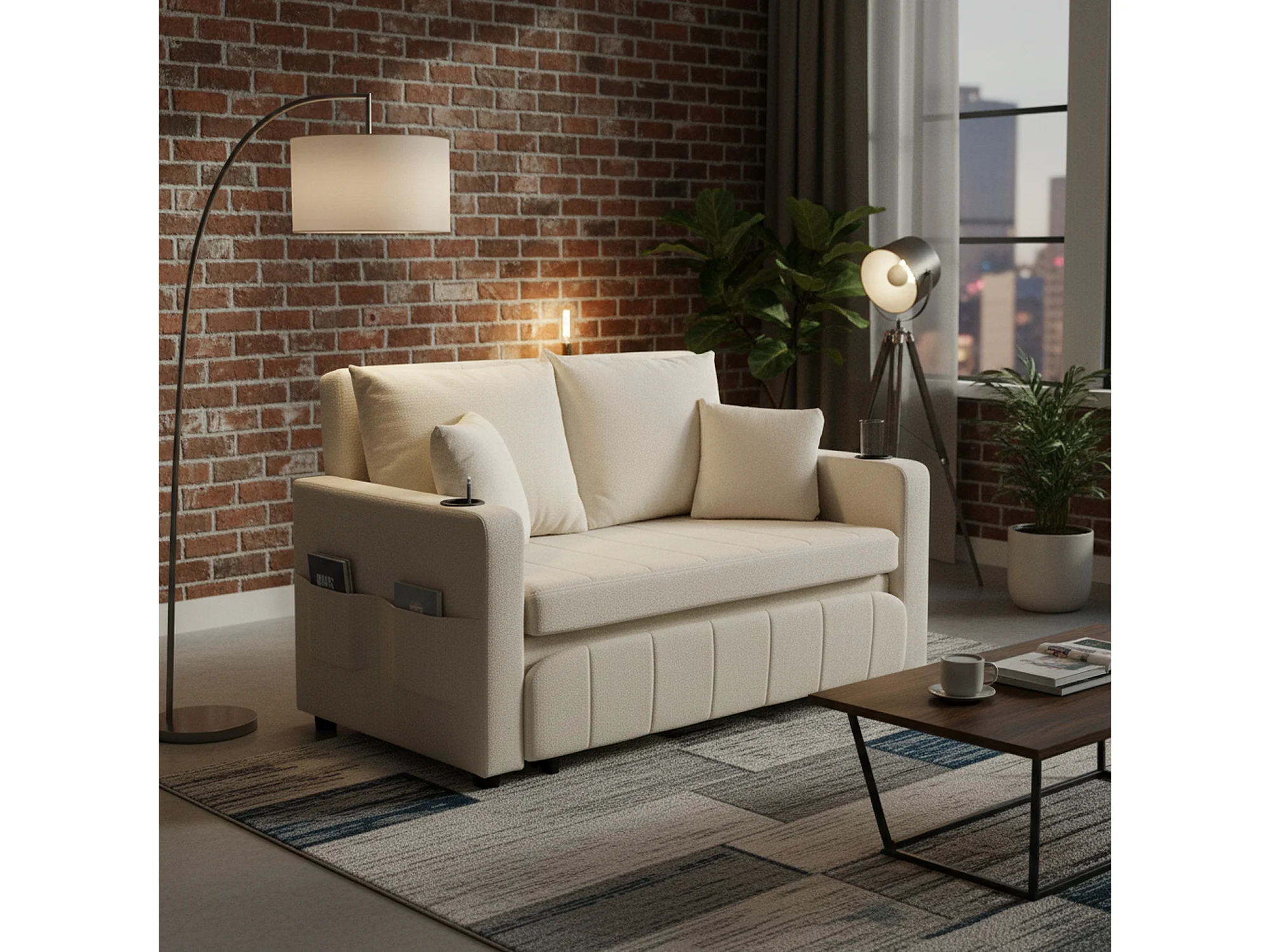 Canapé convertible 2-place en tissu chenille beige, 139x83x58cm, avec rangement, USB et porte-gobelet