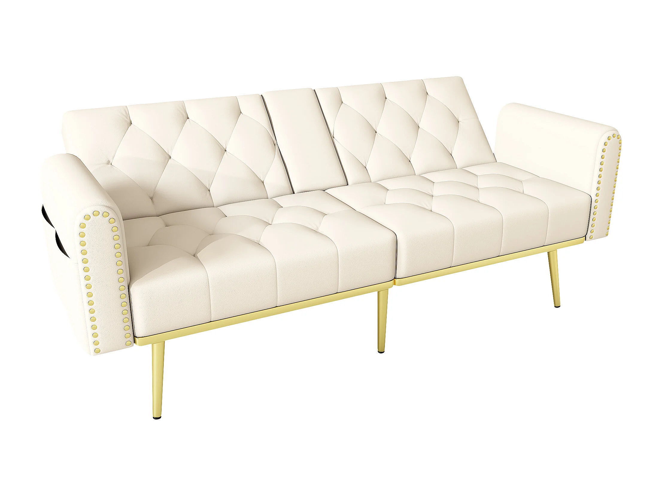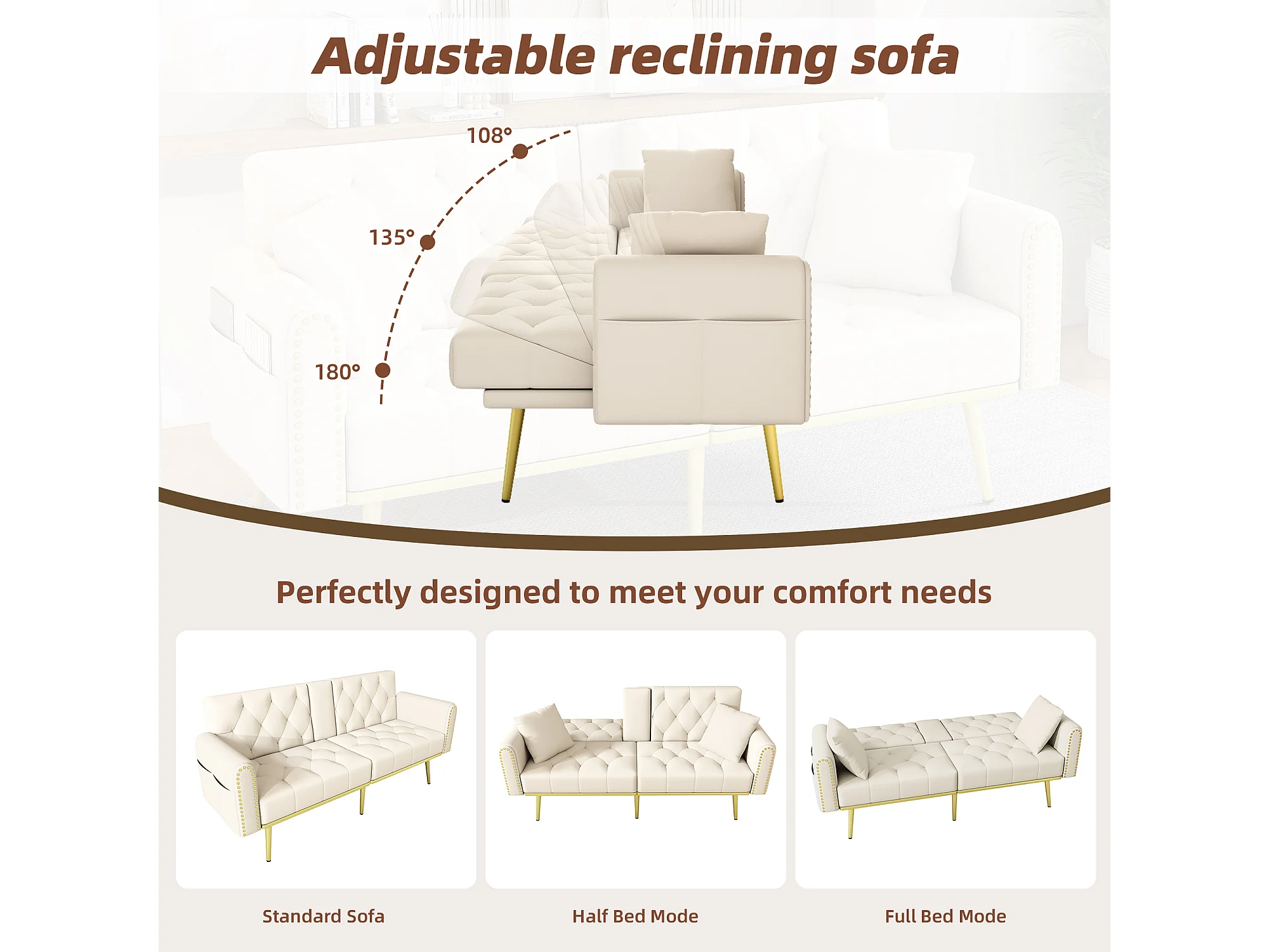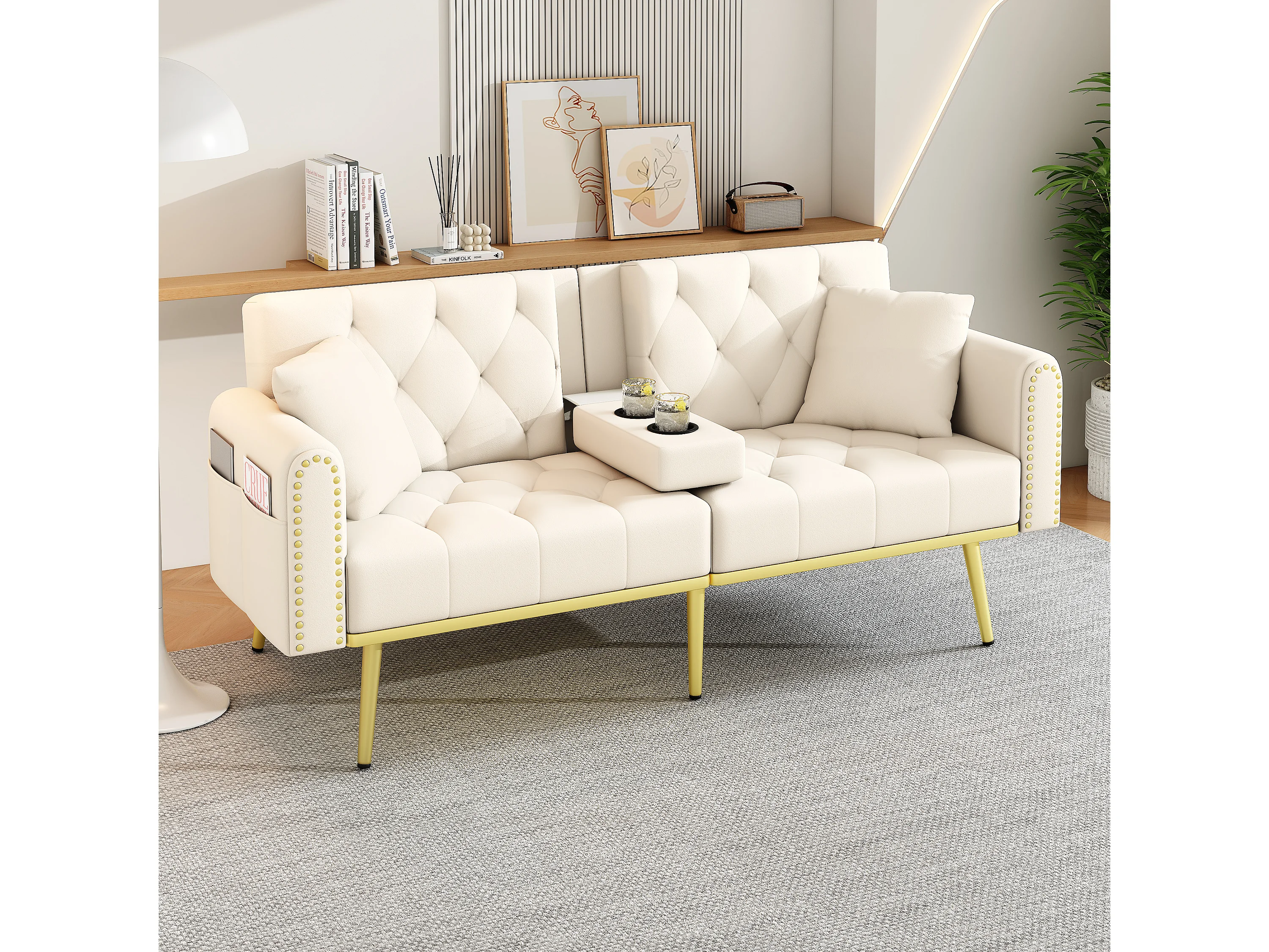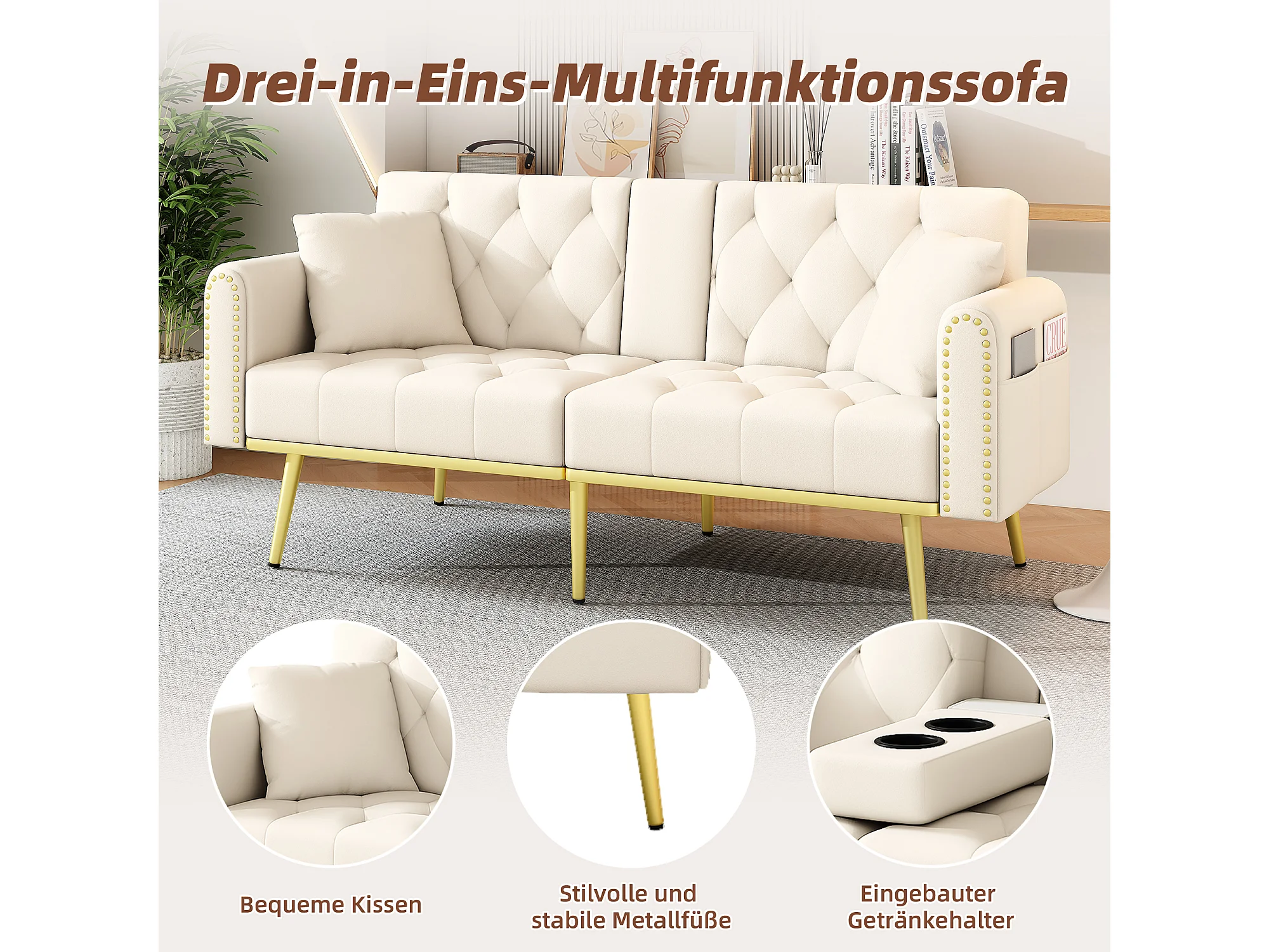 Canapé convertible 2 places - 175 x 80 x 73.5 cm - 3 positions d'inclinaison et avec porte-gobelets - velours - beige