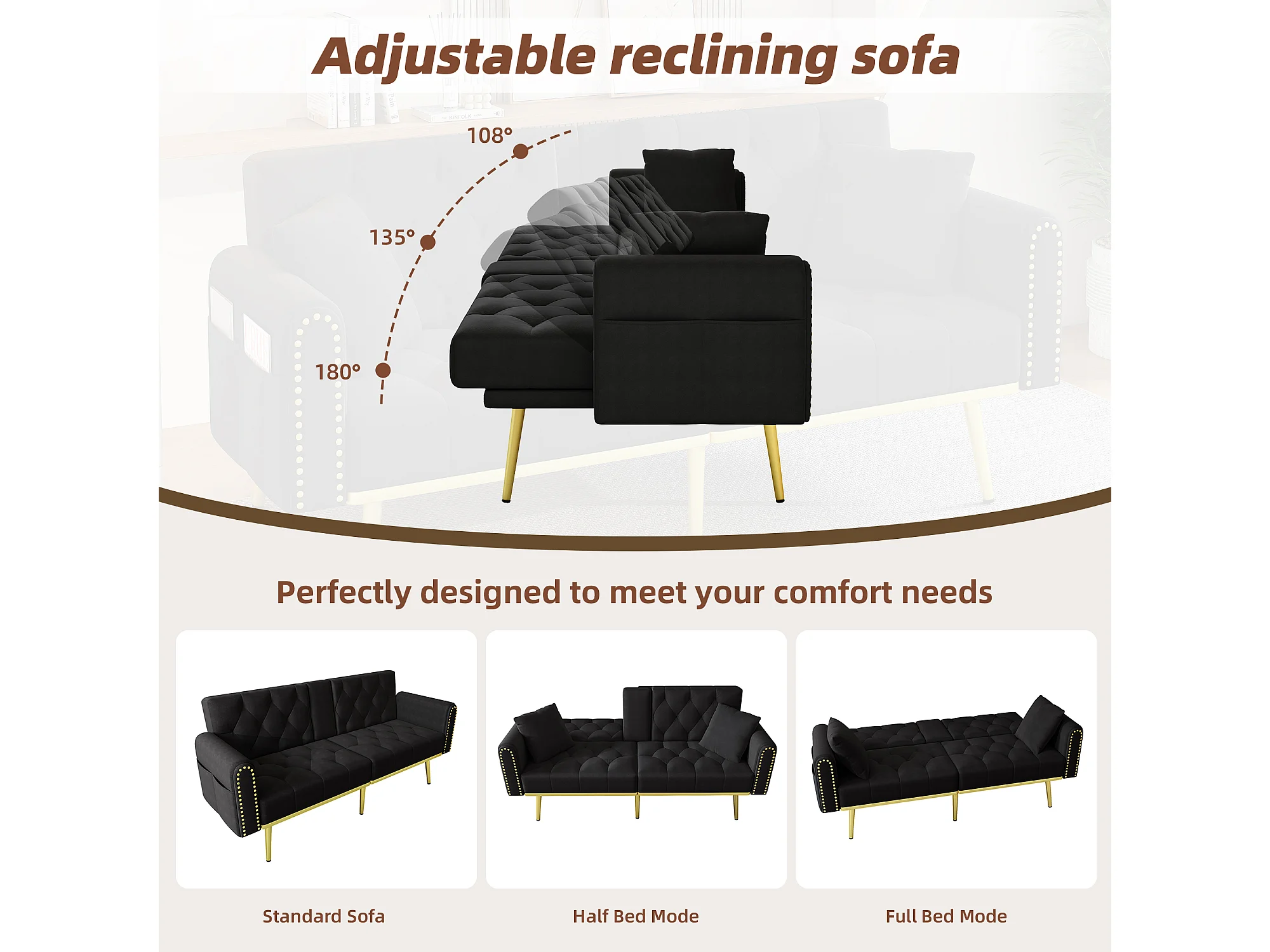 Canapé convertible 2 places - 175 x 80 x 73.5 cm - 3 positions d'inclinaison et avec porte-gobelets - velours - noir