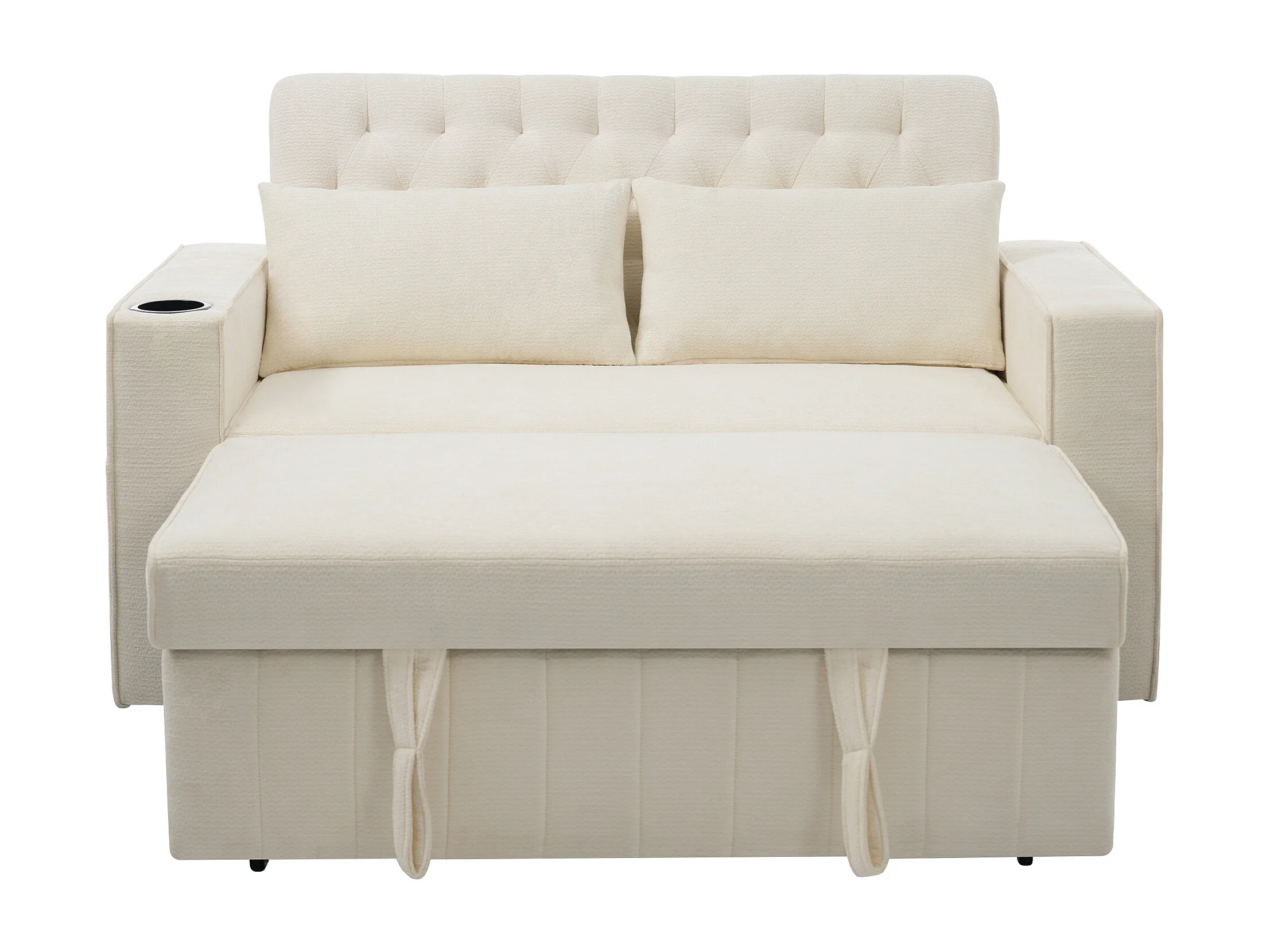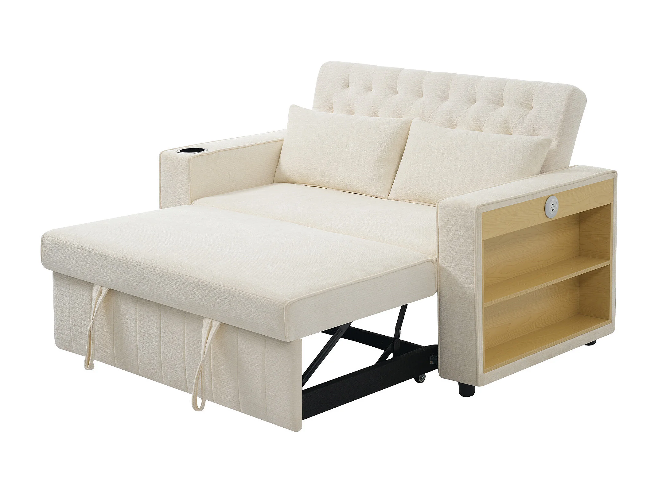Canapé convertible 2 places avec ports USB, porte-gobelet et rangements - Chenille beige