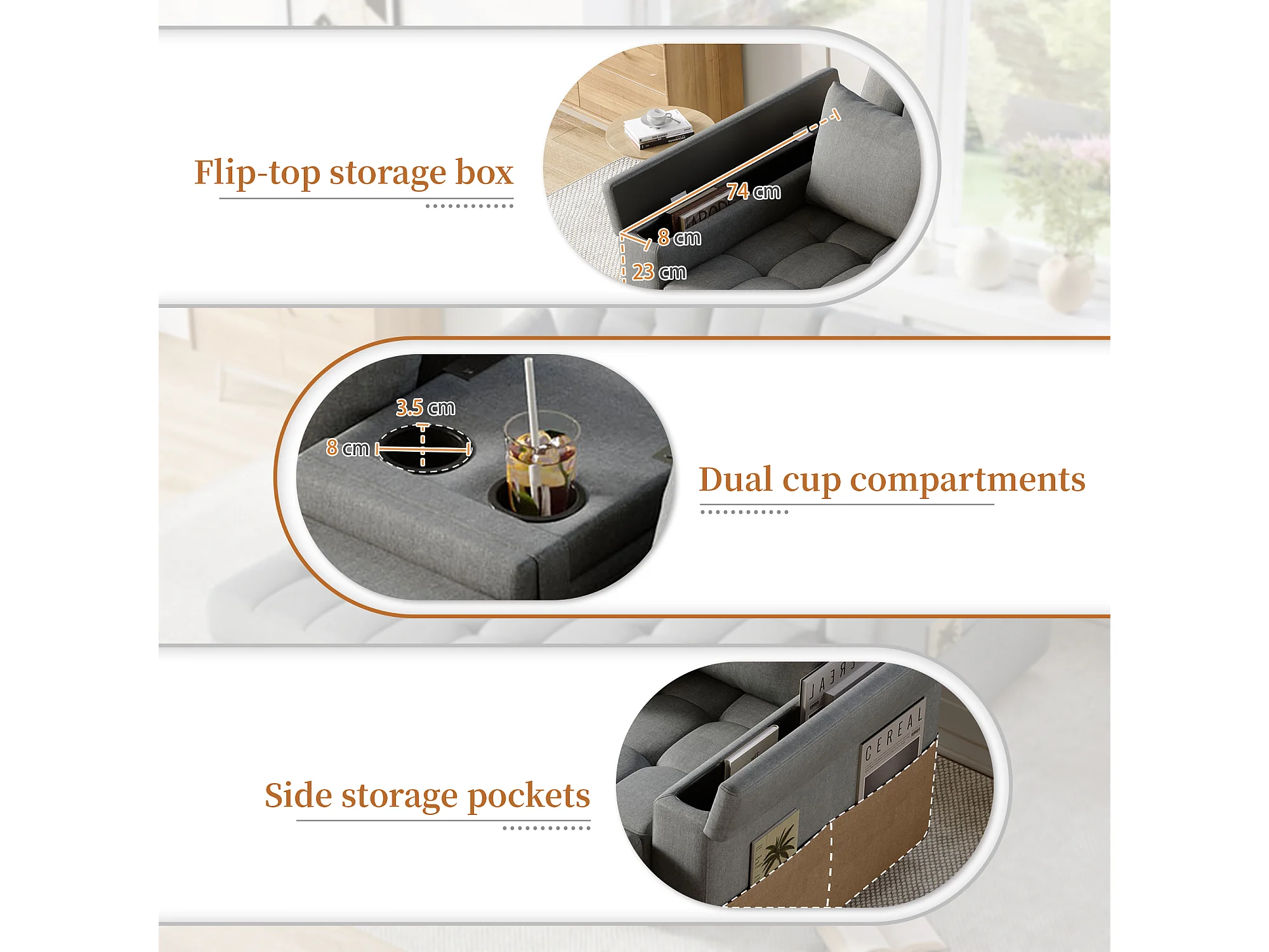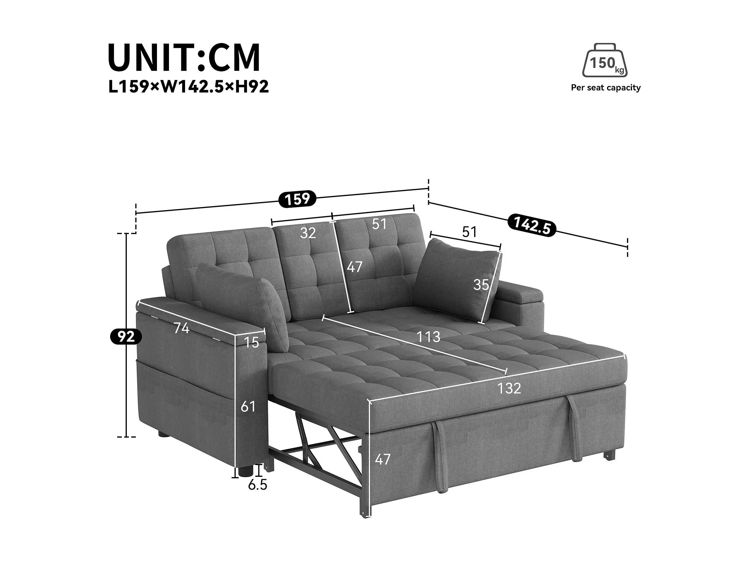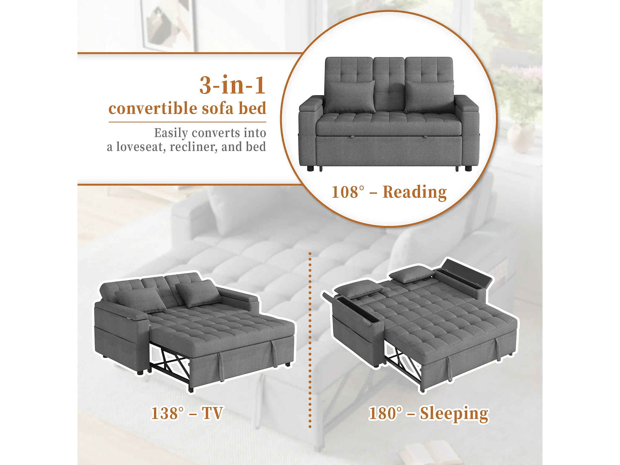 Canapé convertible 2 places avec rangement et dossier réglable - 159 x 142.5 x 92 cm - Coton et lin - gris