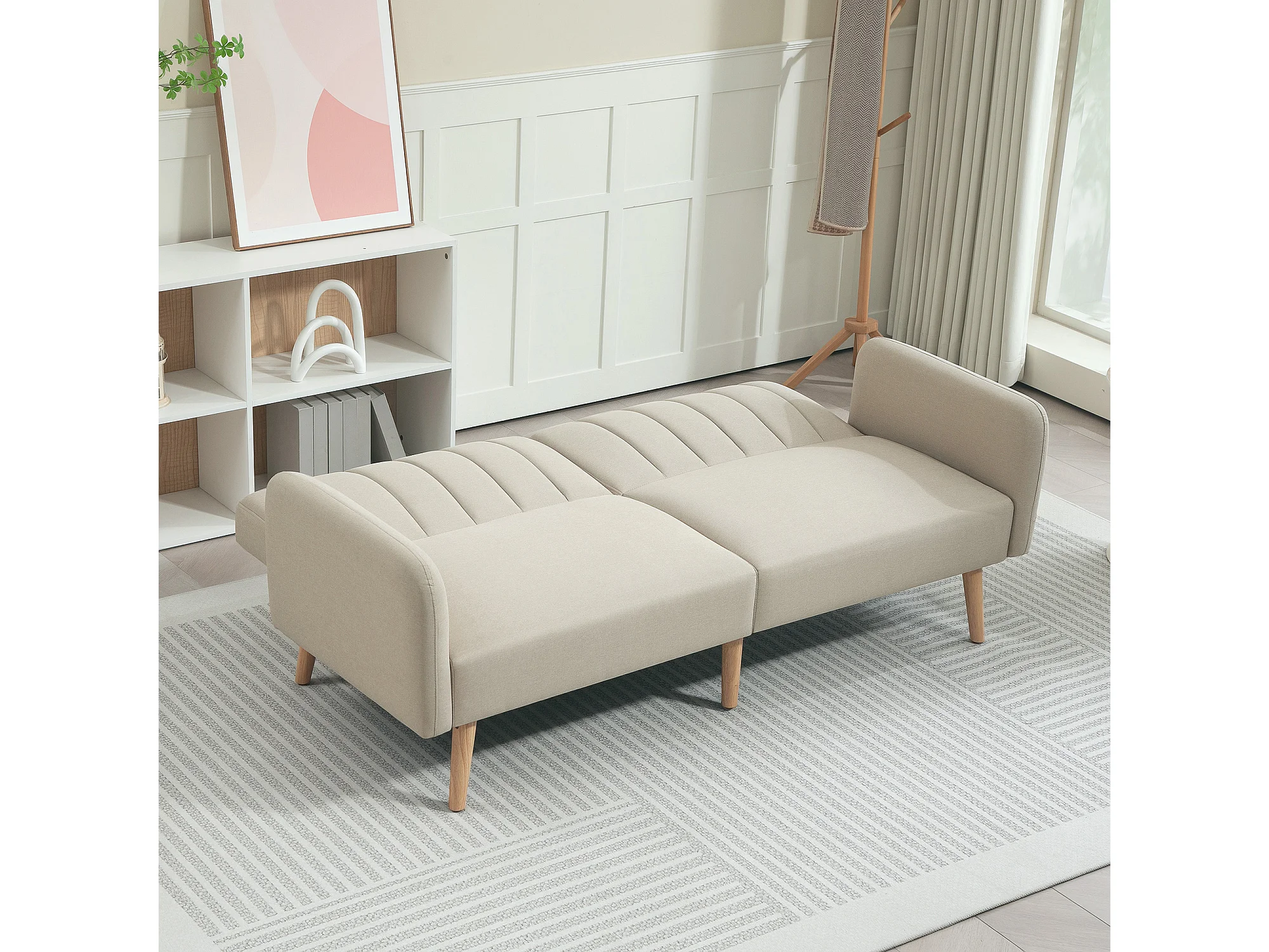 Canapé convertible 2 places design scandinave dossier inclinable 3 positions pieds bois tissu aspect lin beige