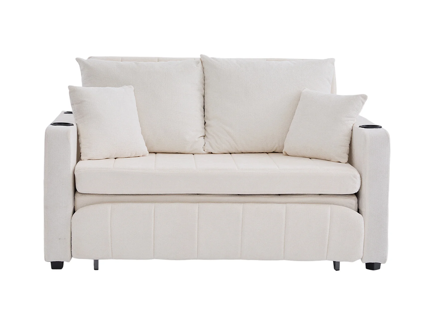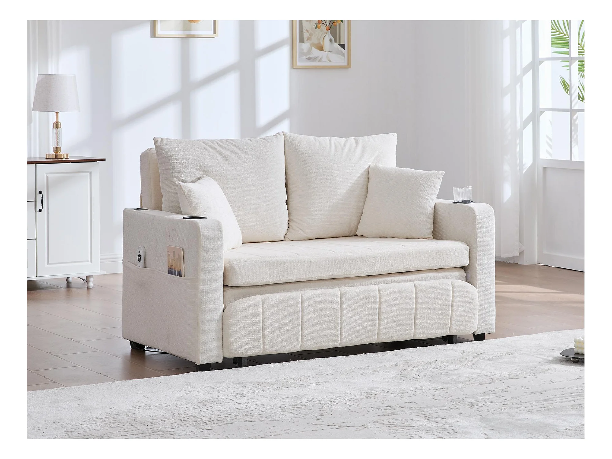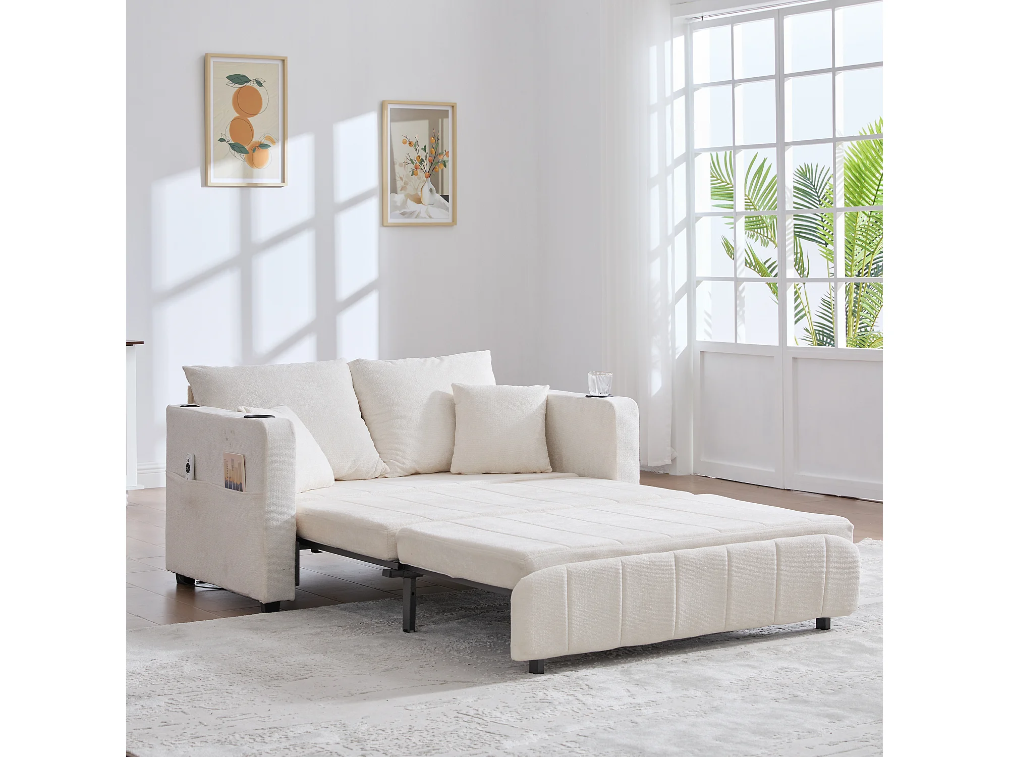 Canapé convertible 2 places en chenille beige - Canapé-lit avec accoudoirs porte-gobelets - port USB intégré - Idéal pour petit espace ou bureau