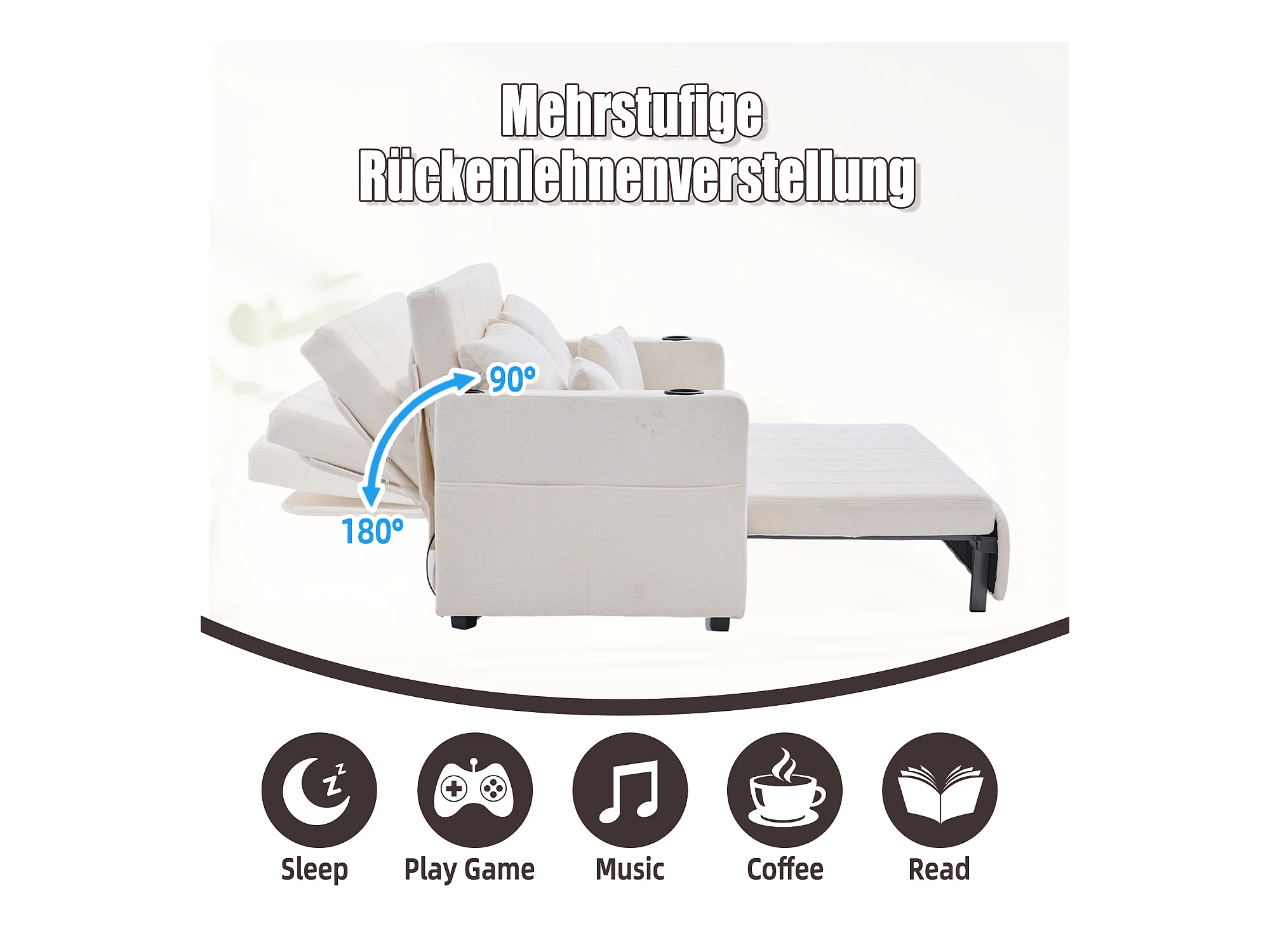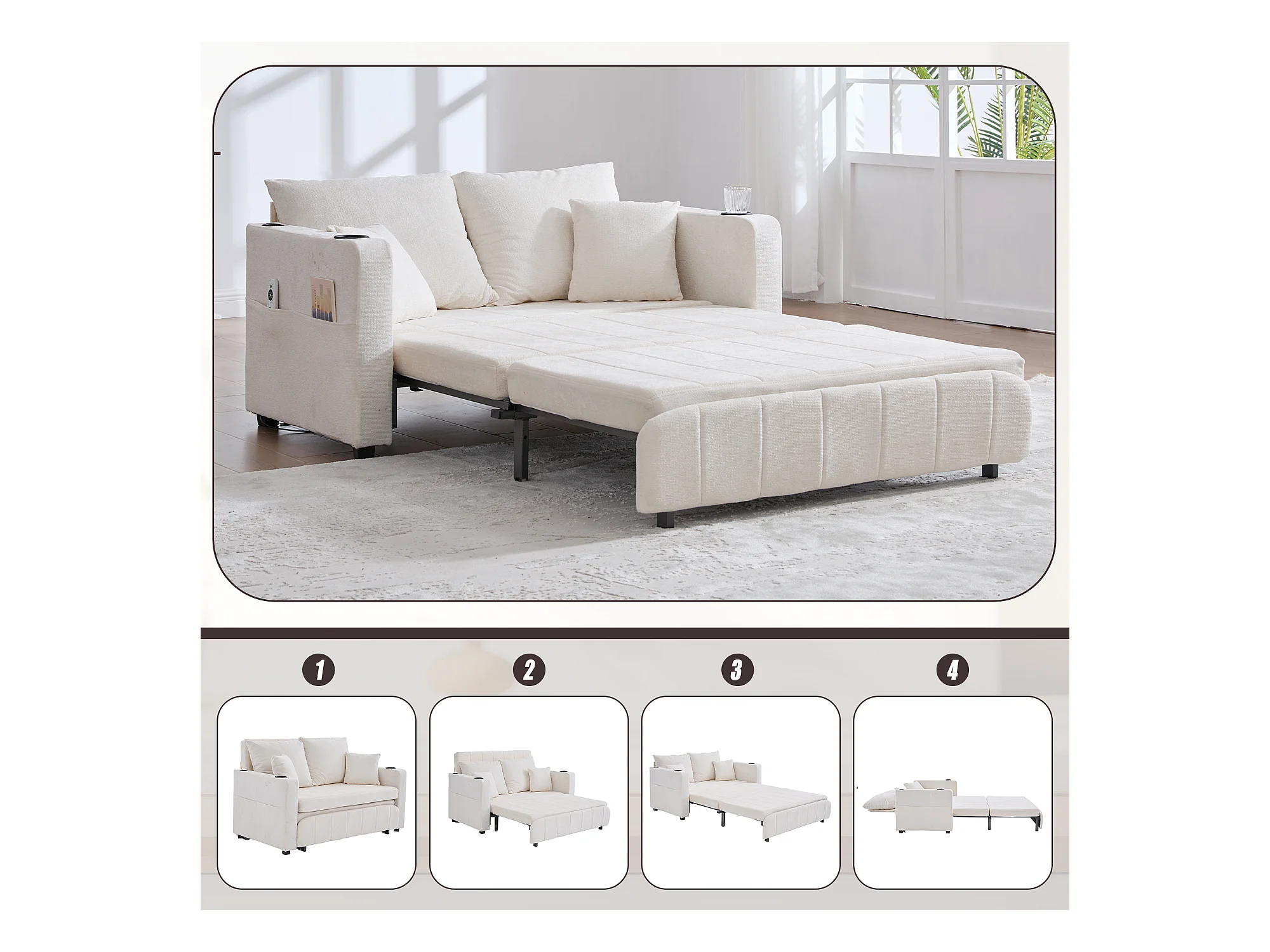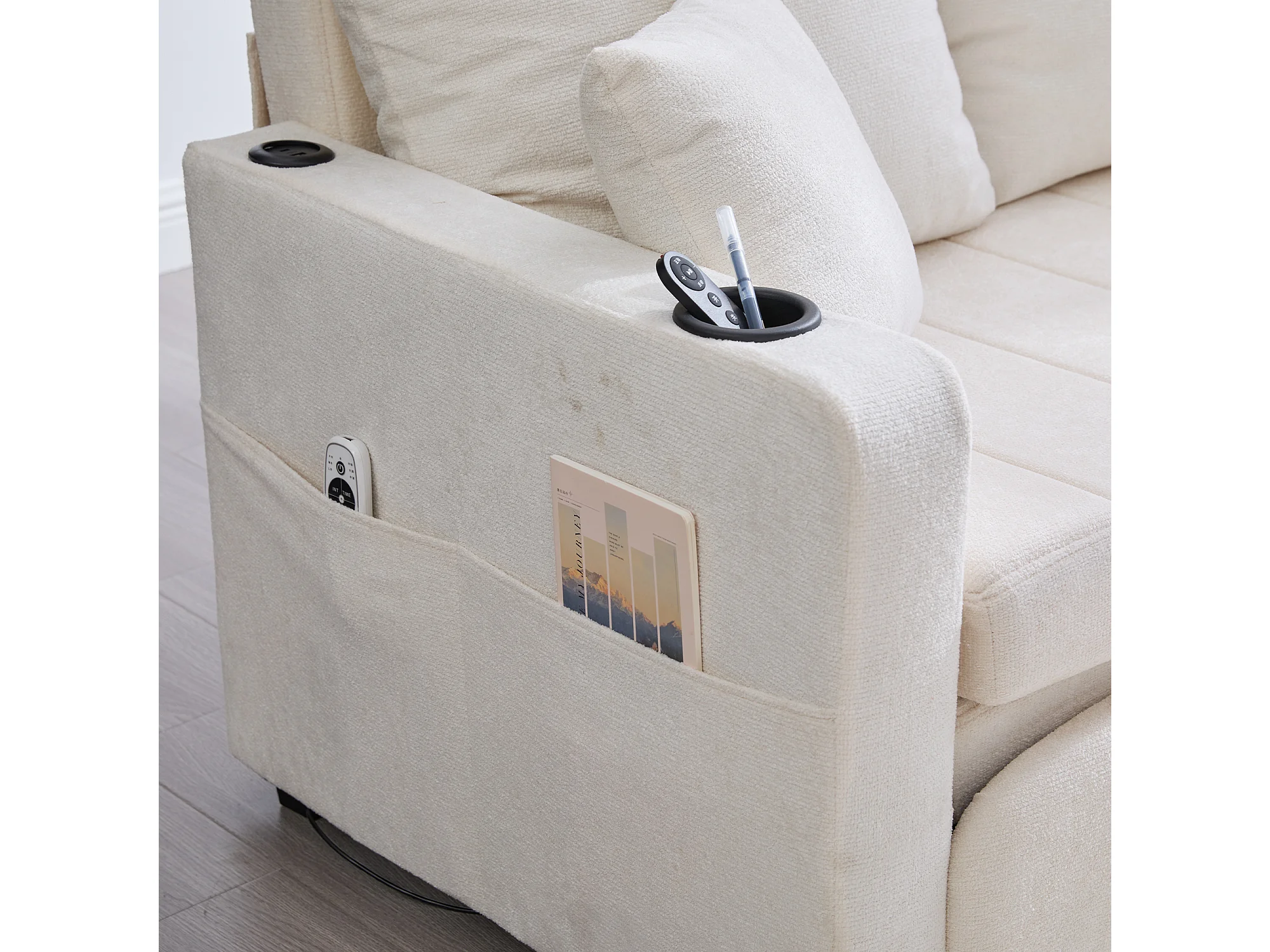 Canapé convertible 2 places en chenille beige - Canapé-lit avec accoudoirs porte-gobelets - port USB intégré - Idéal pour petit espace ou bureau
