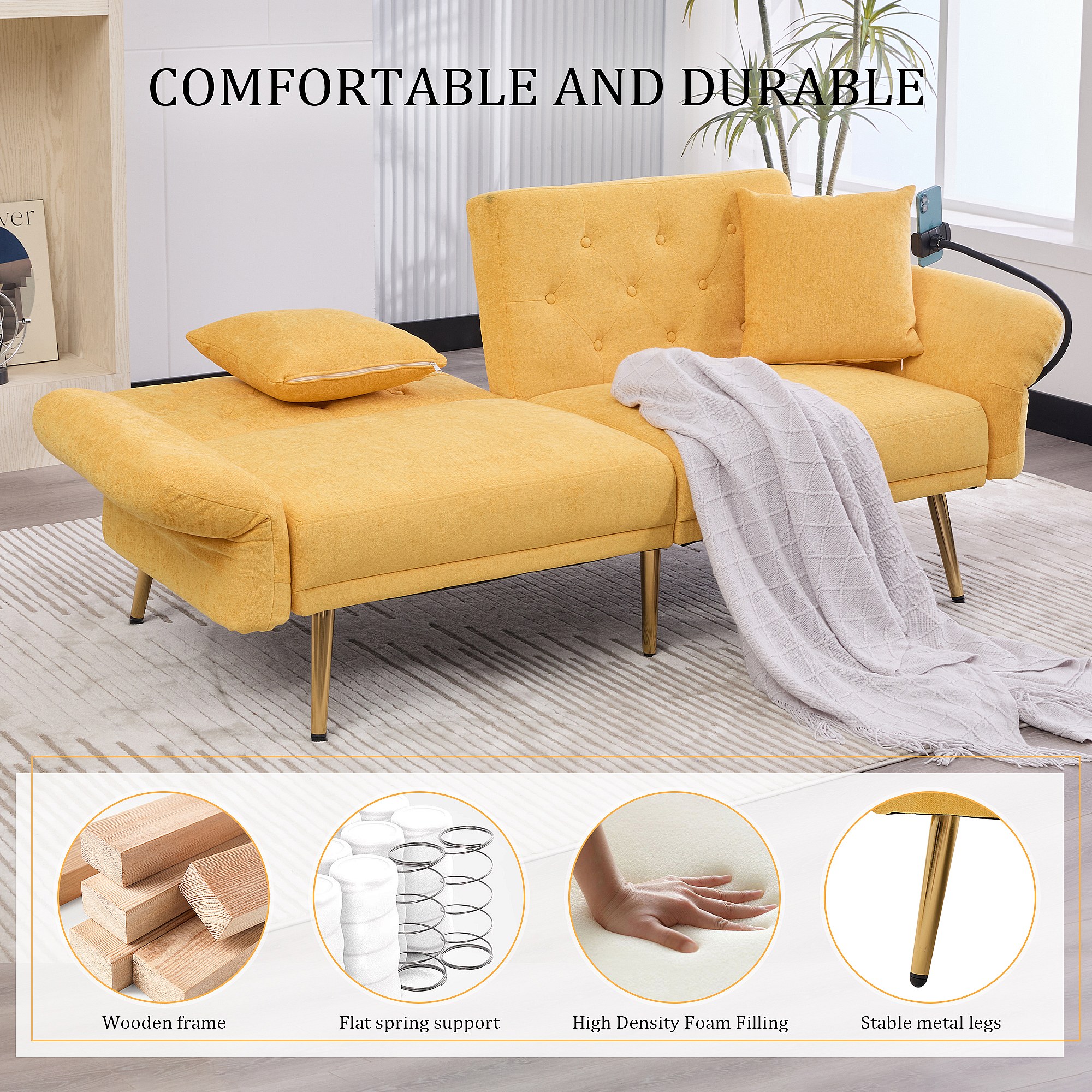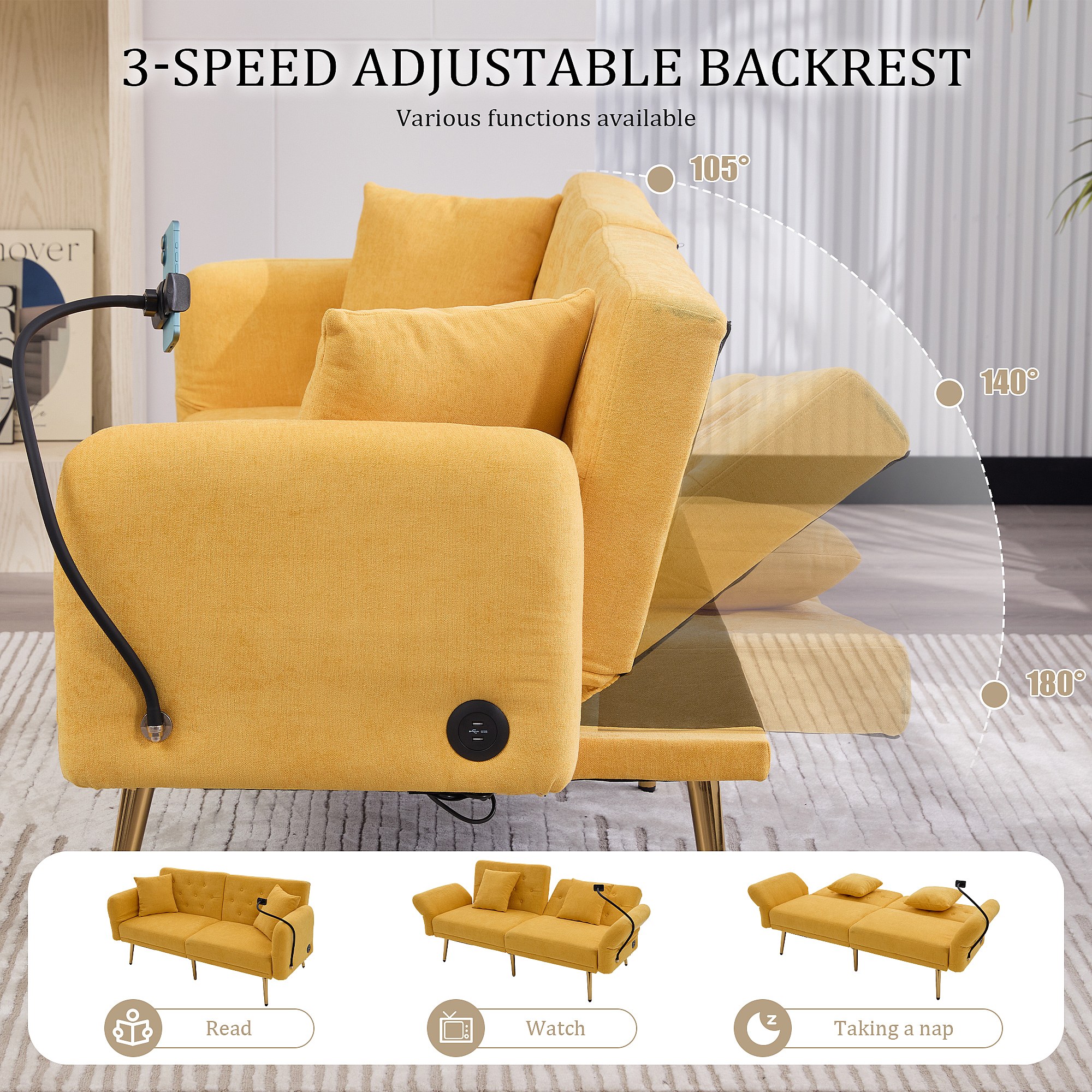 Canapé convertible 2 places en chenille - Ports USB intégré - Support de téléphone intégré - Dossier réglable - Jaune - Pratique pour salon, chambre ou bureau