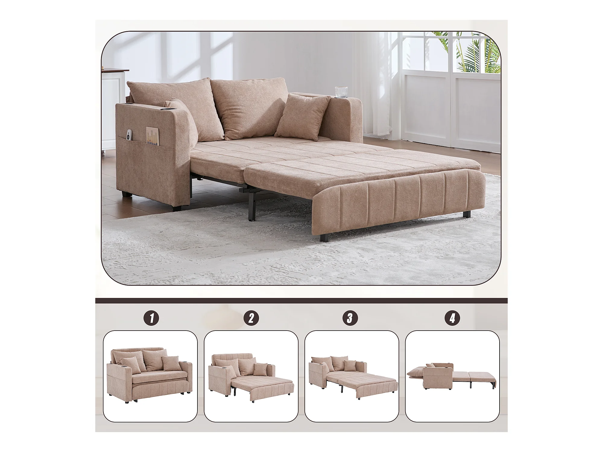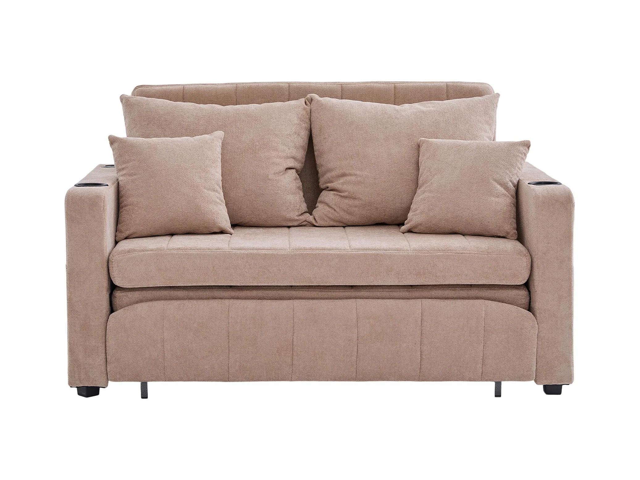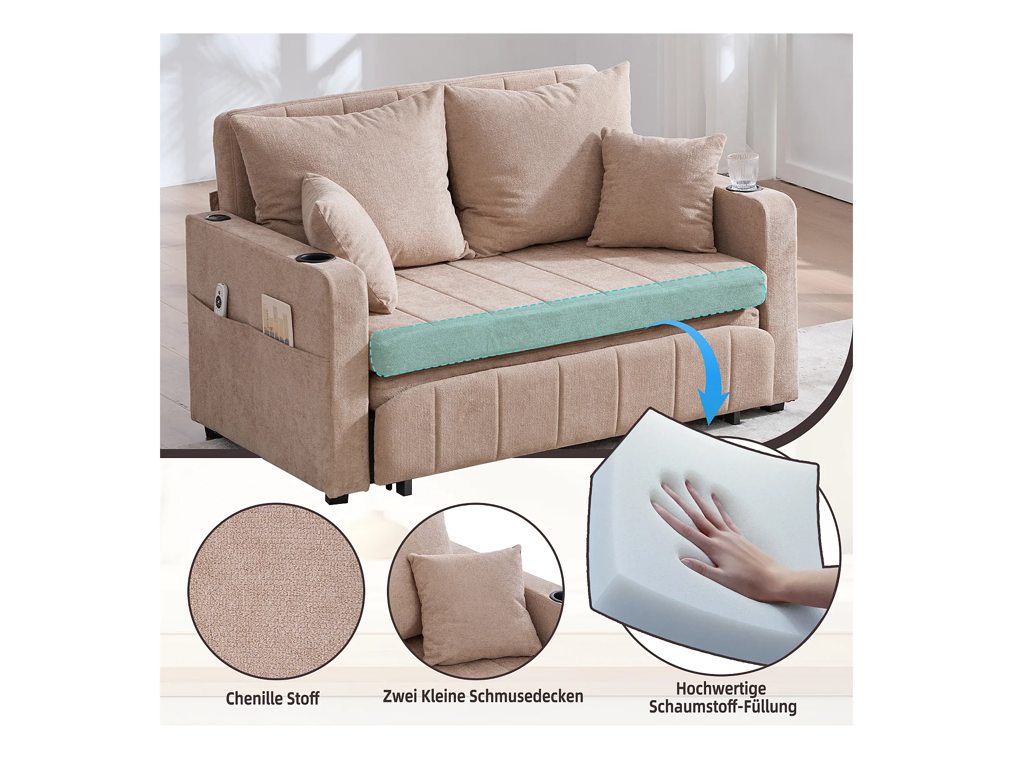 Canapé convertible 2 places en chenille taupe - Canapé-lit avec accoudoirs porte-gobelets - port USB intégré - Idéal pour petit espace ou bureau