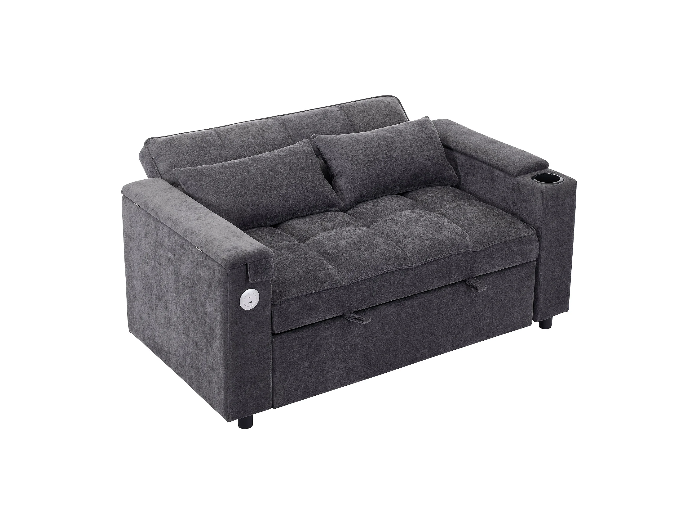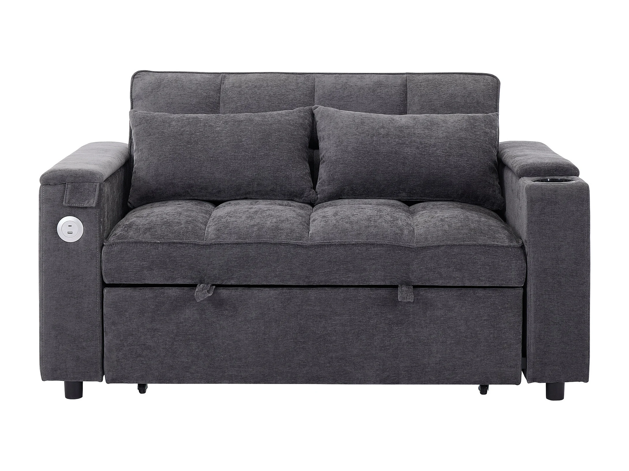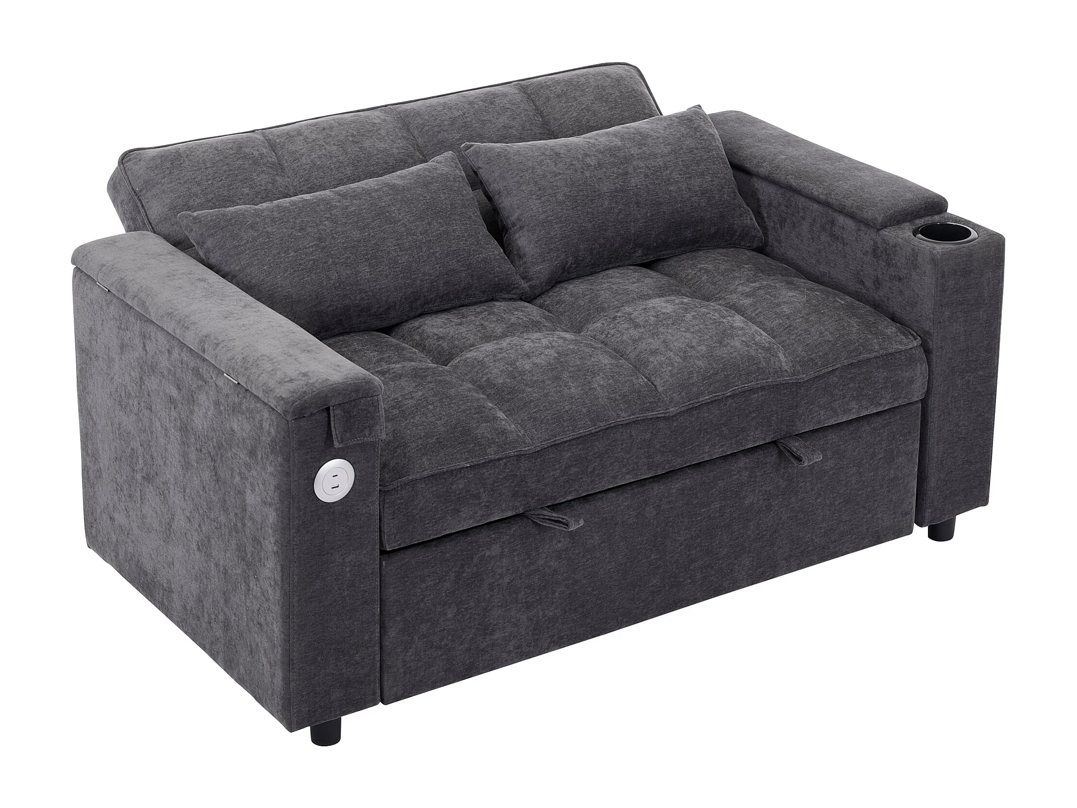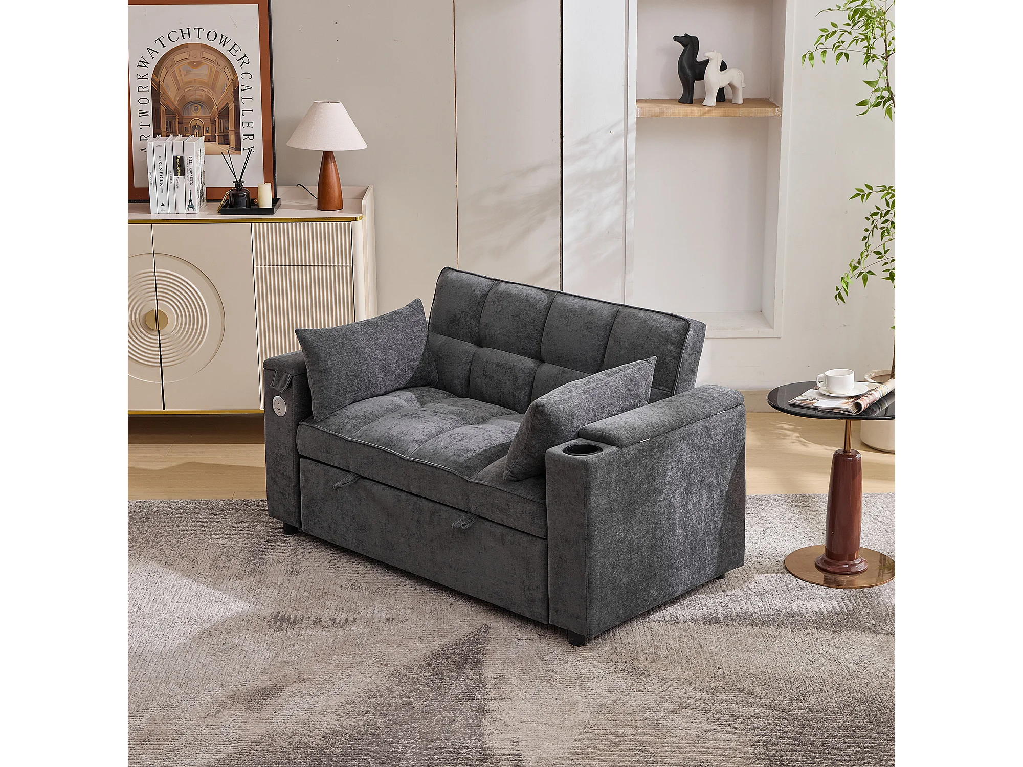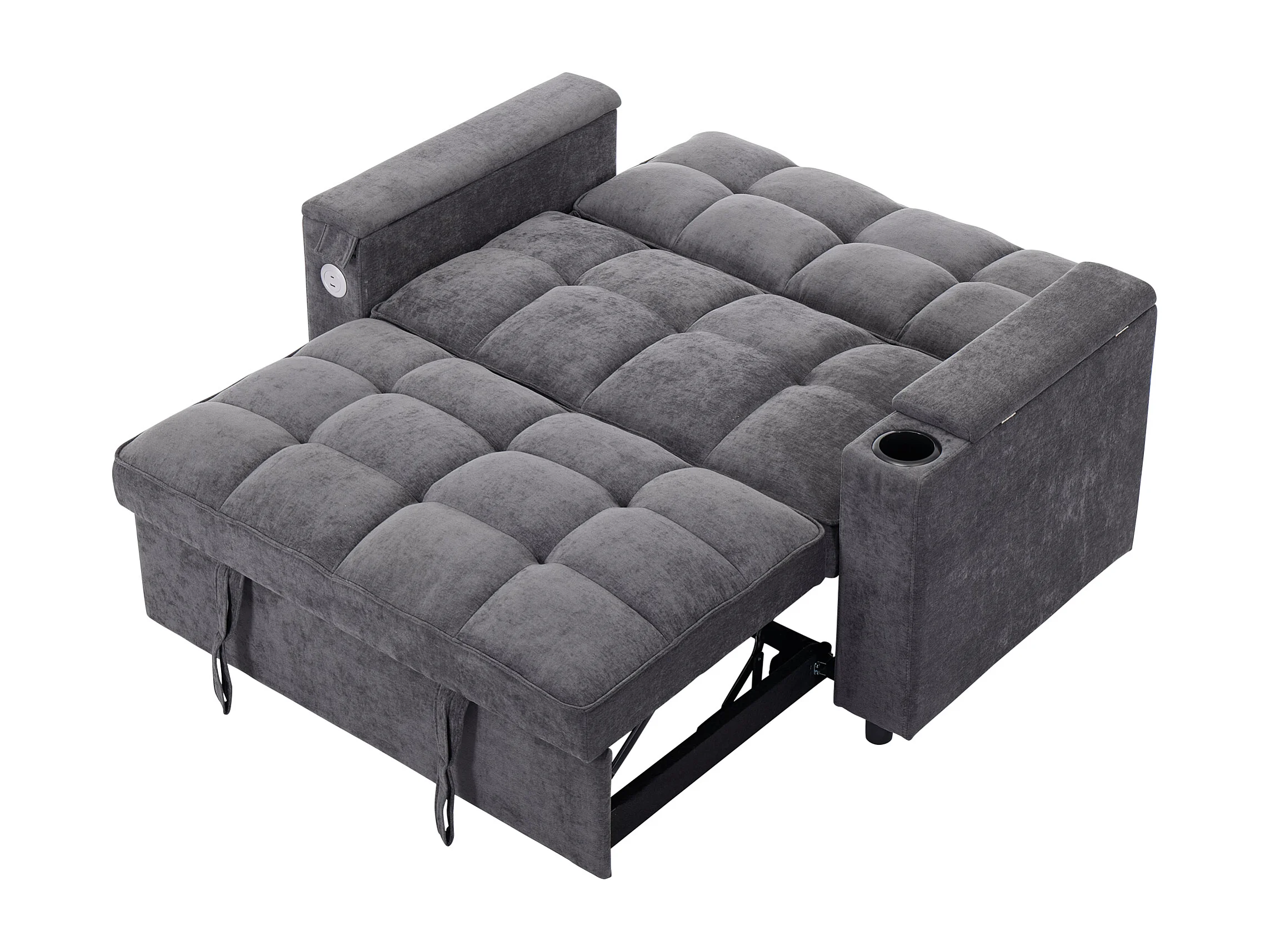 Canapé convertible 2 places en tissu gris - Avec dossier réglable, ports USB et tablette d’appoint