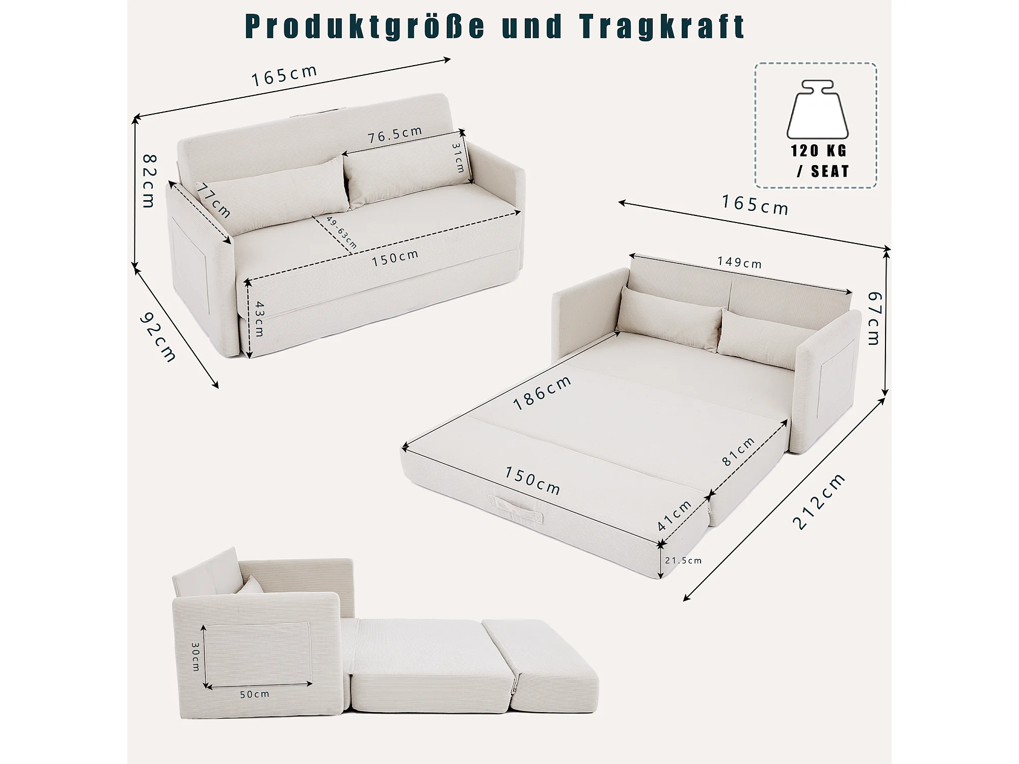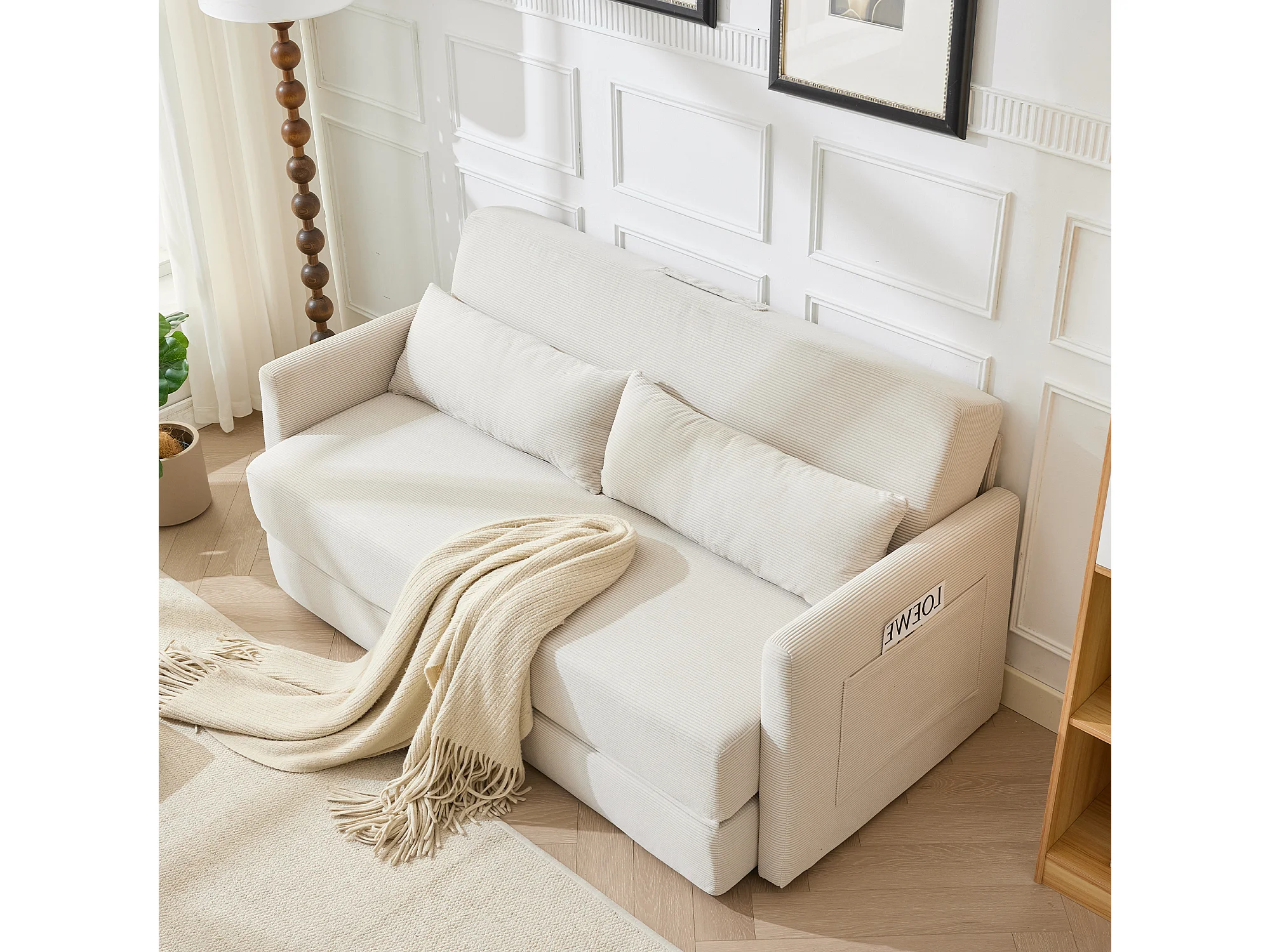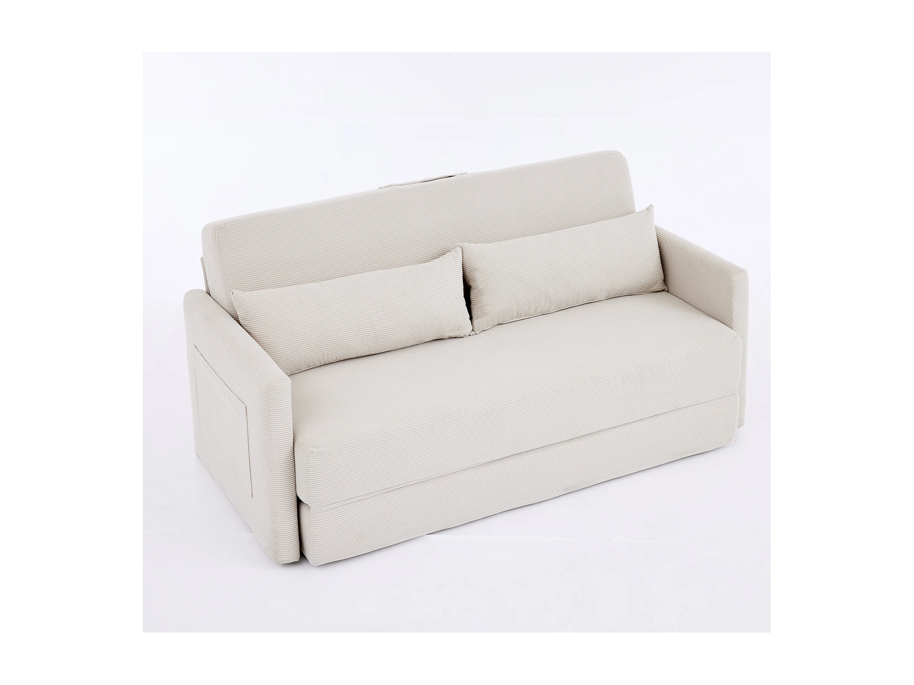 Canapé convertible 2 places en tissu velours côtelé avec 2 poches et 2 coussins - Beige