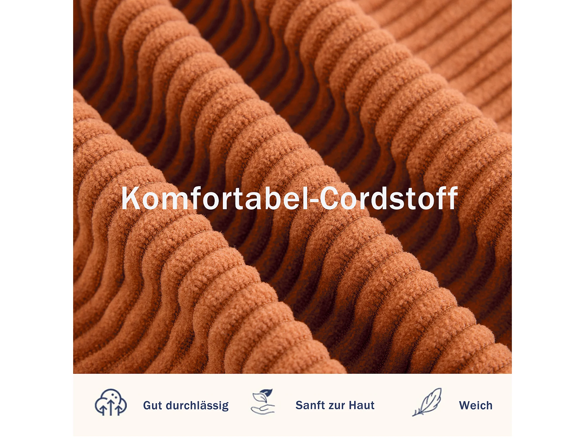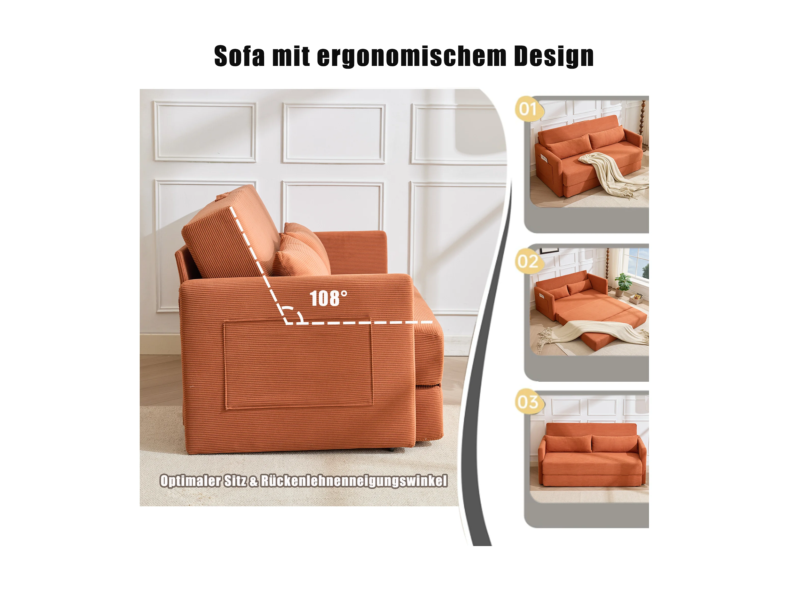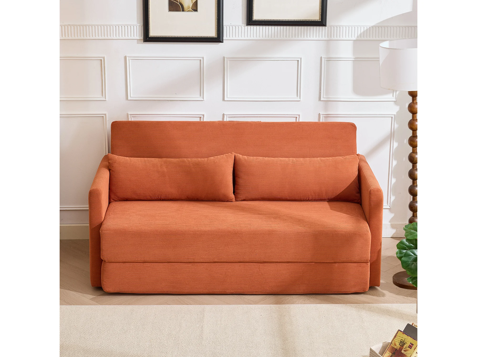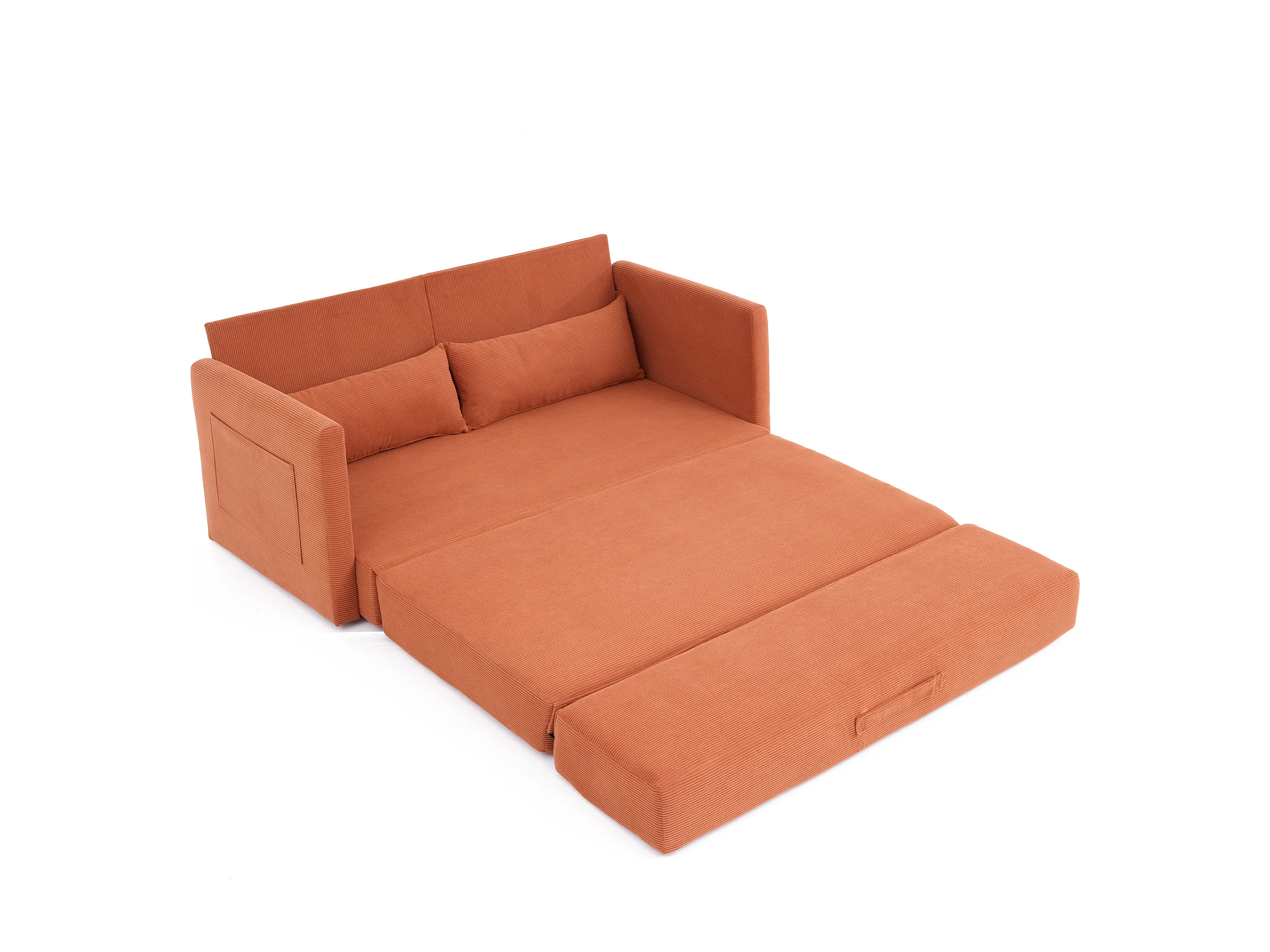 Canapé convertible 2 places en tissu velours côtelé avec 2 poches et 2 coussins - Orange