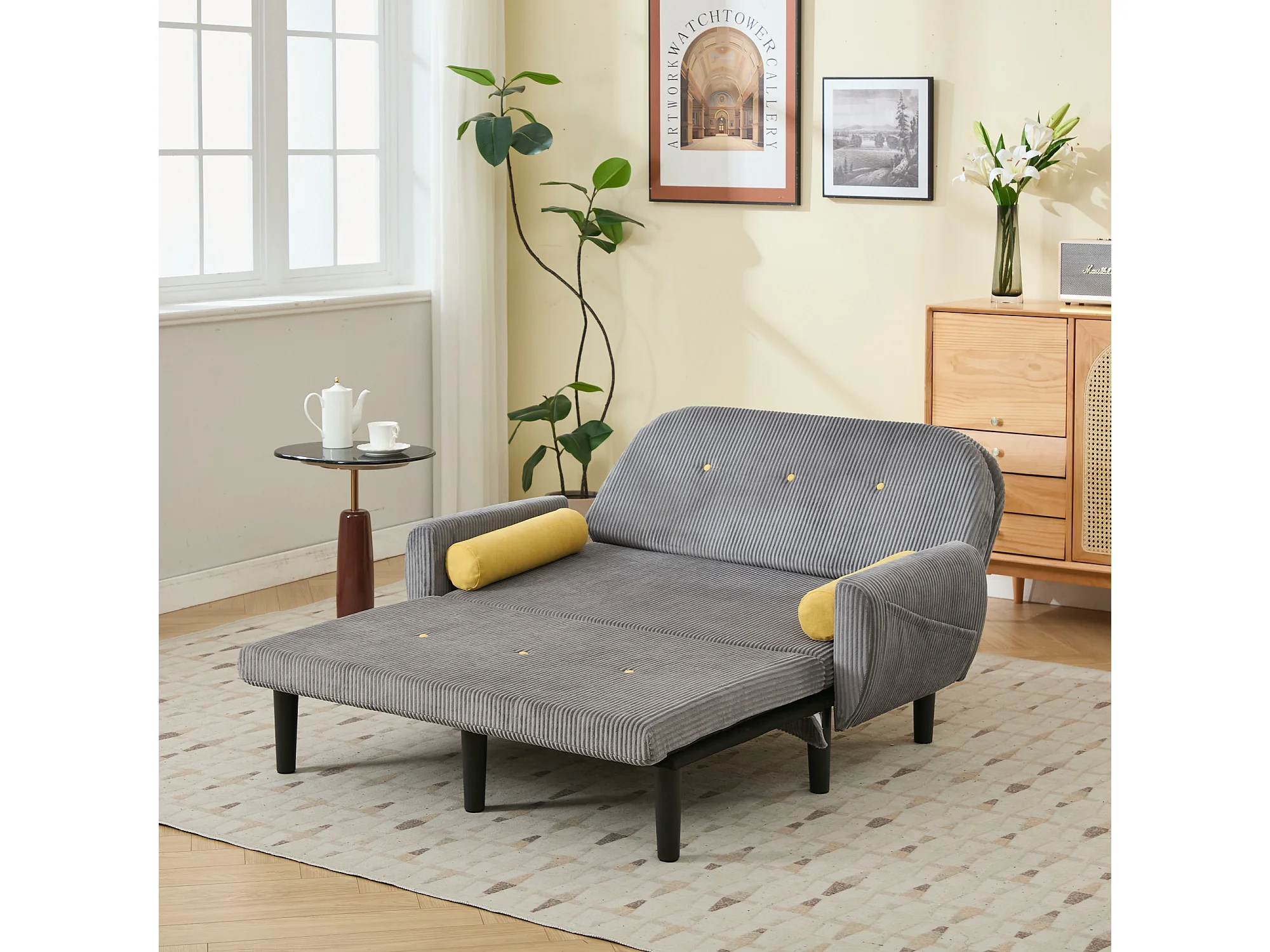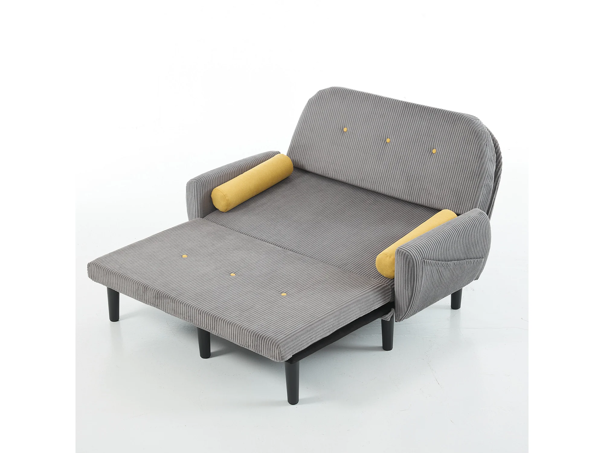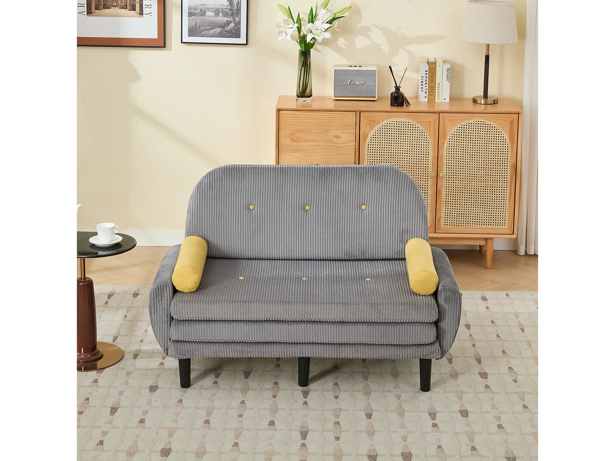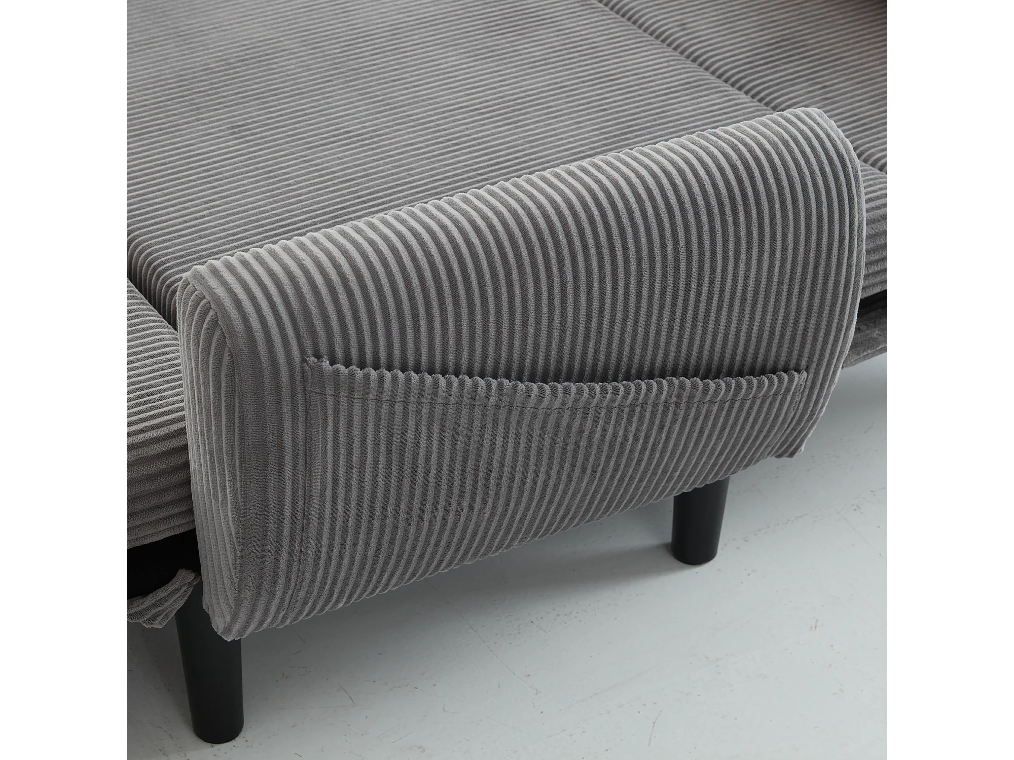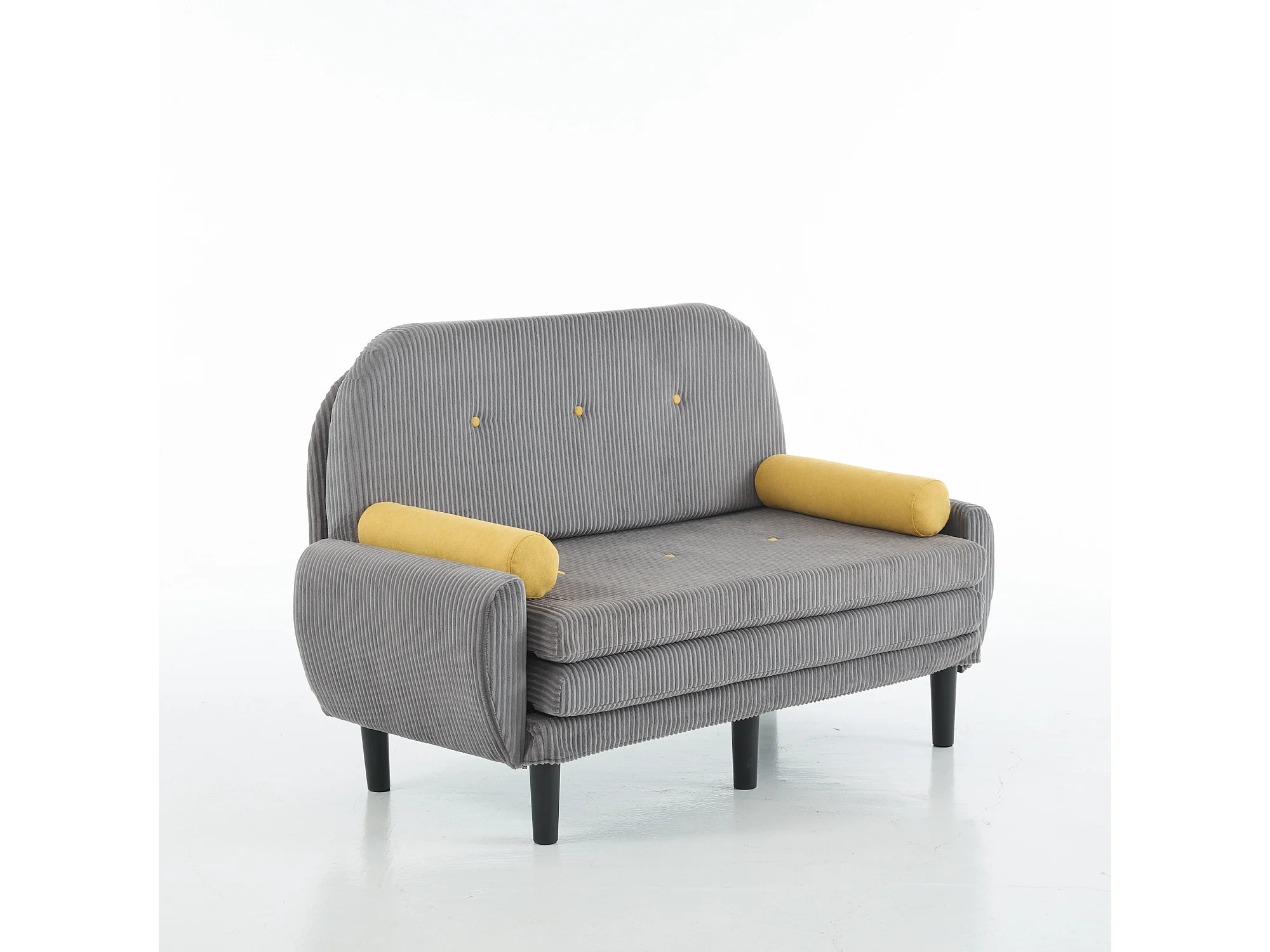 Canapé convertible 2 places en velours côtelé gris avec 2 coussins ronds