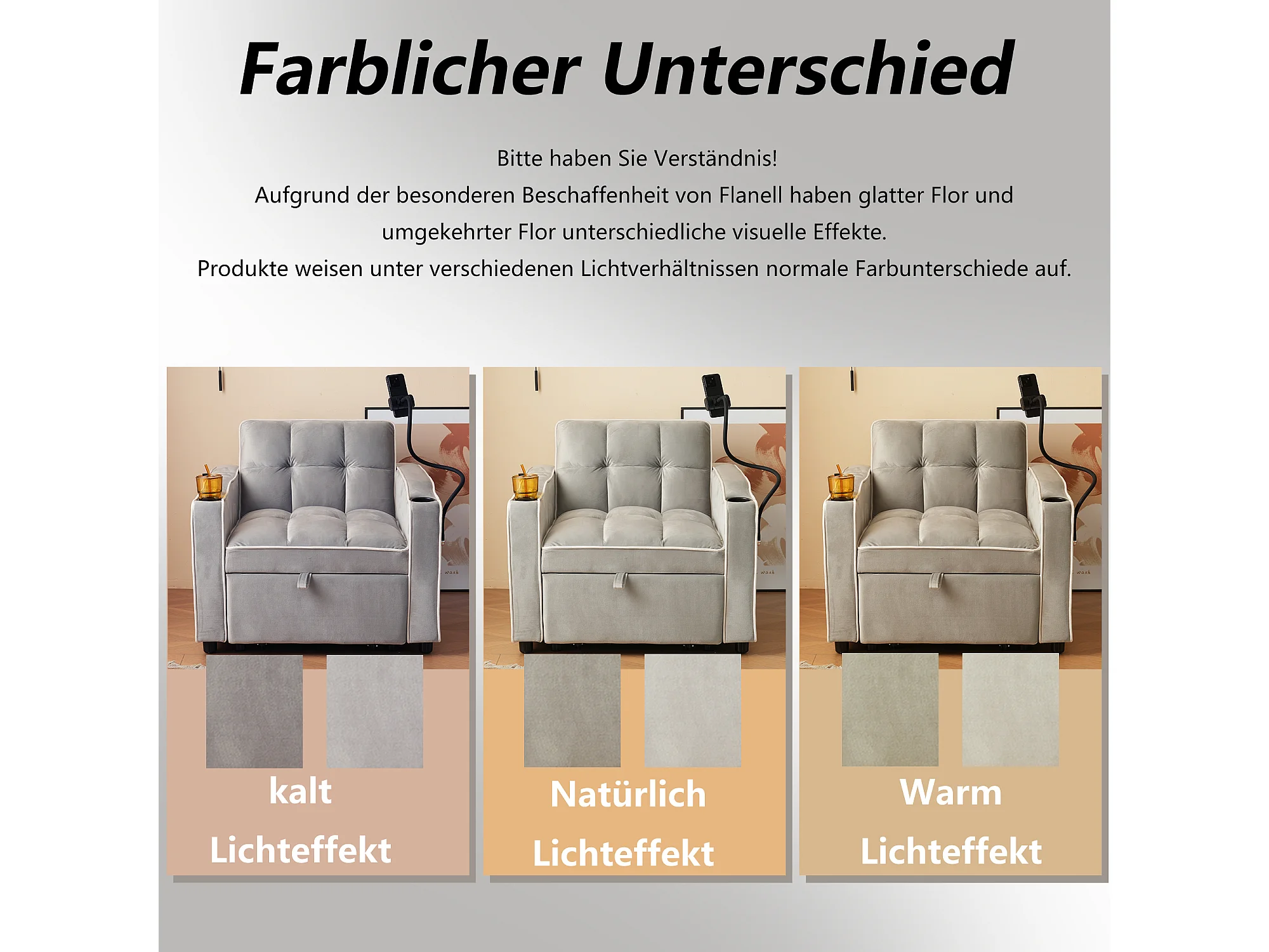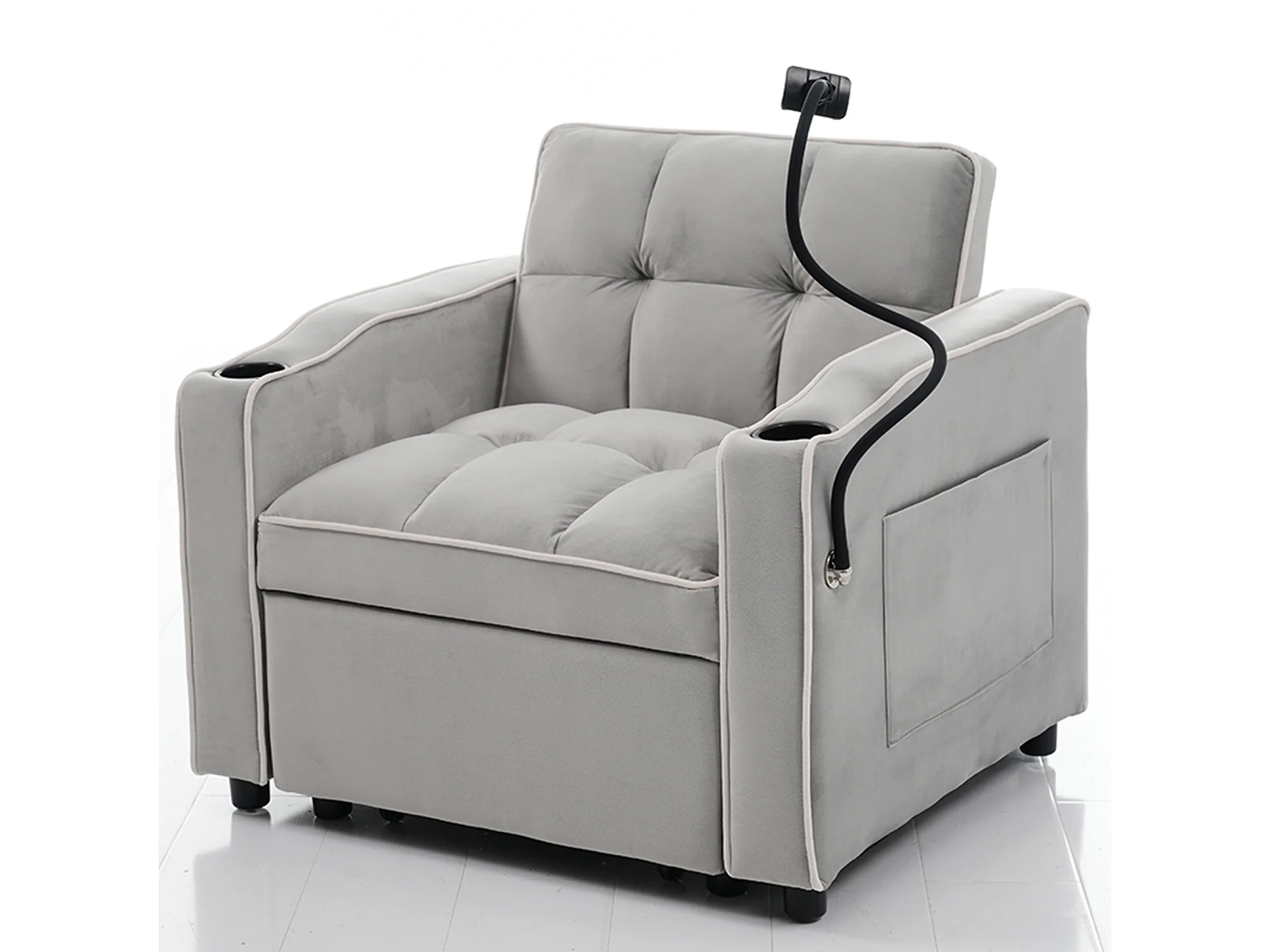 Canapé convertible 3-en-1 avec porte-gobelets et support de téléphone, en velours, gris antique (83x167x76 cm)