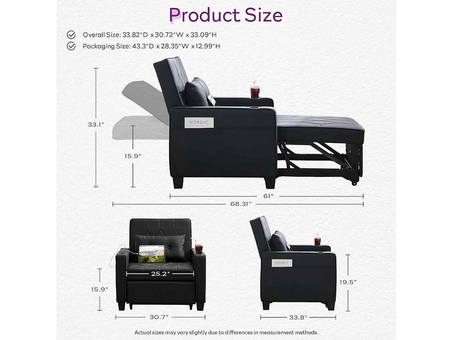 Canapé Convertible 3 en 1 Fauteuil-lit avec Fonction Lit avec Coussin et Sac Convertible Canapés pour Salon Cadre en Bois Fauteuil Style Moderne Noir