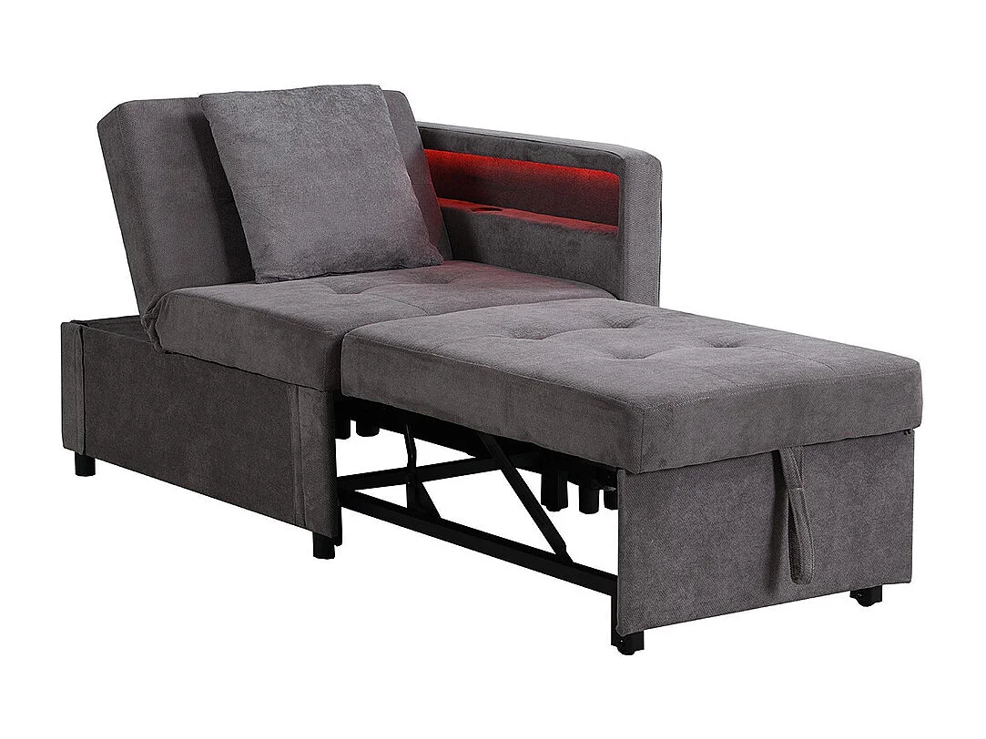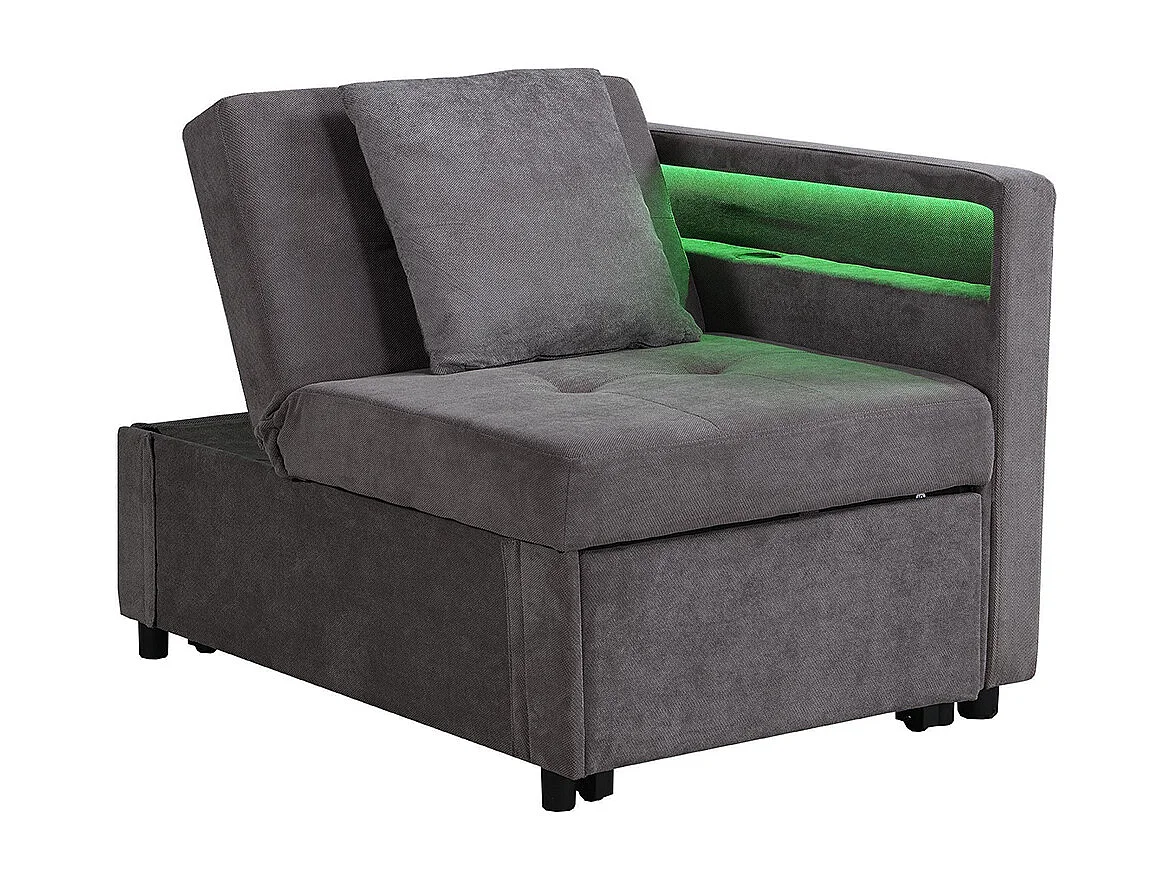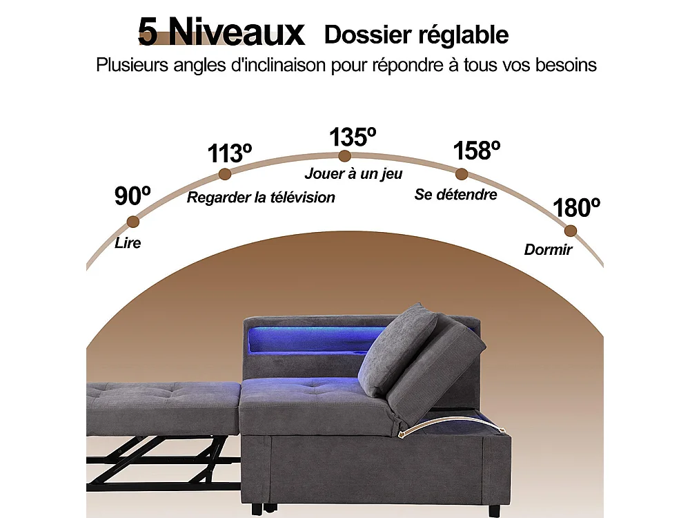 Canapé convertible 3 en 1 rembourré multifonctionnel tissu lin dossier réglable accoudoirs LED ports USB Type C pour petites pièces gris foncé