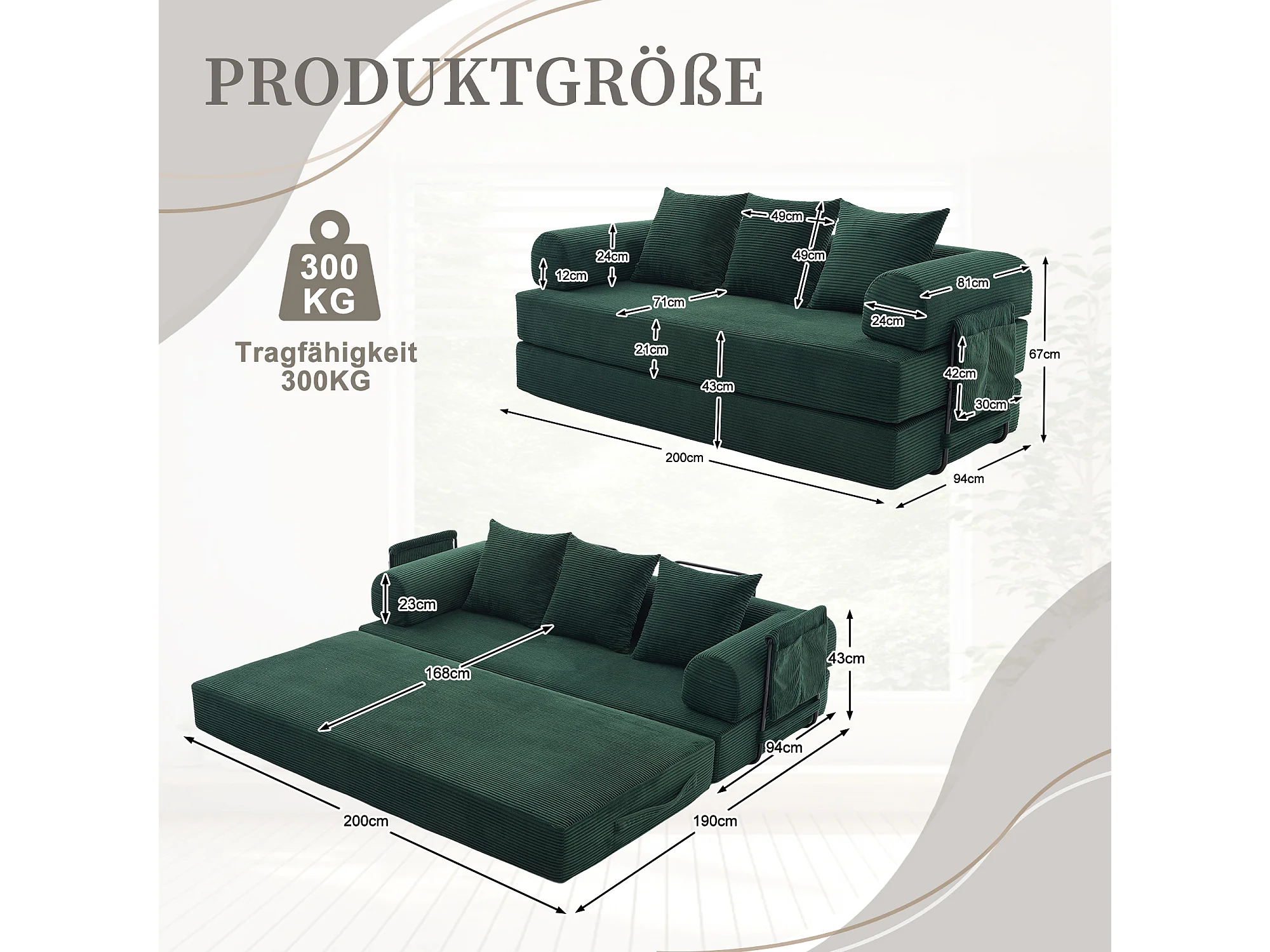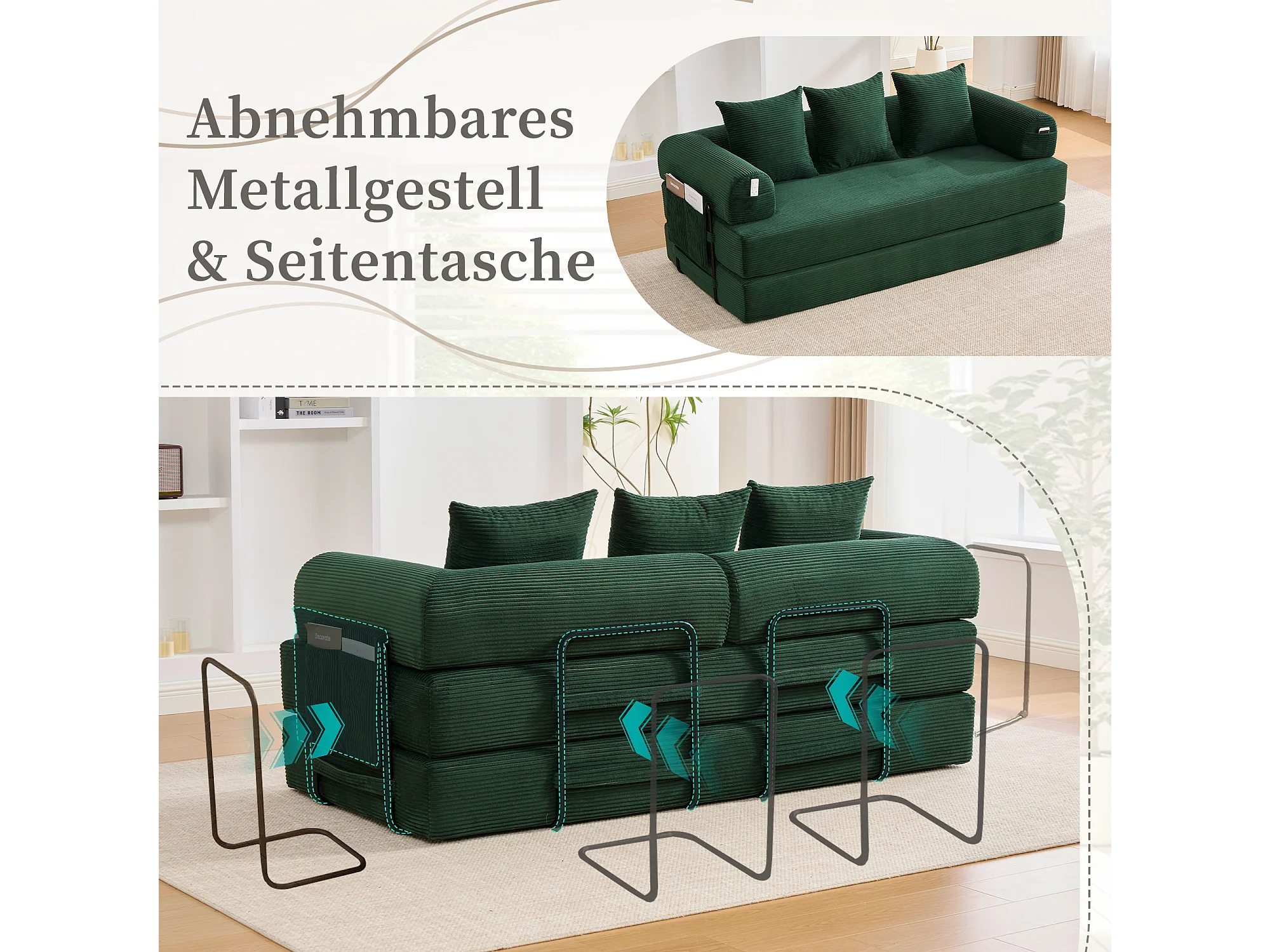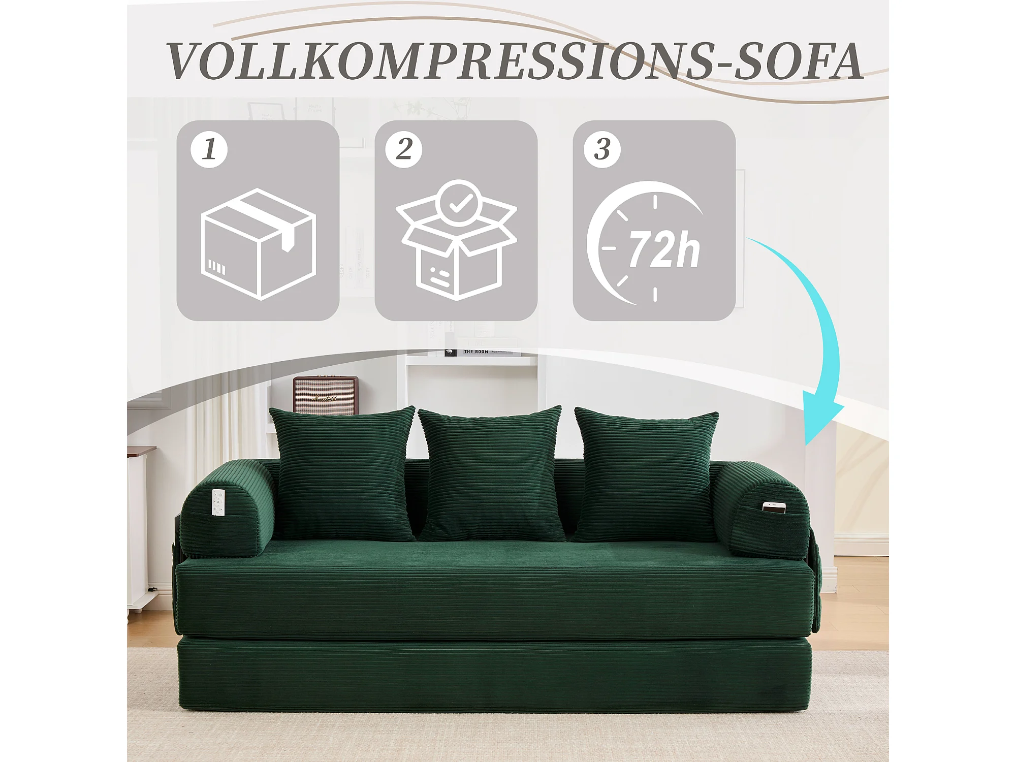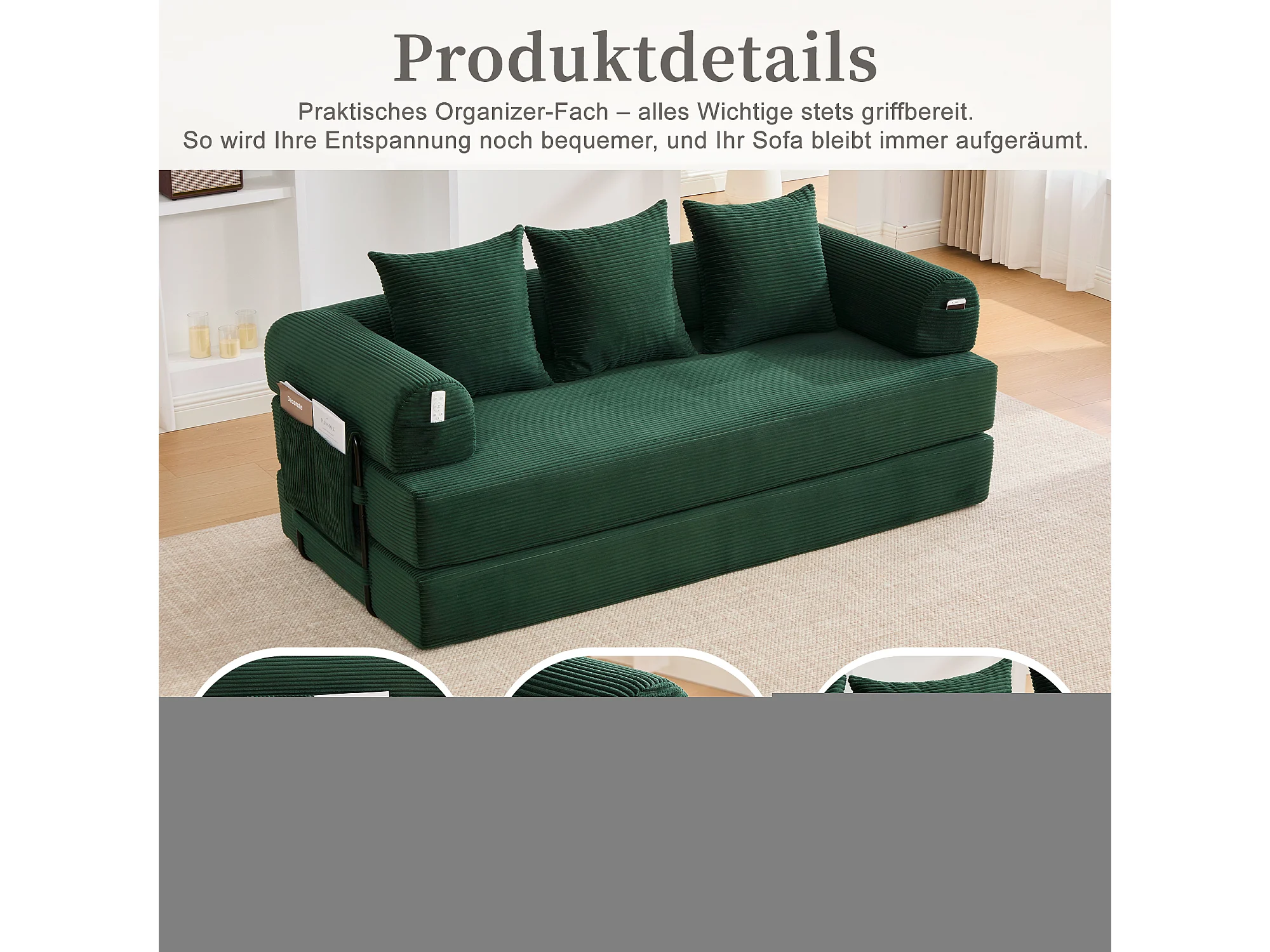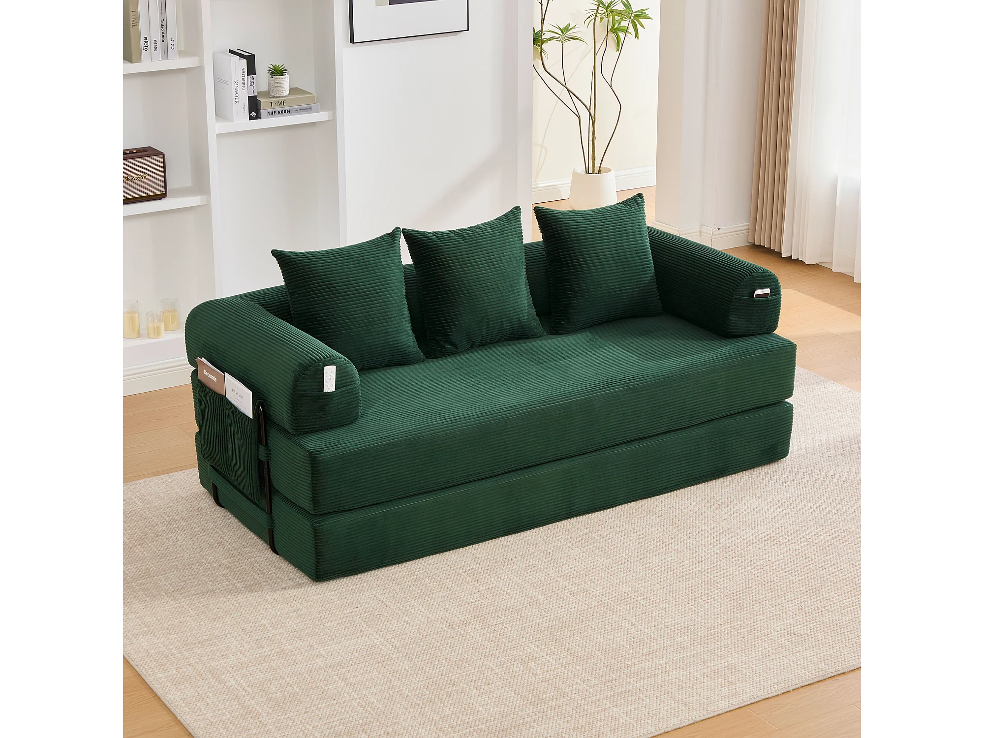 Canapé convertible 3 places - 200 x 94 x 67 cm - avec poches latérales + 3 coussins - velours - vert