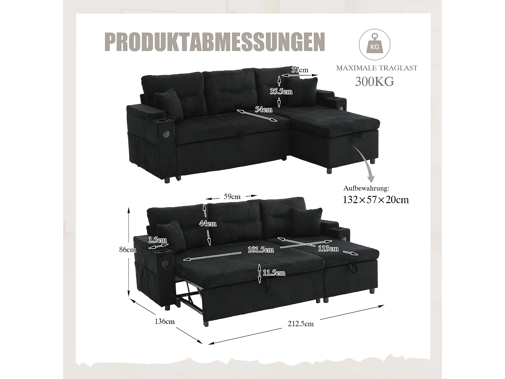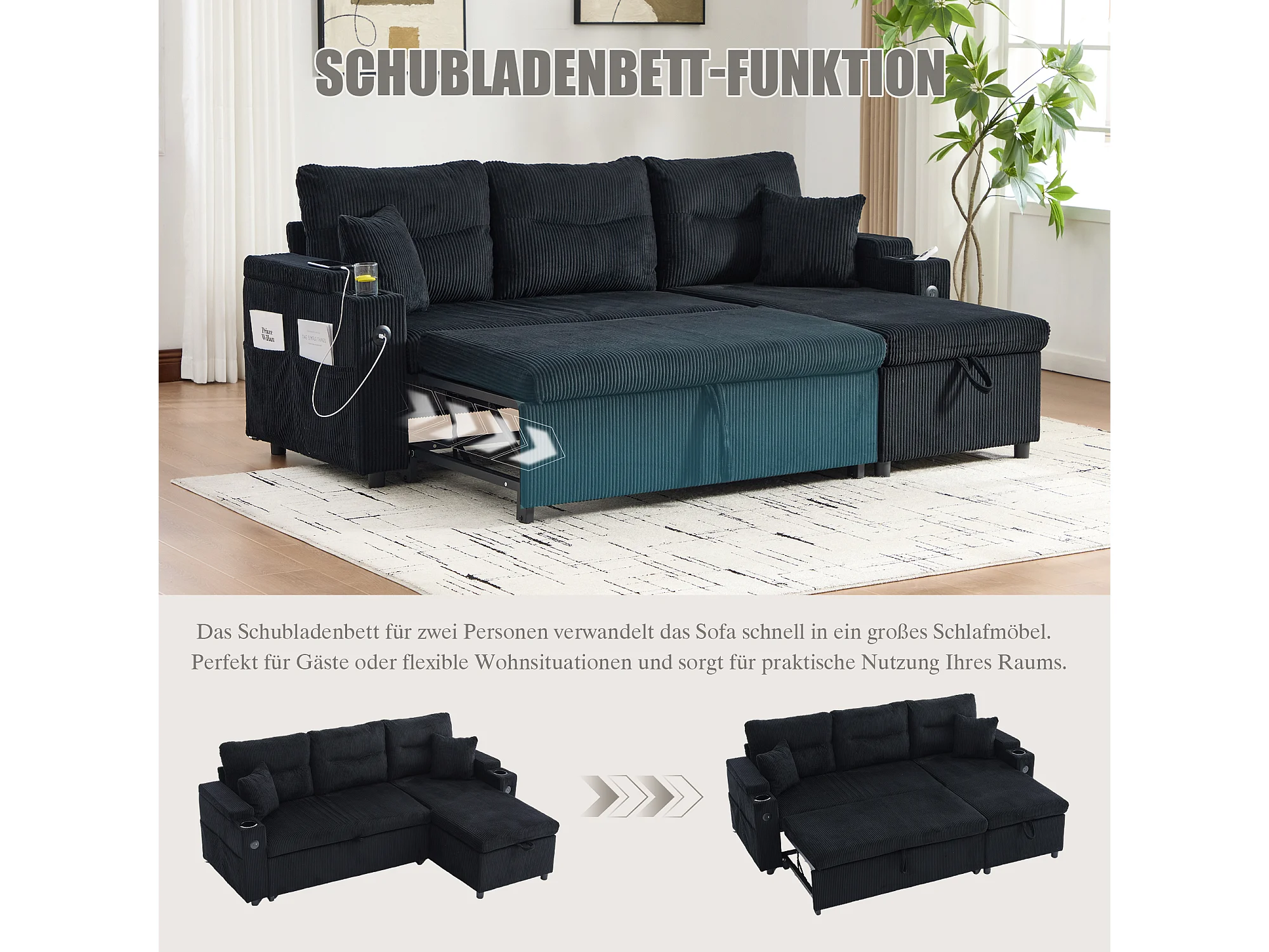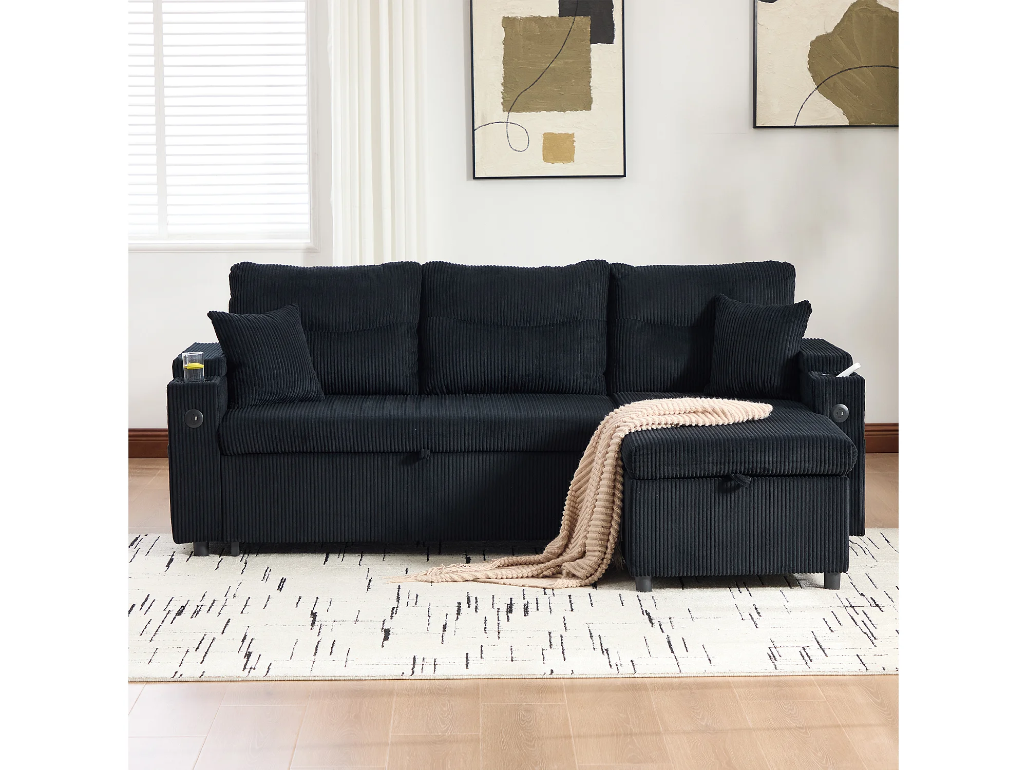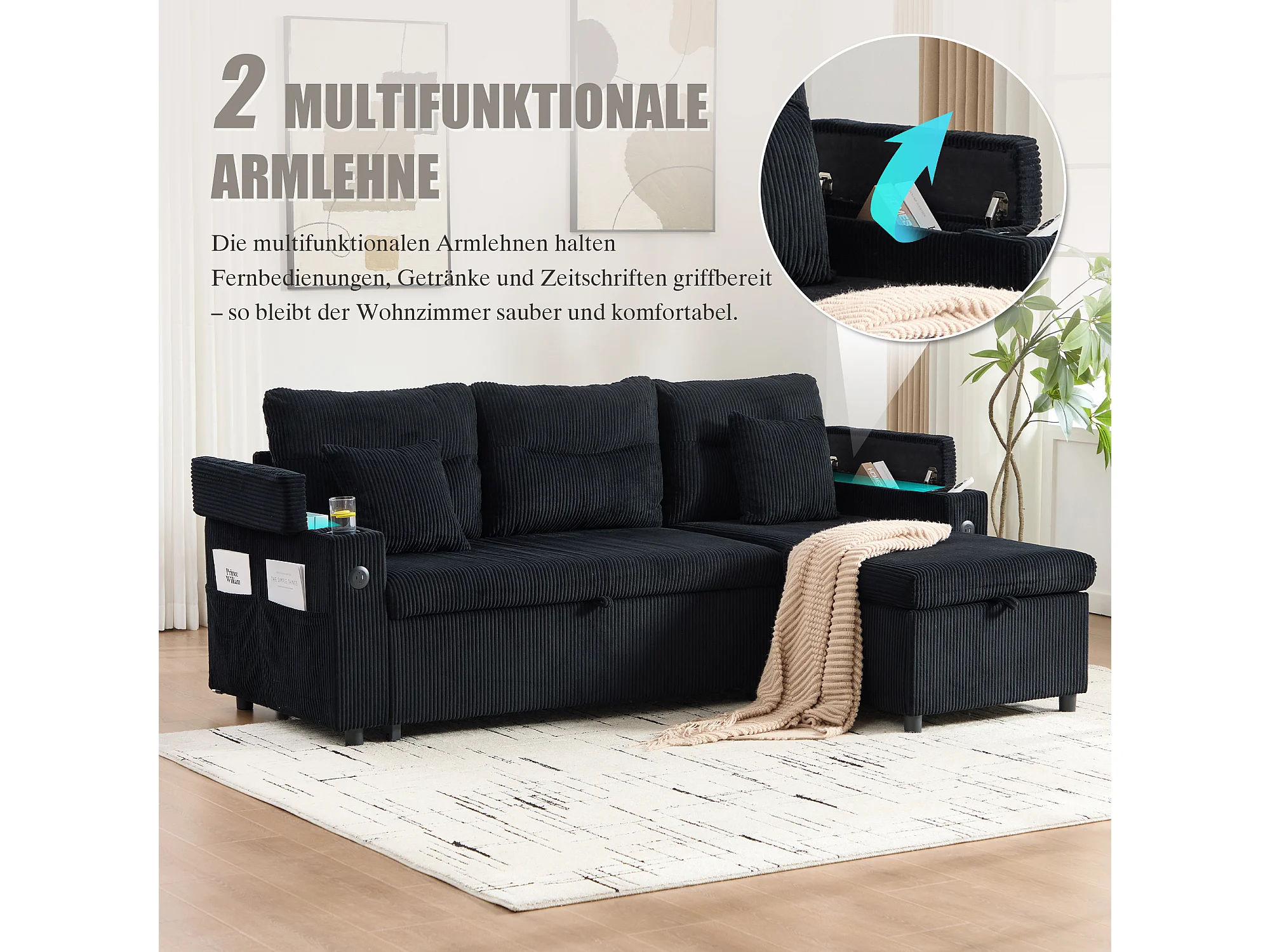 Canapé convertible 3 places - 212.5 x 136 x 86 cm - avec porte-gobelets + USB + rangement - canapé gigogne - lin - noir