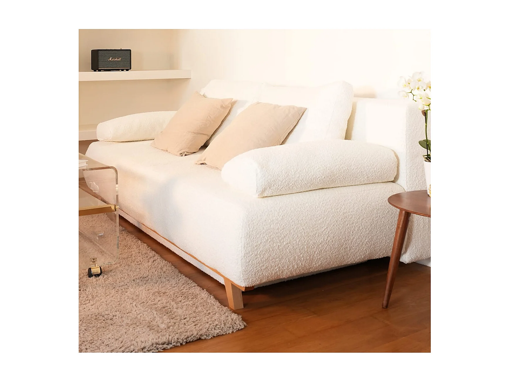 Canapé convertible 3 places avec coffre de rangement en tissu bouclé beige - Laria