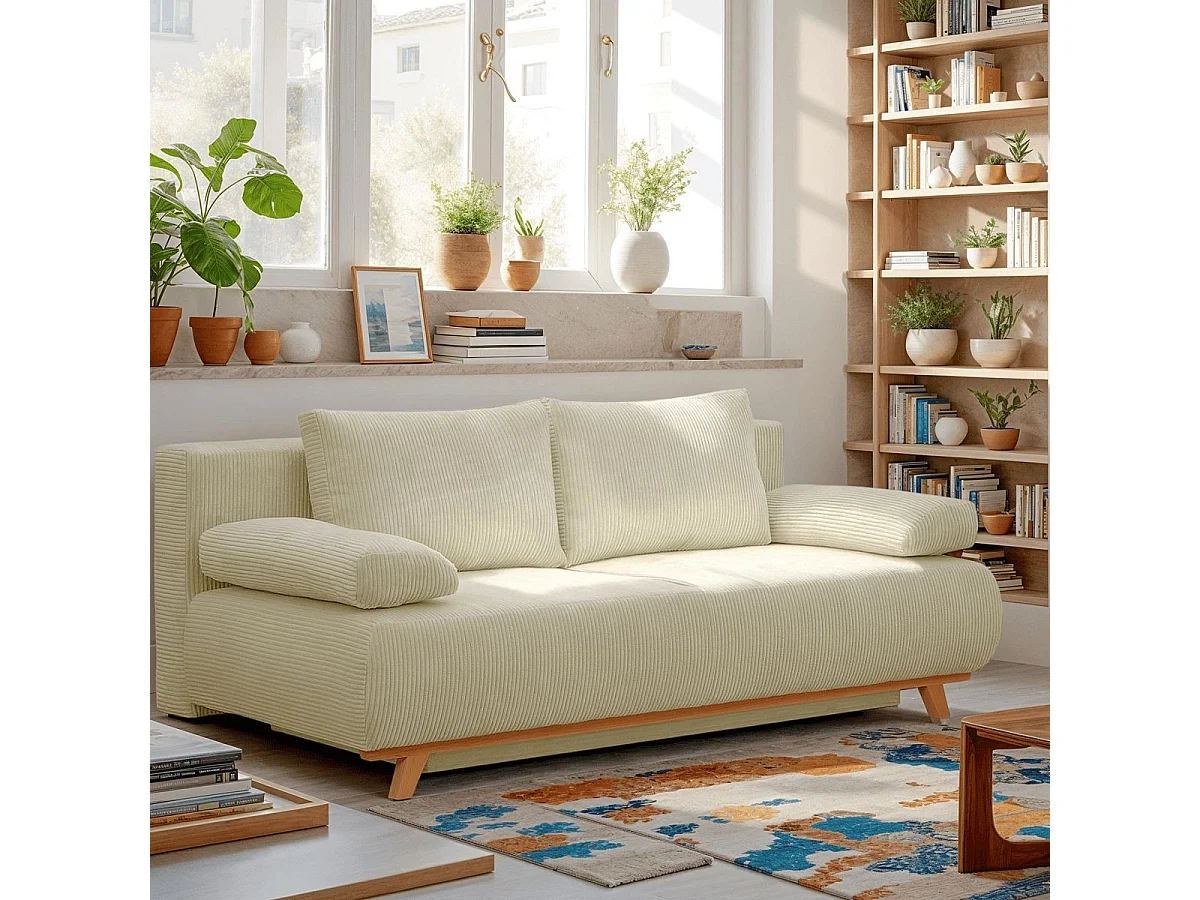 Canapé convertible 3 places avec coffre de rangement en velours côtelé beige - Laria