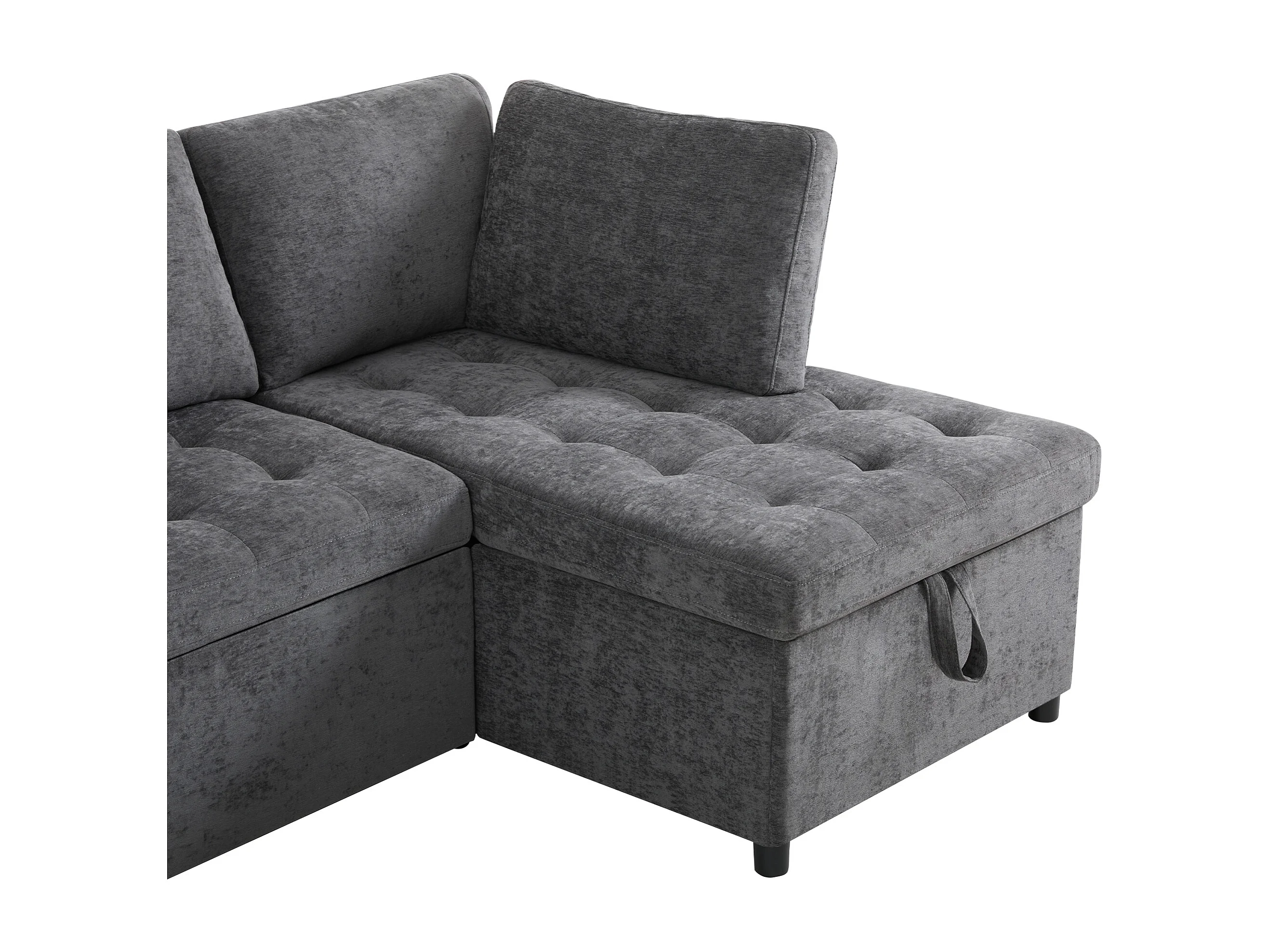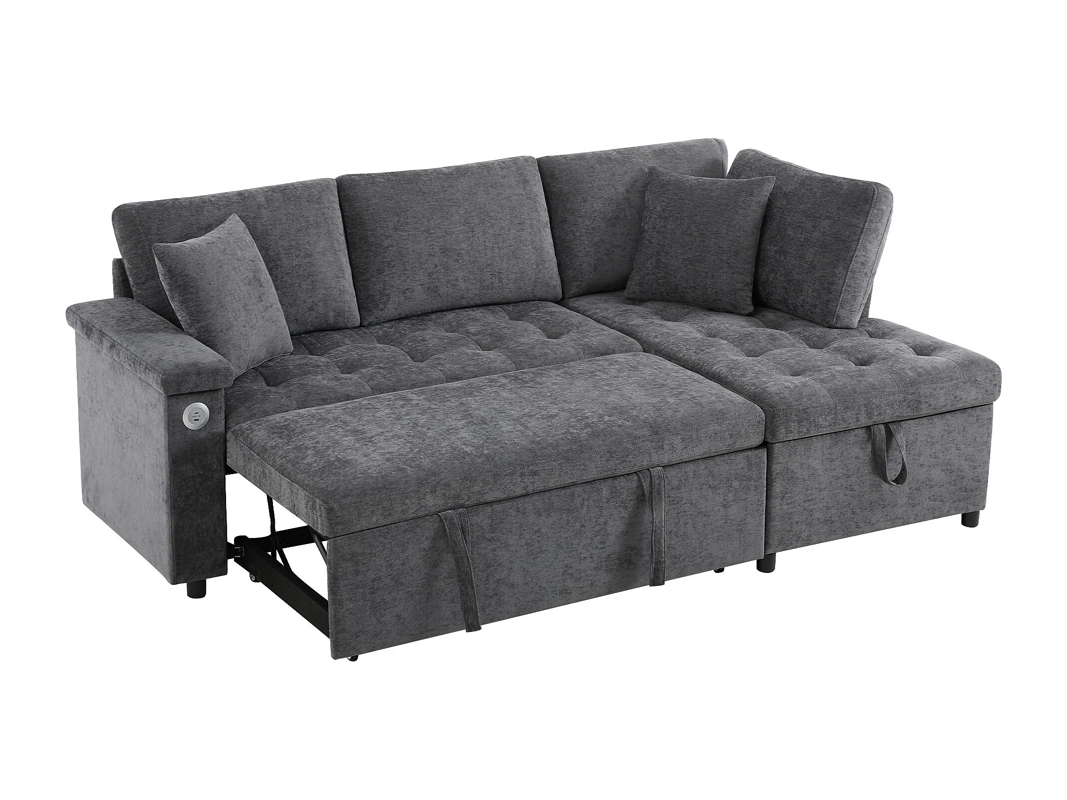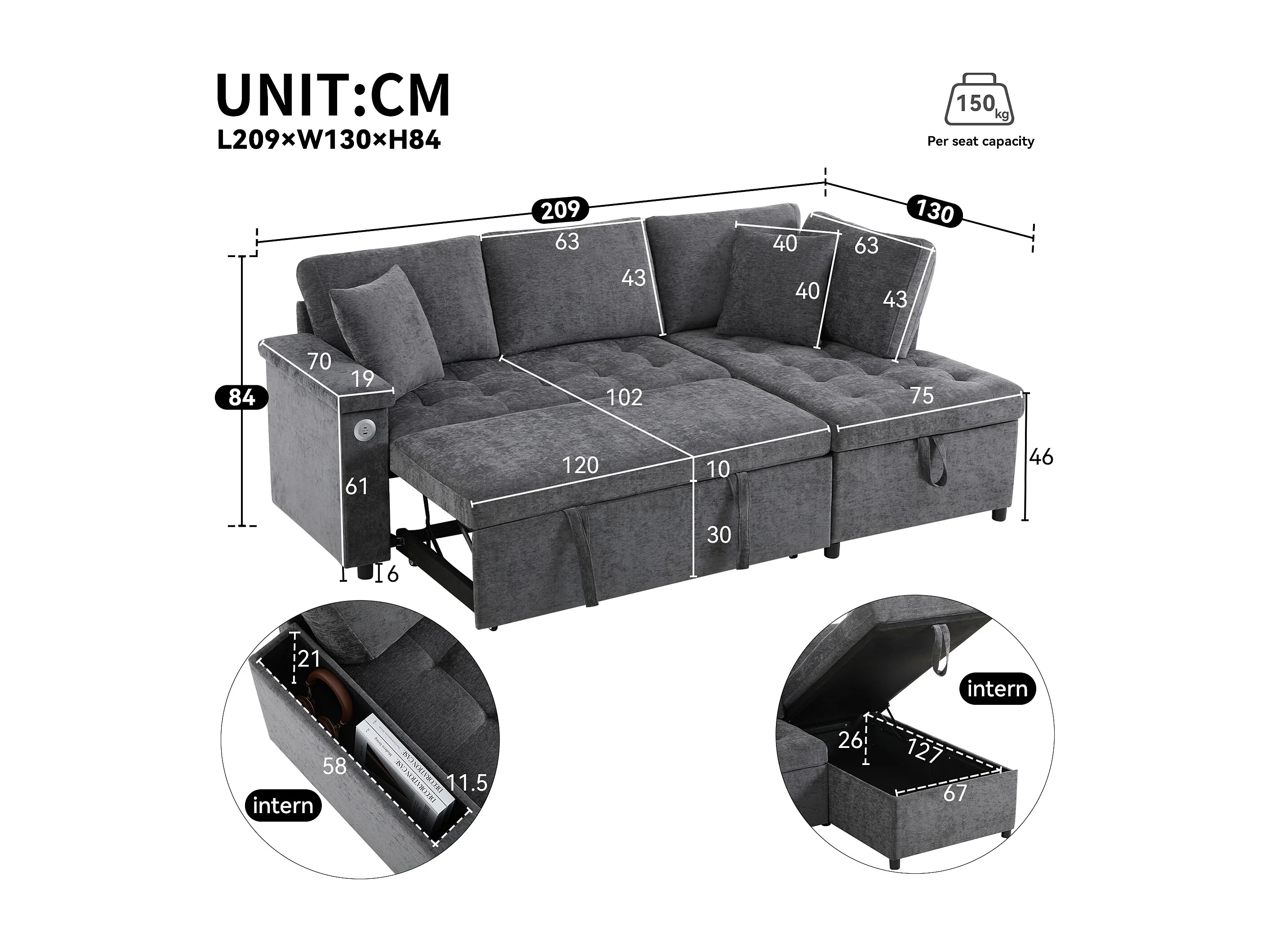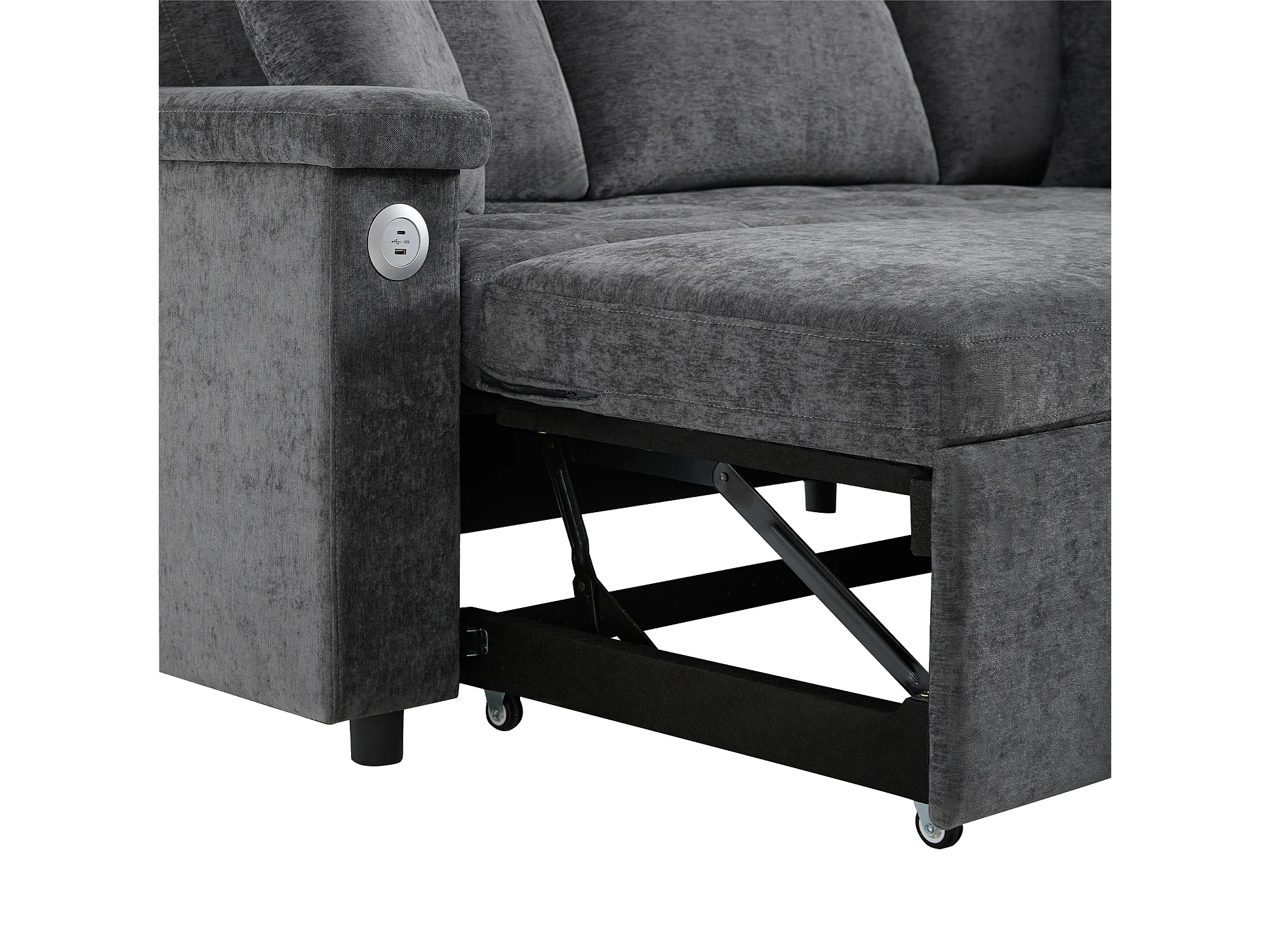 Canapé convertible 3 places avec rangements, USB et 2 coussins - Tissu chenille gris