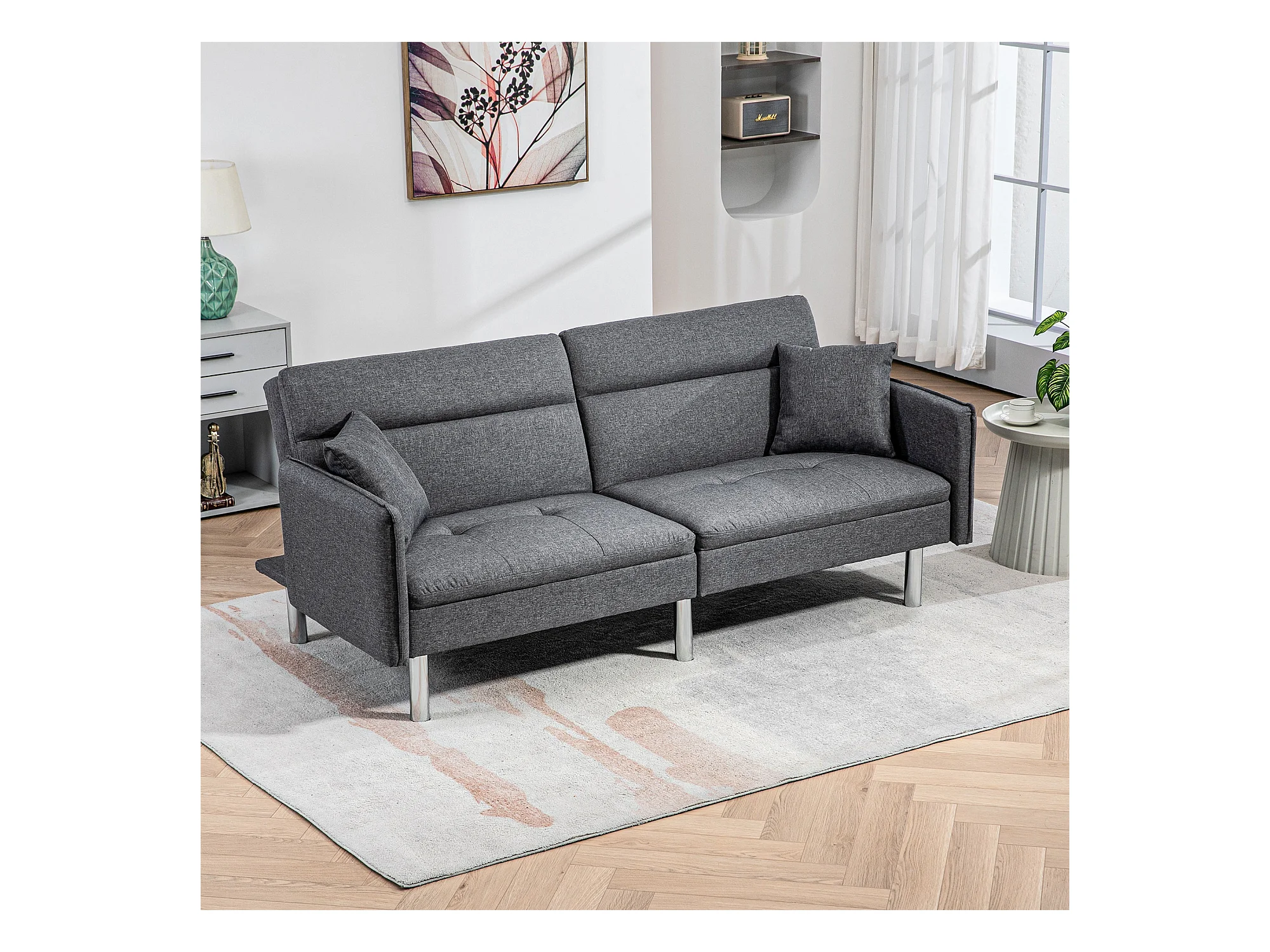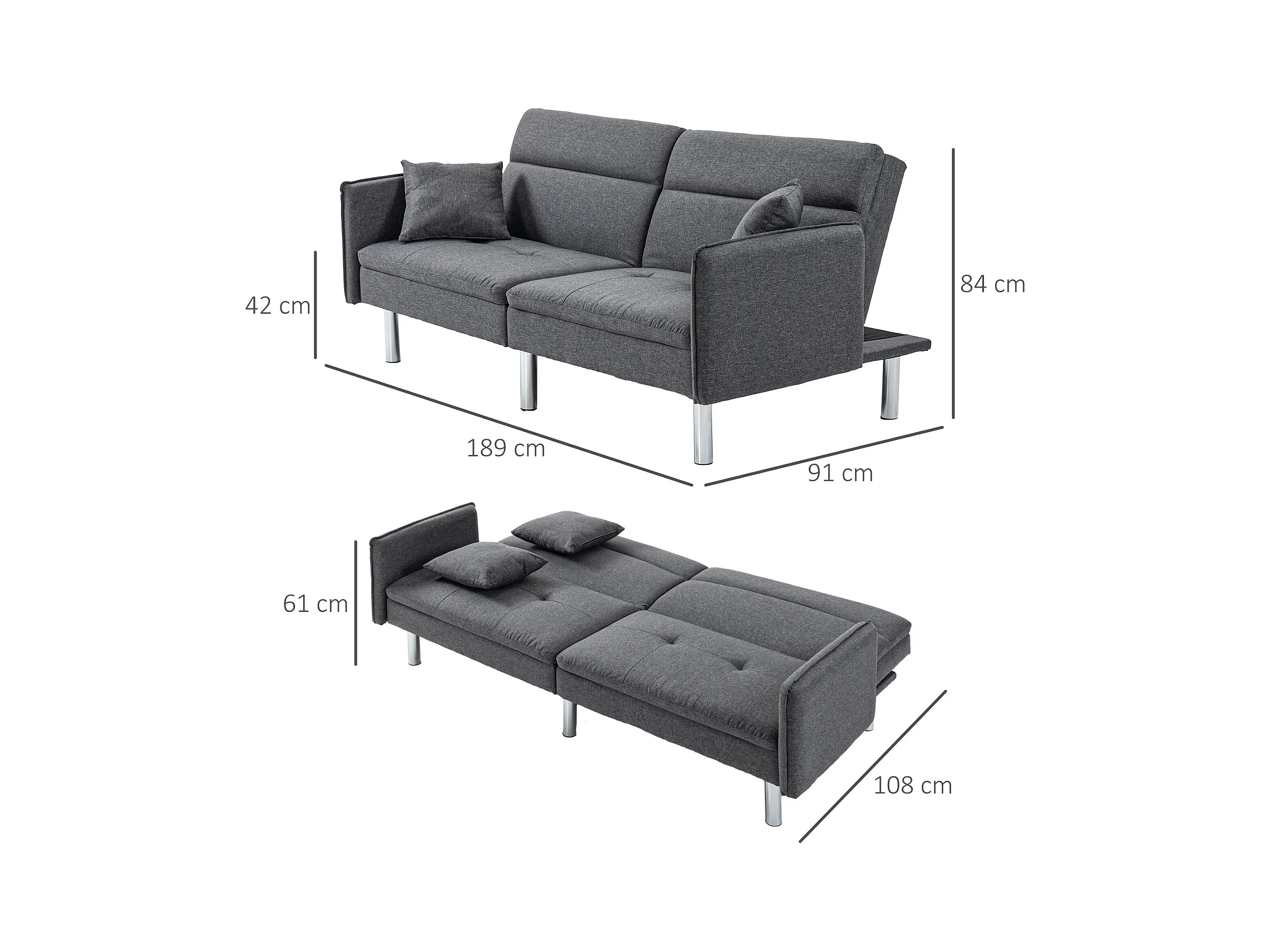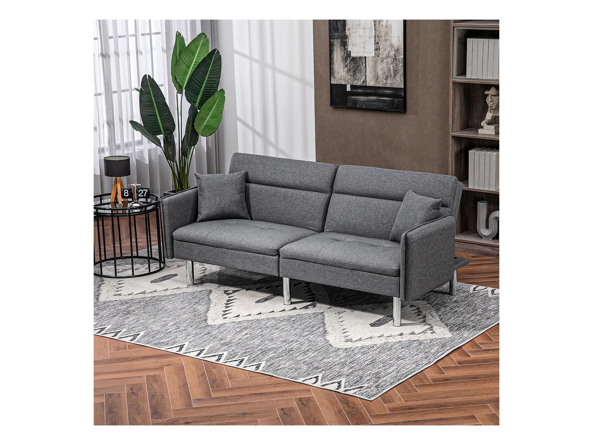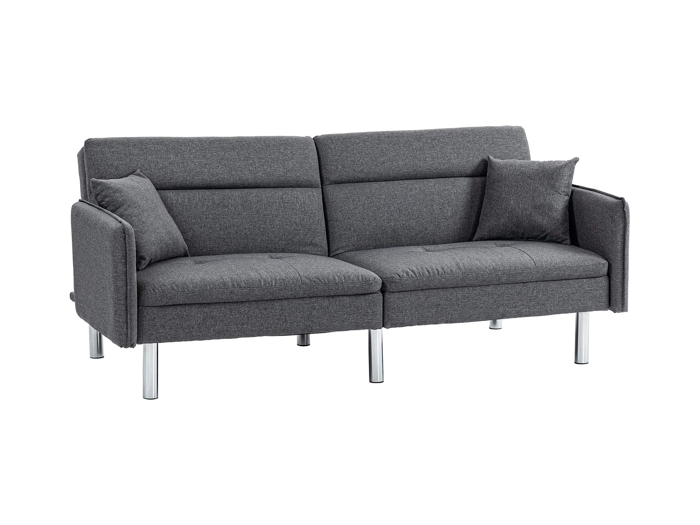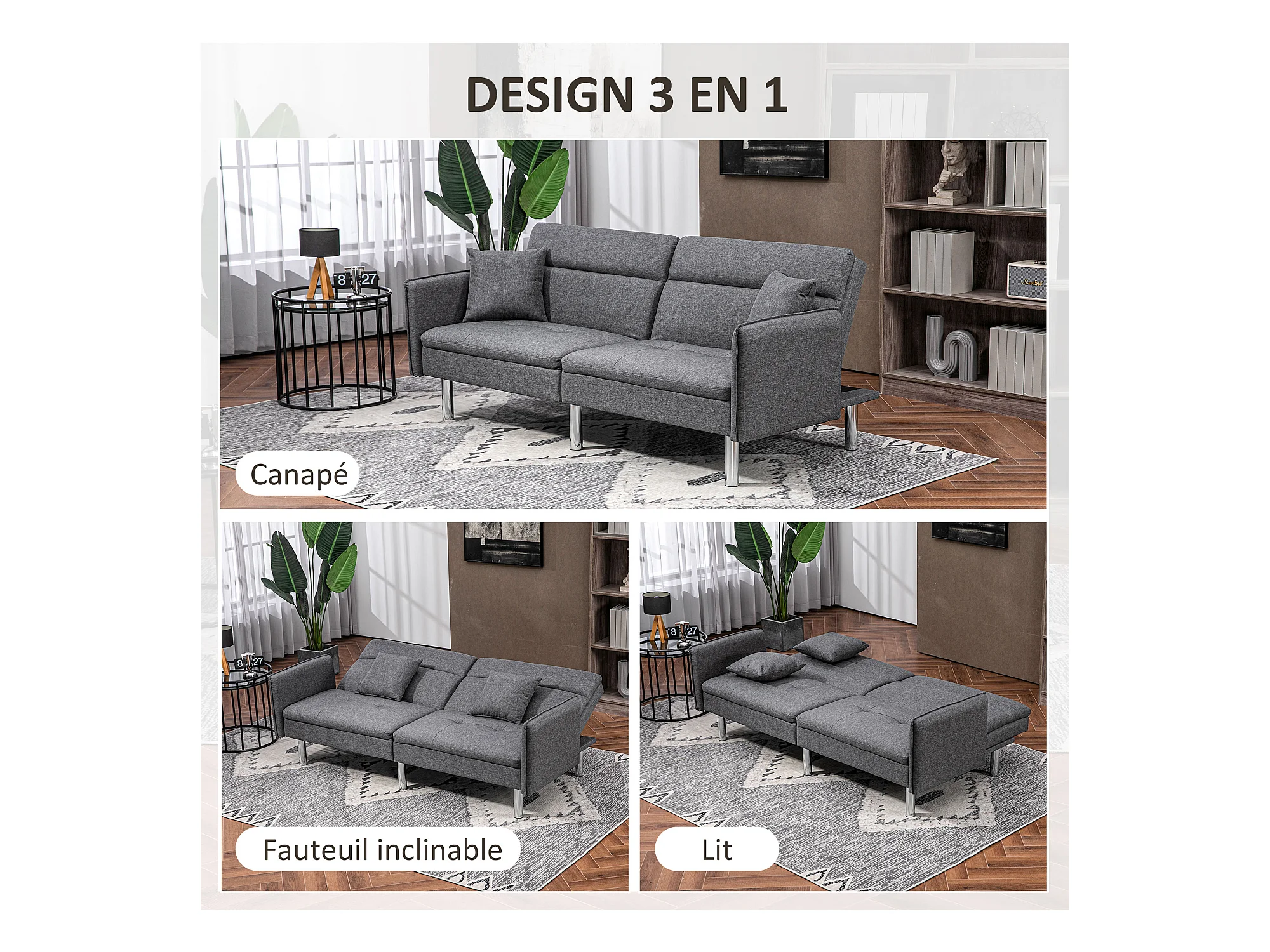 Canapé convertible 3 places design contemporain dossier inclinable piètement acier chromé tissu gris