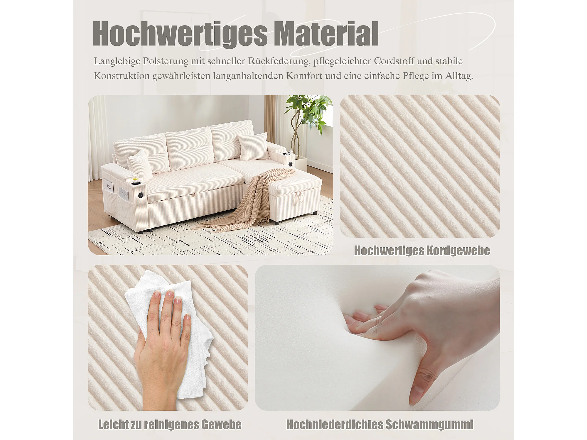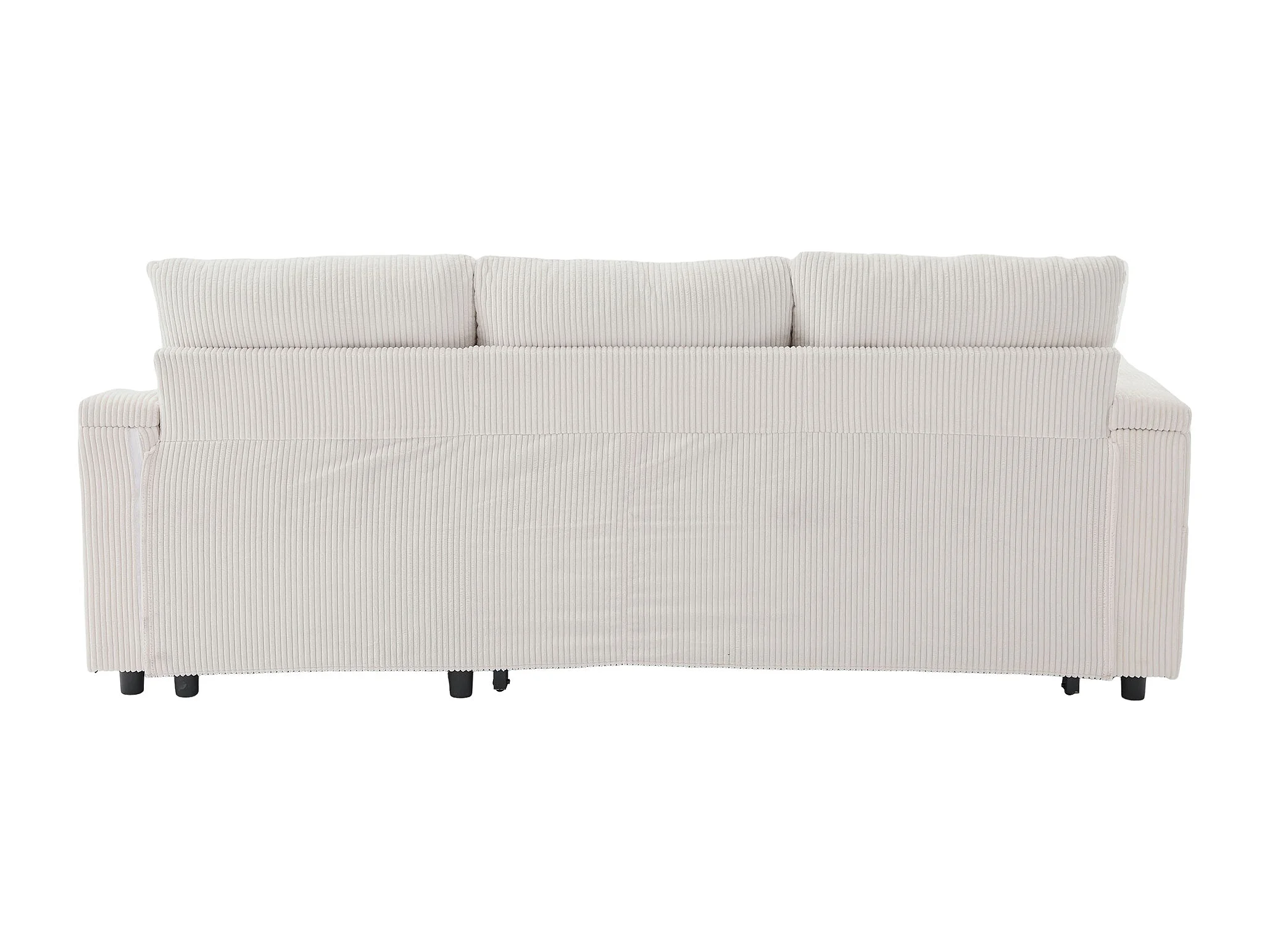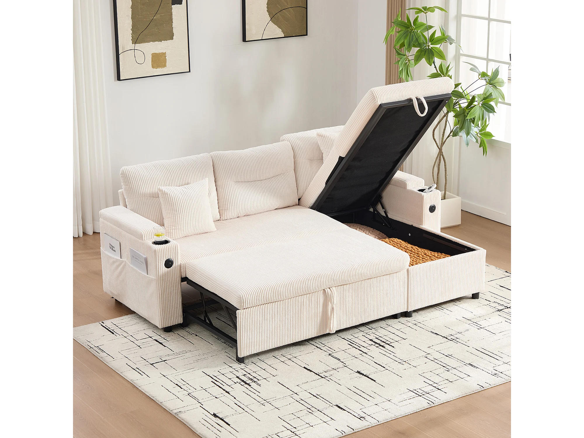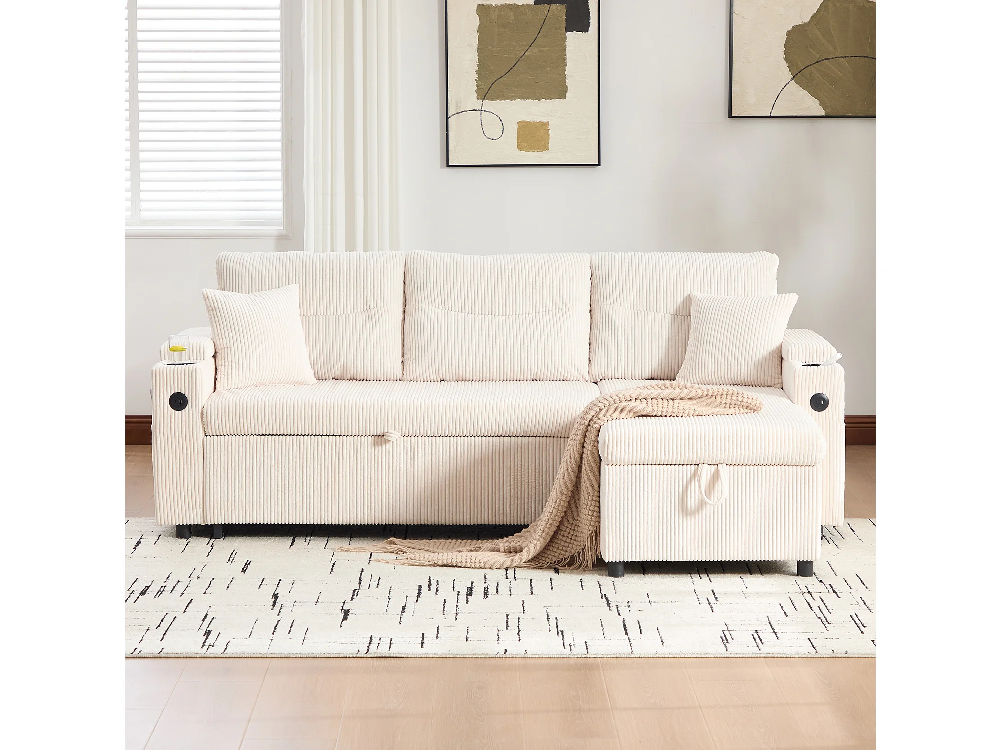 Canapé convertible 3 places en velours côtelé beige - Rangement, porte-gobelets et port USB-C