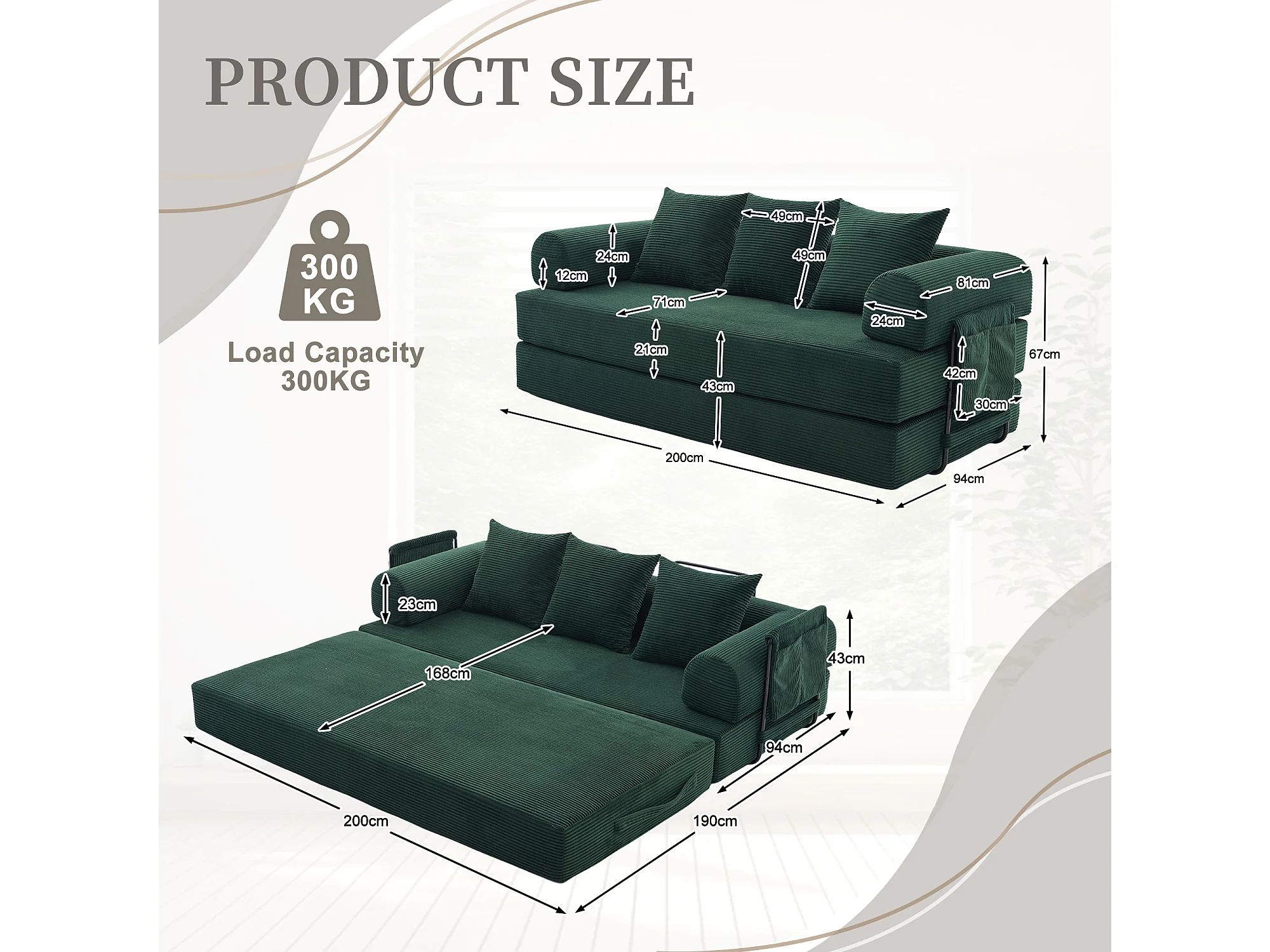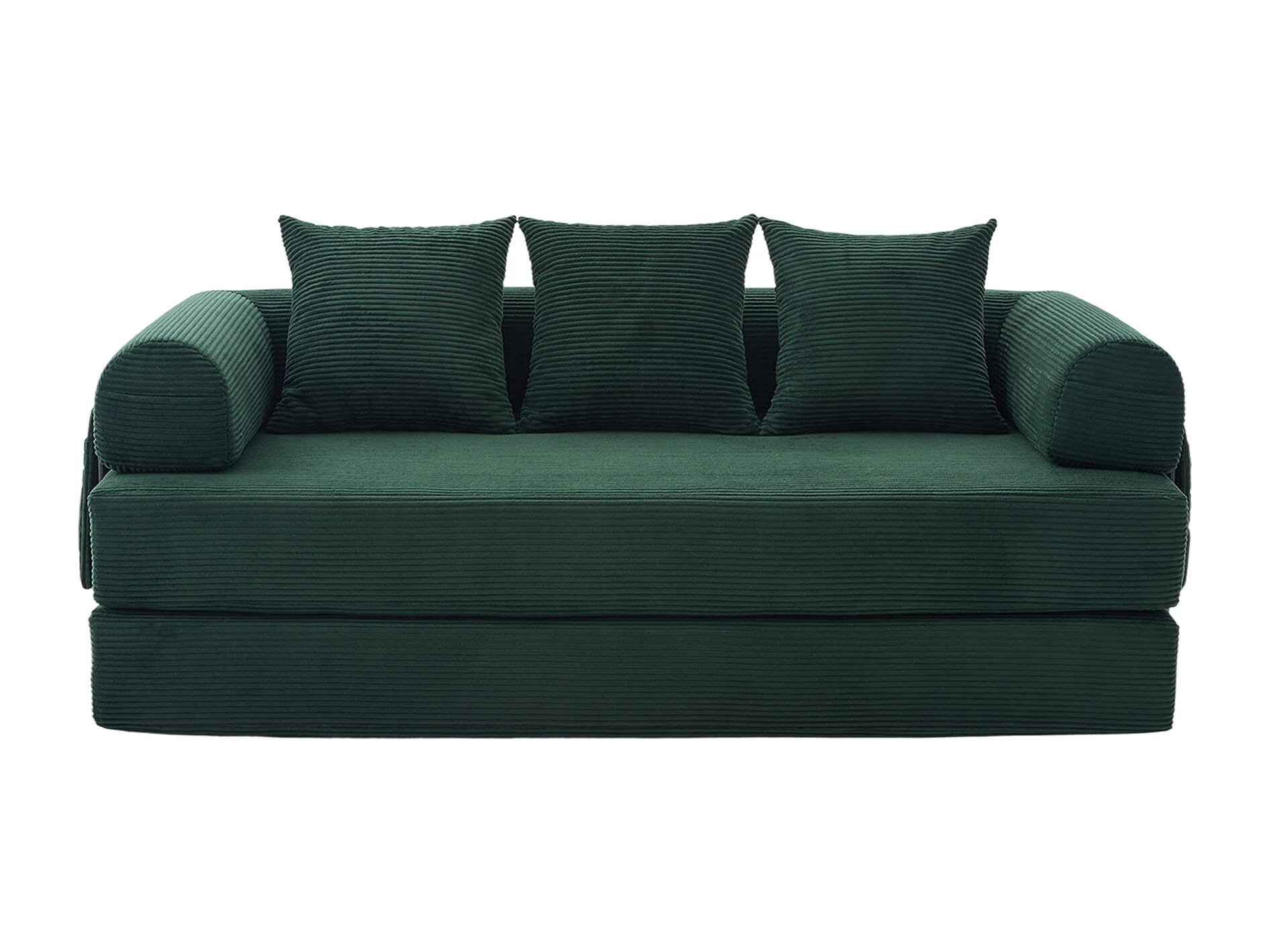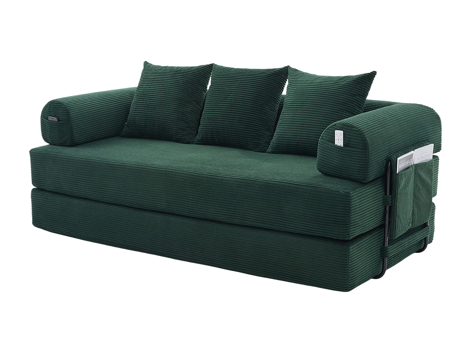 Canapé convertible 3 places modulable avec 3 coussins et poche latérale - Velours côtelé vert émeraude