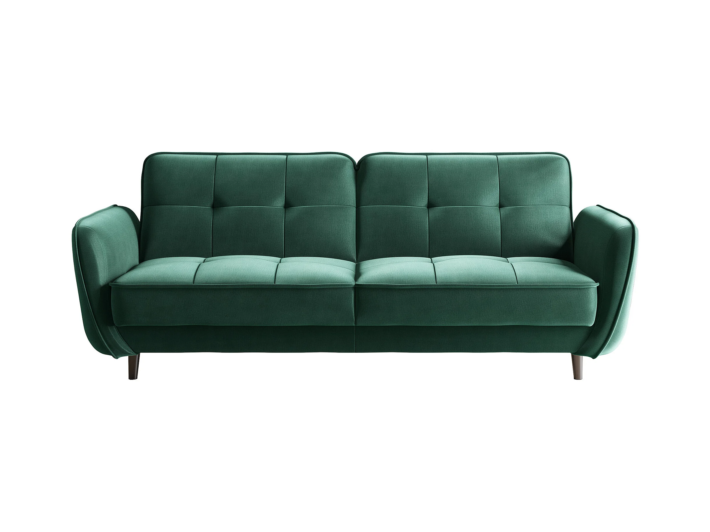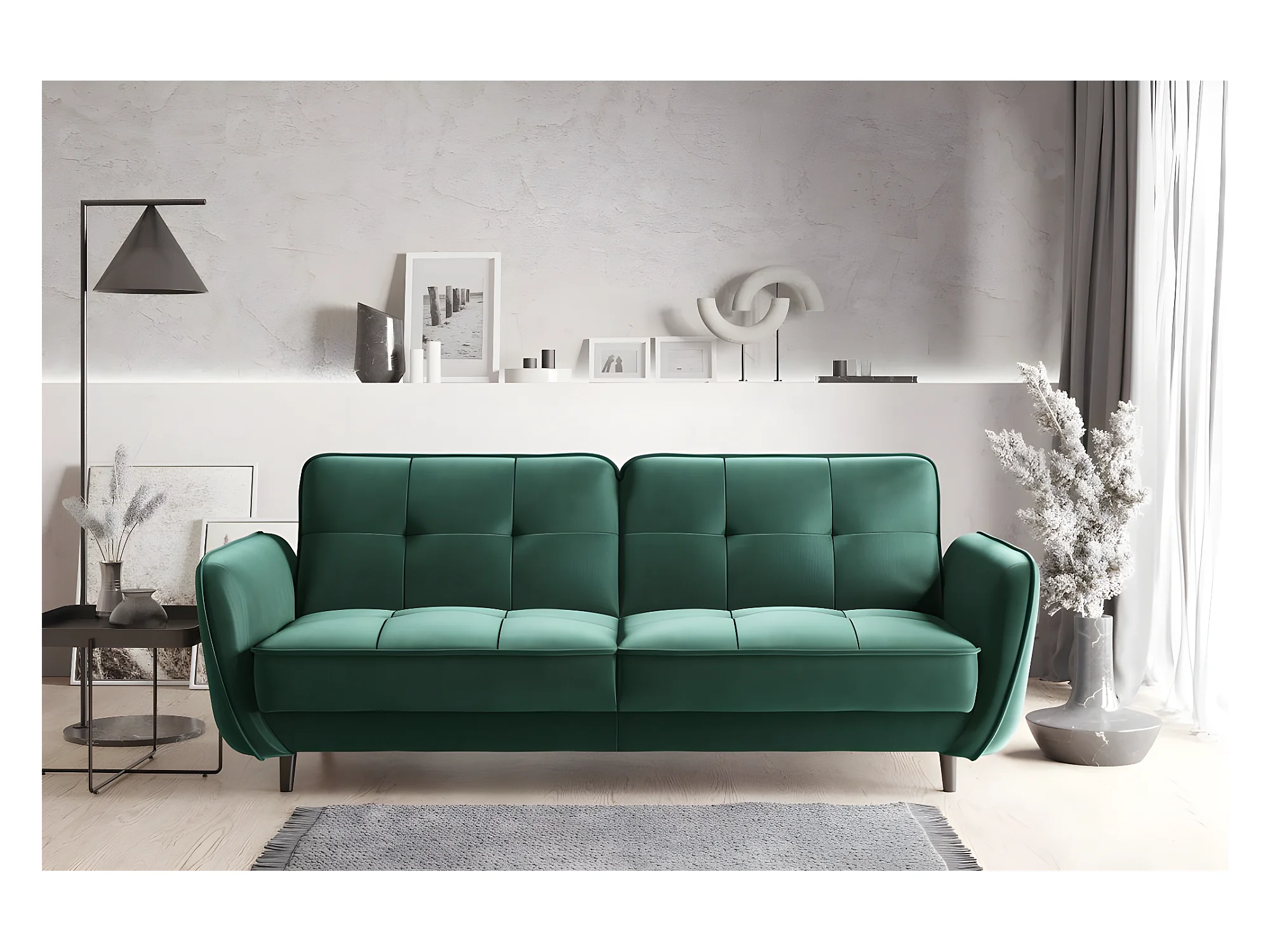 Canapé convertible 3 places tissu doux vert foncé capitonné et pieds bois noir Bizza 220cm