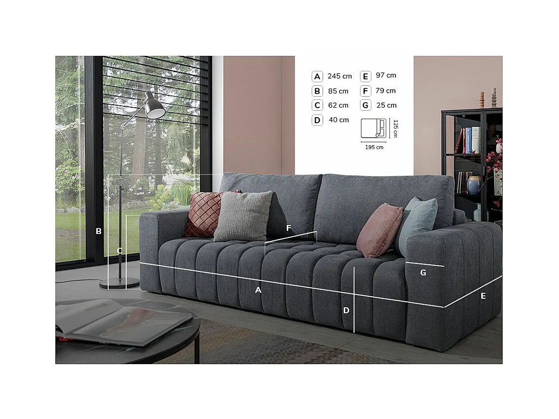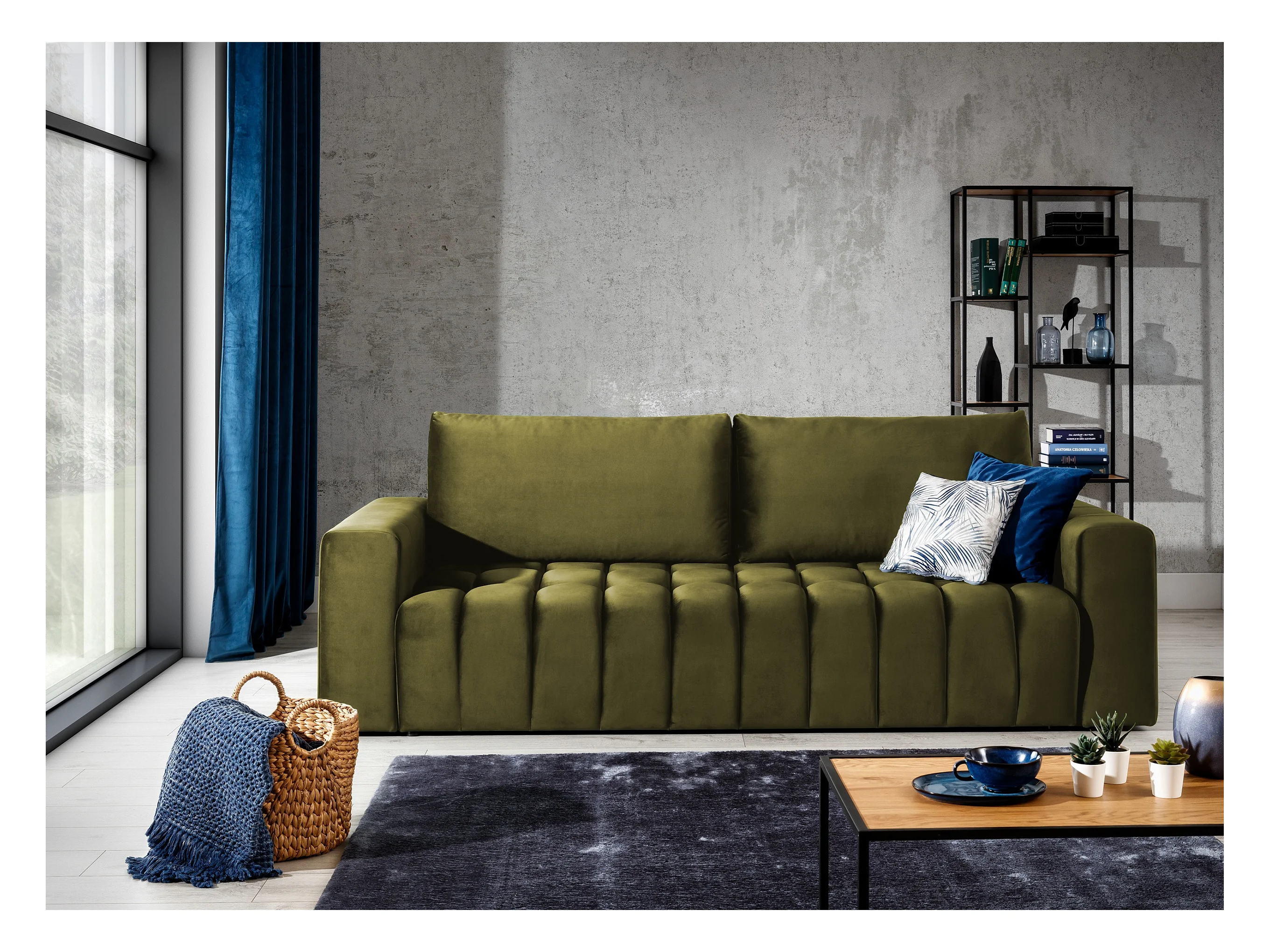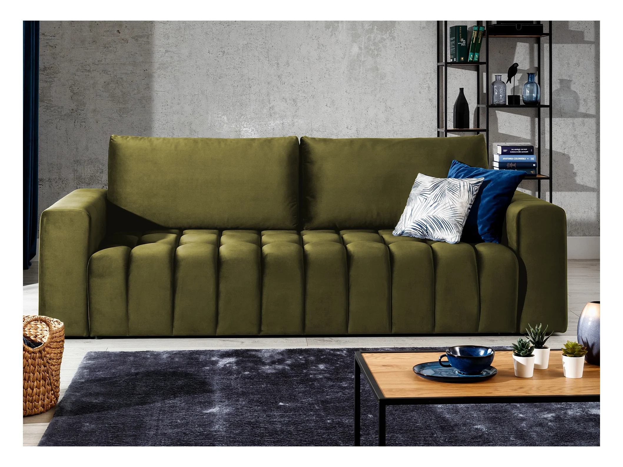 Canapé convertible 3 places tissu doux vert olive avec coffre de rangement Larko 245cm