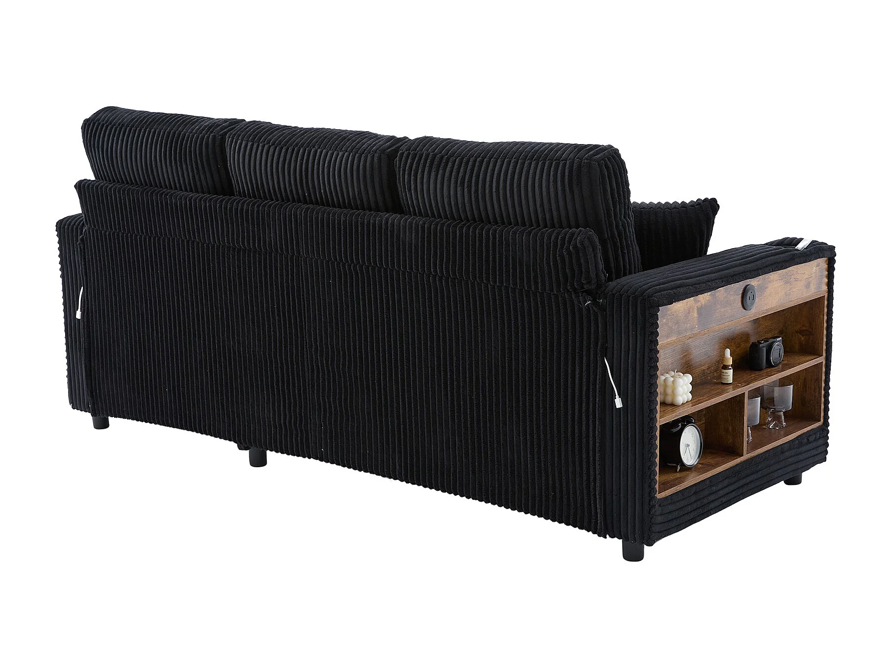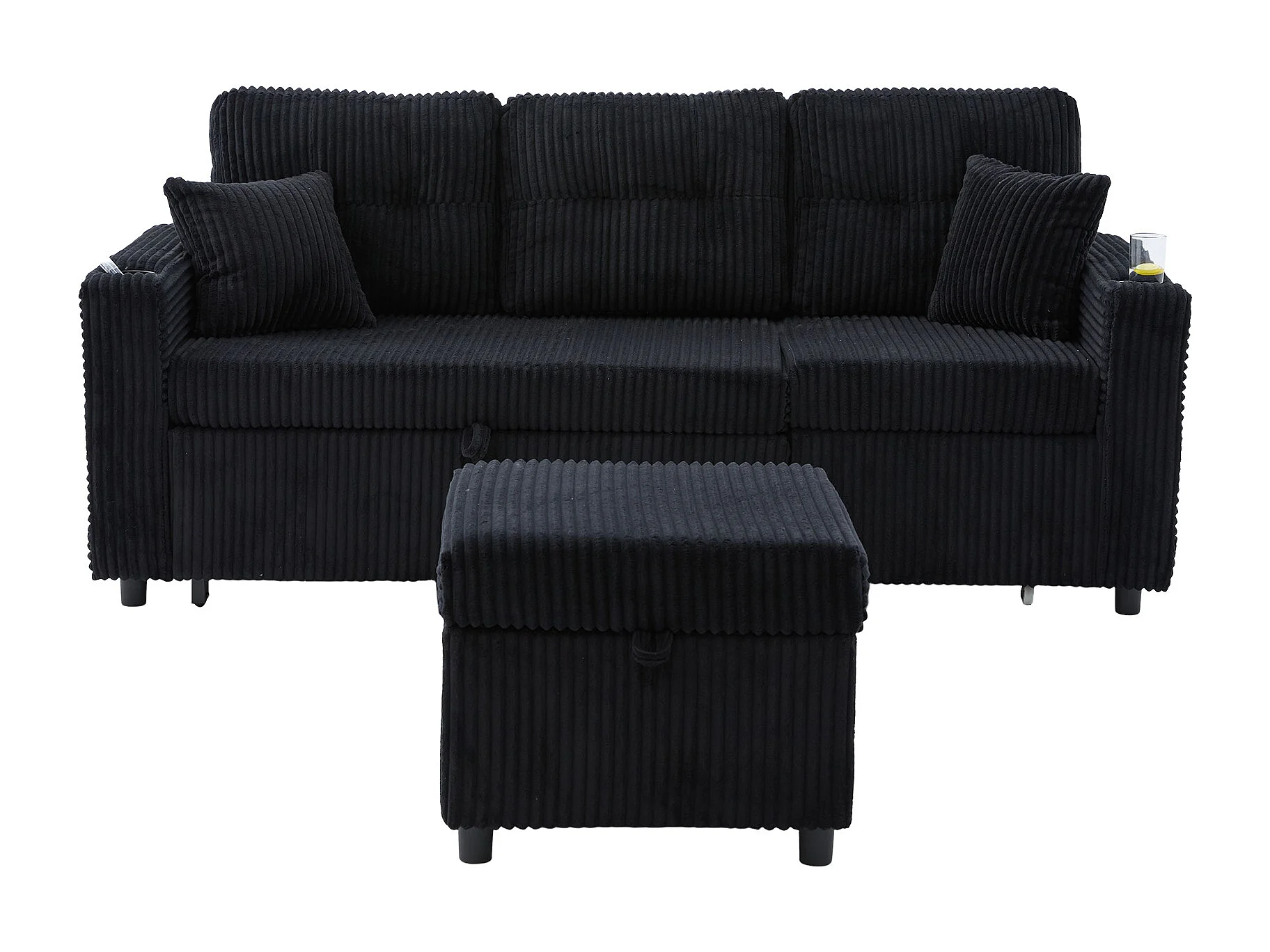 Canapé convertible, canapé 2 places avec LED, ports USB, pouf de rangement et tiroirs - velours côtelé noir