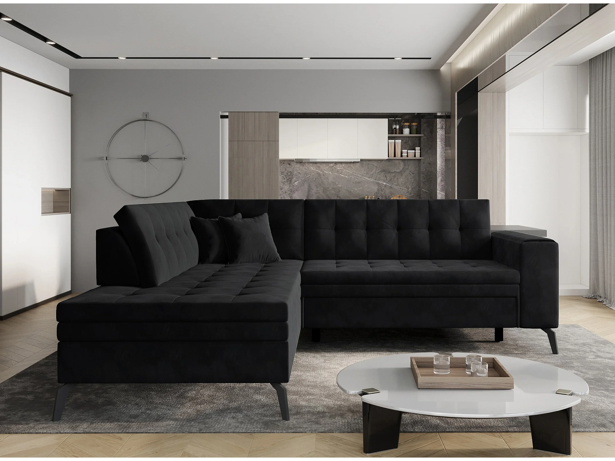 Canapé convertible capitonné angle gauche velours noir Larry 260cm