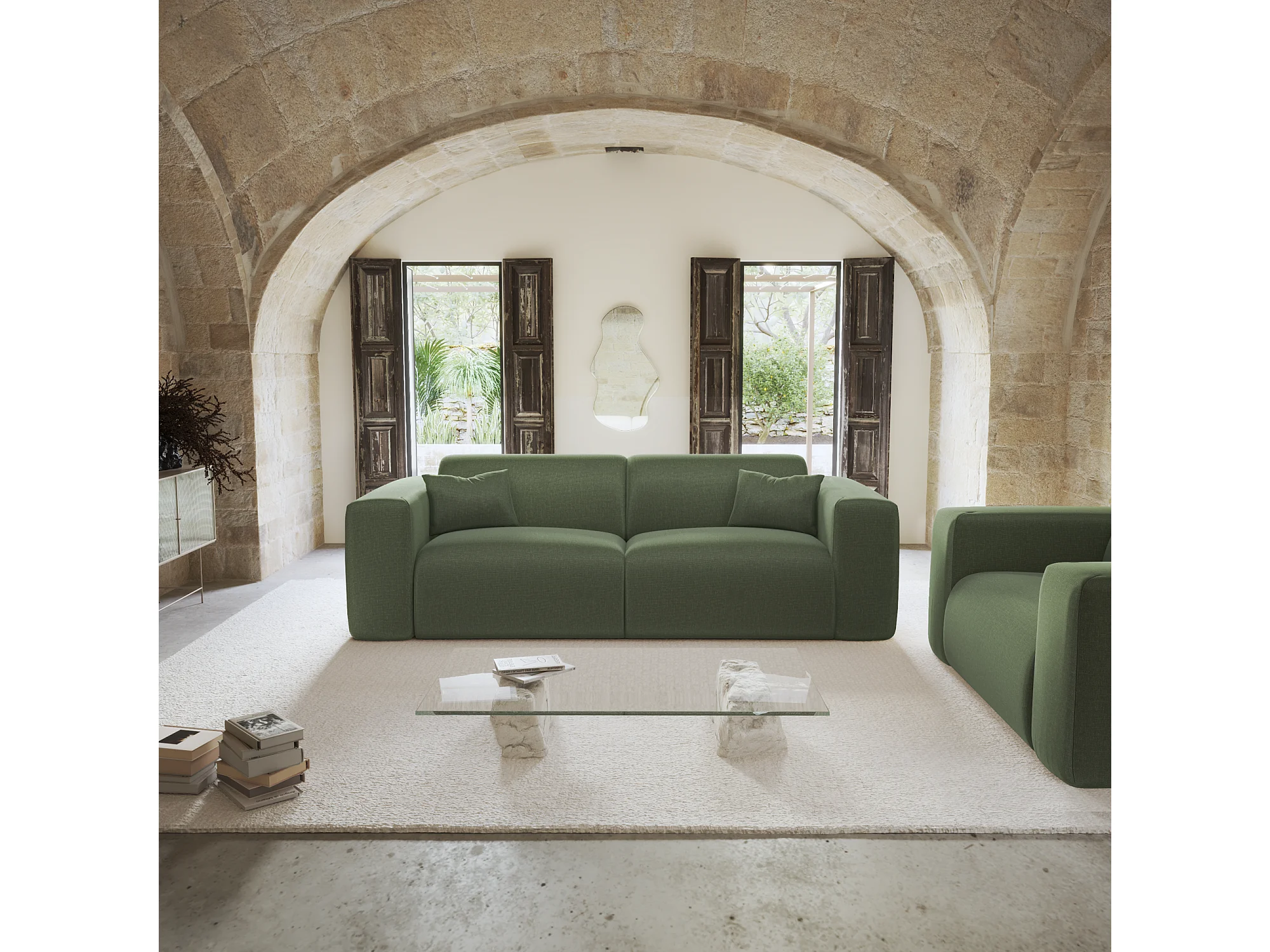 Canapé convertible express dunlopillo 160cm tissu tramé vert olive MYRA